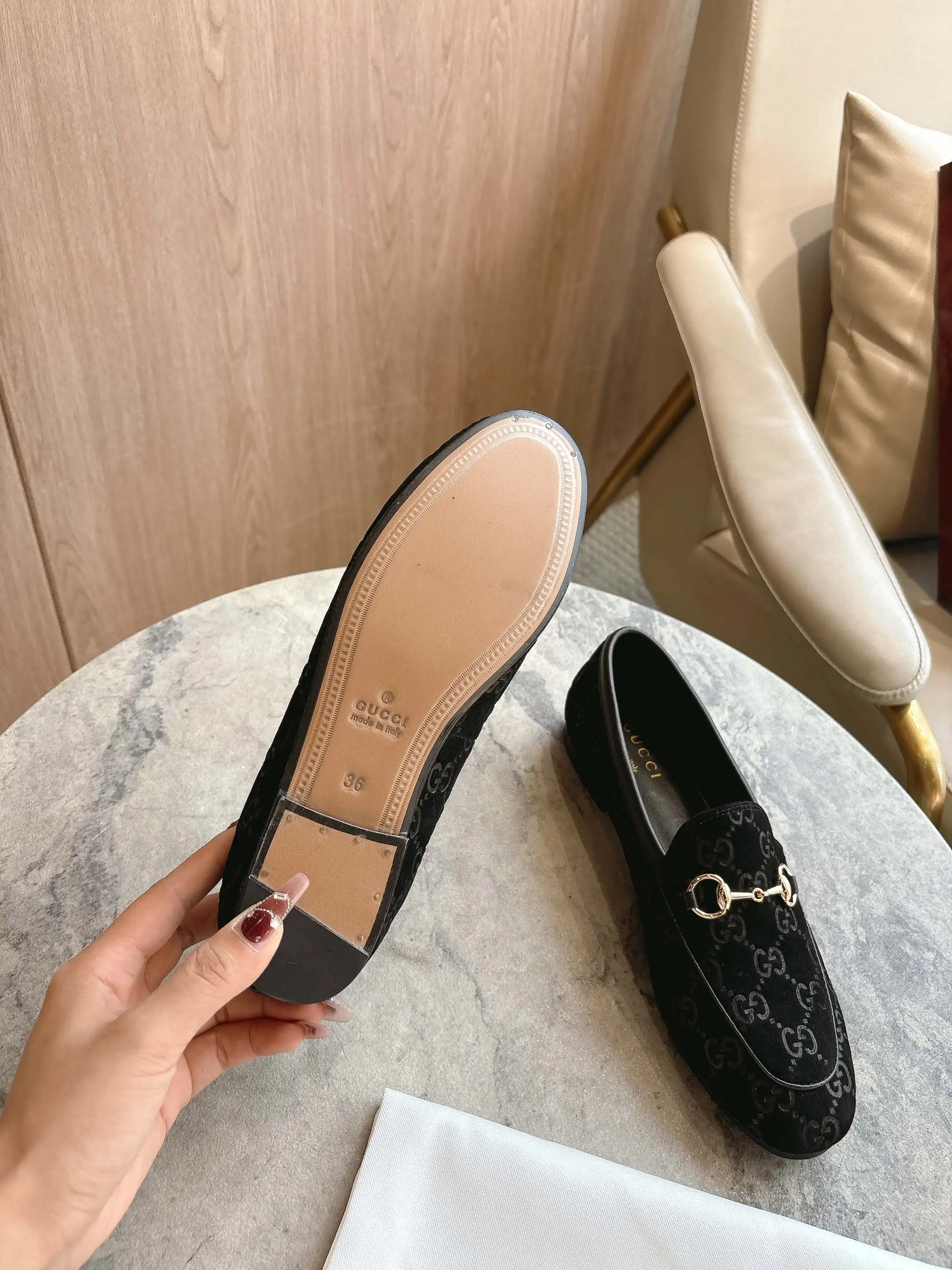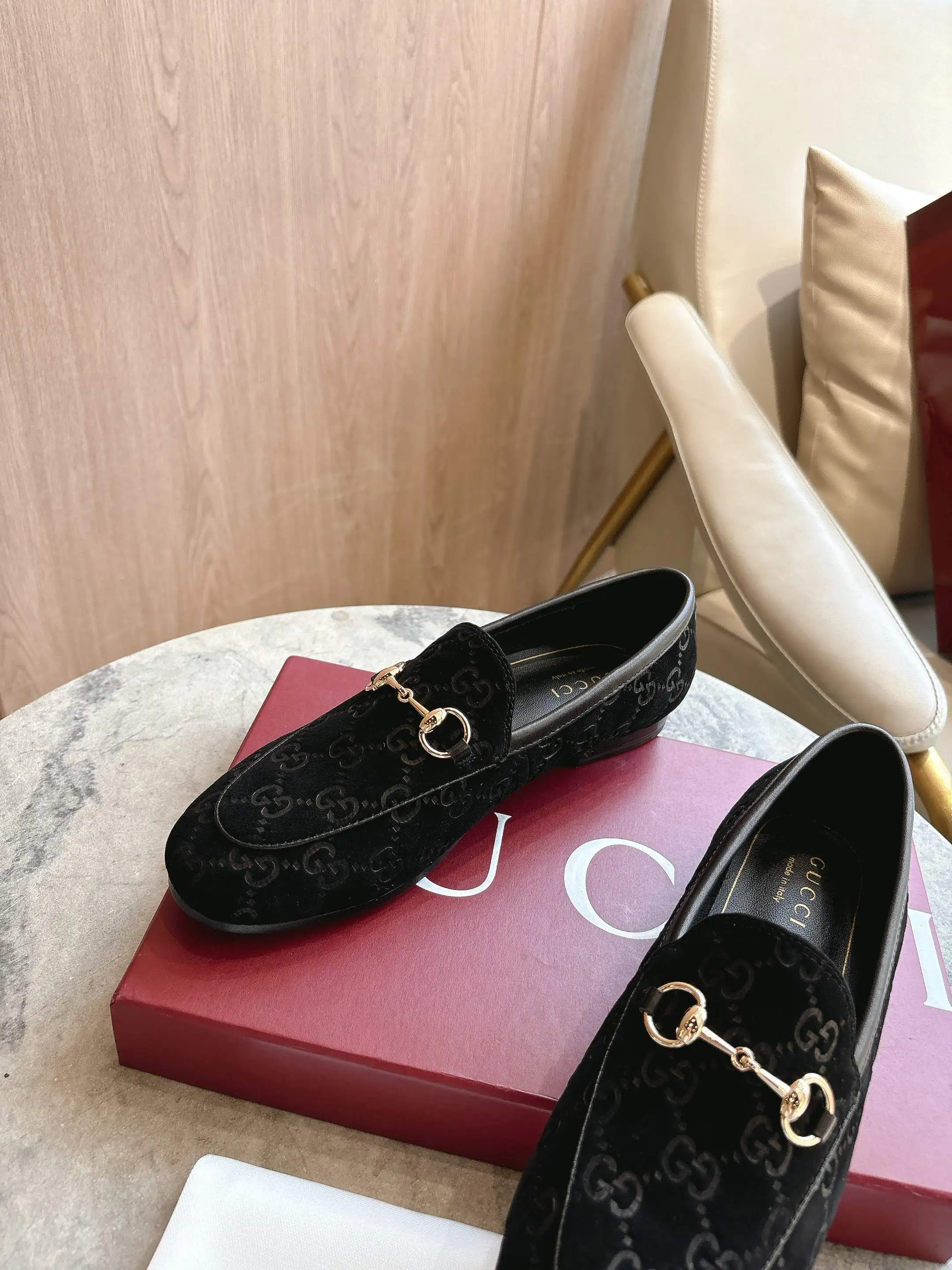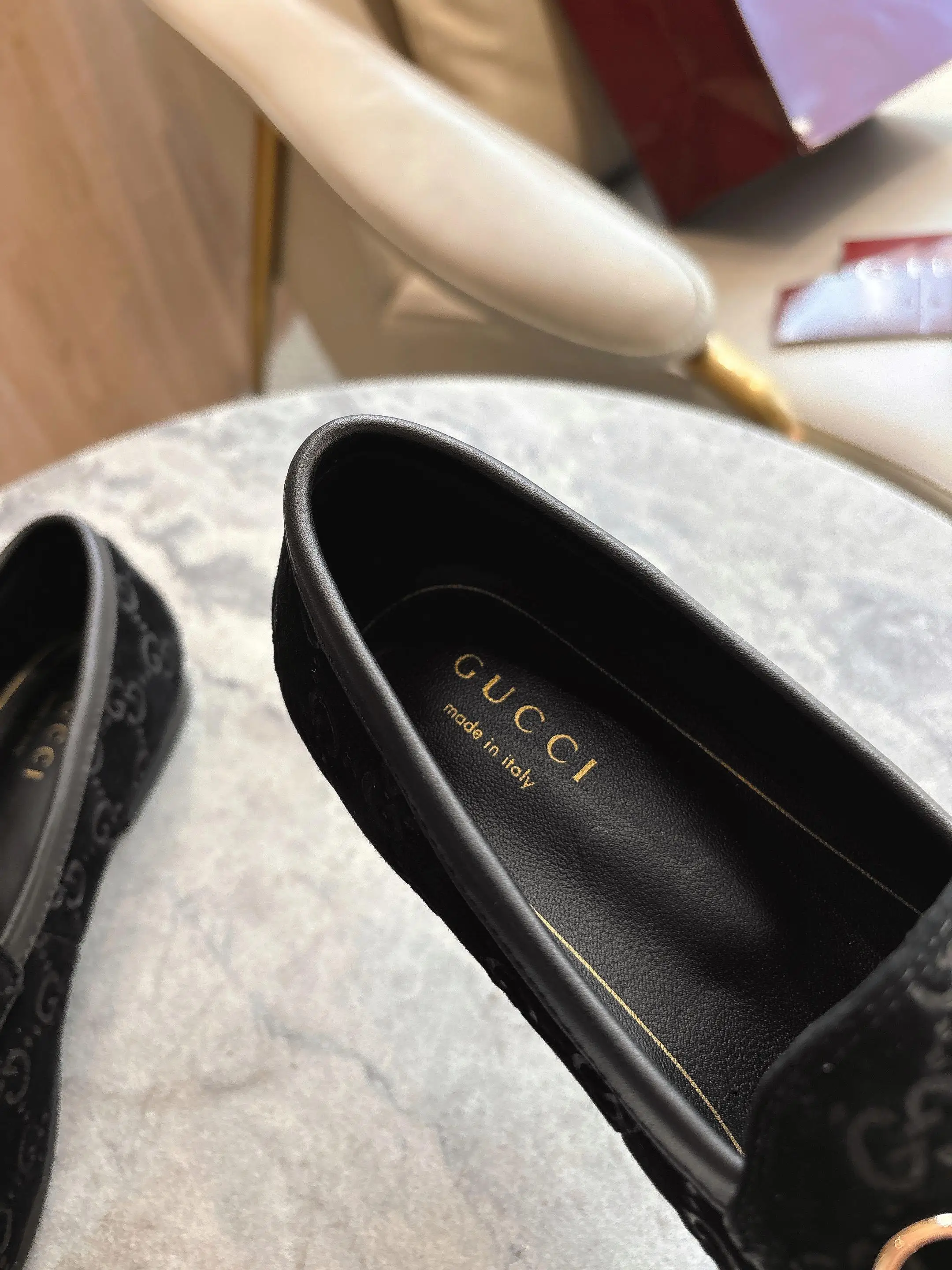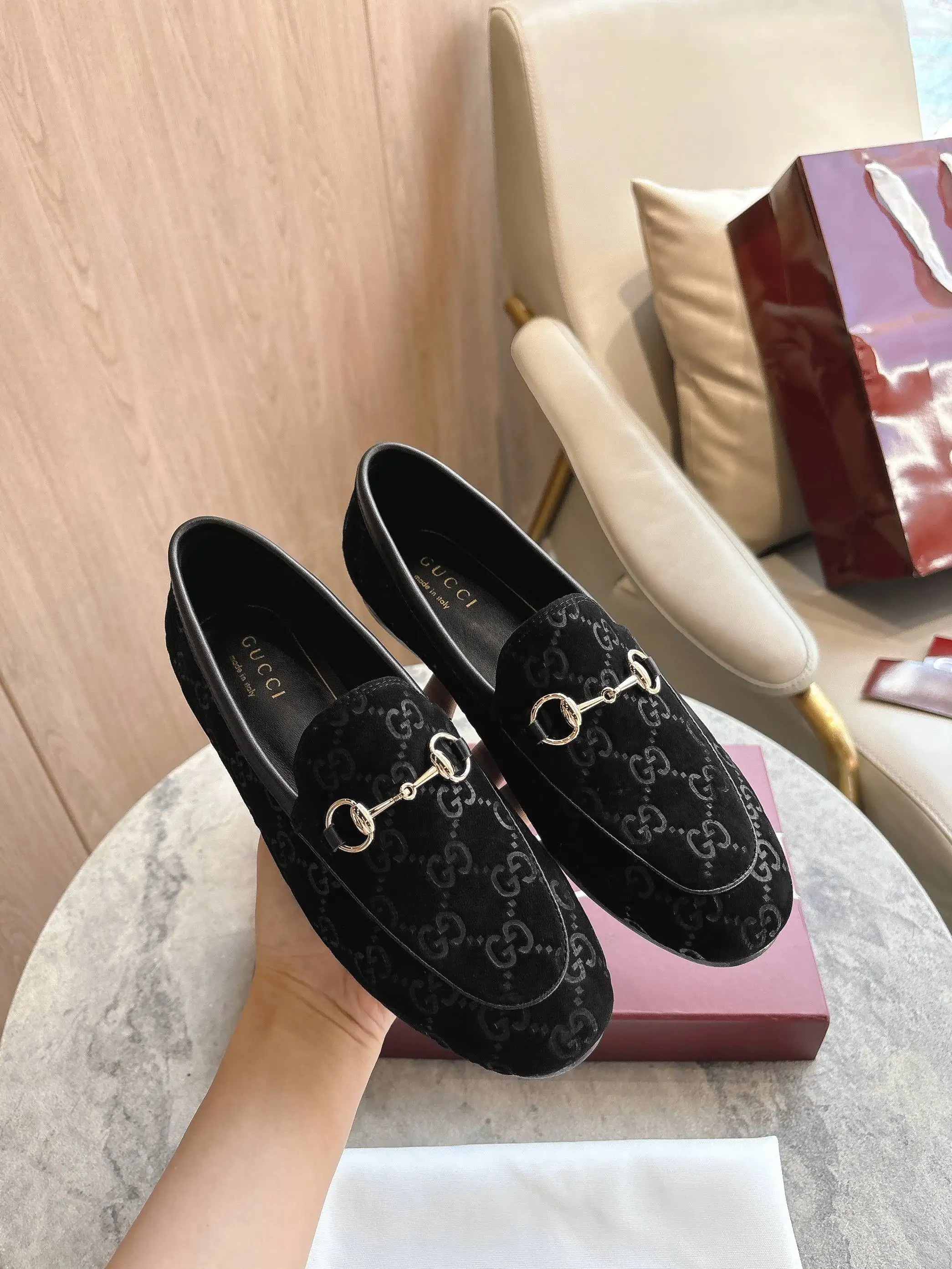 1819-10* 黑 35-42 作为Gucci设计传承的杰出代表 Jordaan系列饰马衔扣乐福鞋生动彰显经典优雅格调 这款鞋履采用品牌标志性字母交织图案光滑绒面材质 成就隽永经典 这款鞋履材质柔软 廓形精致流畅 彰显日常优雅风范
