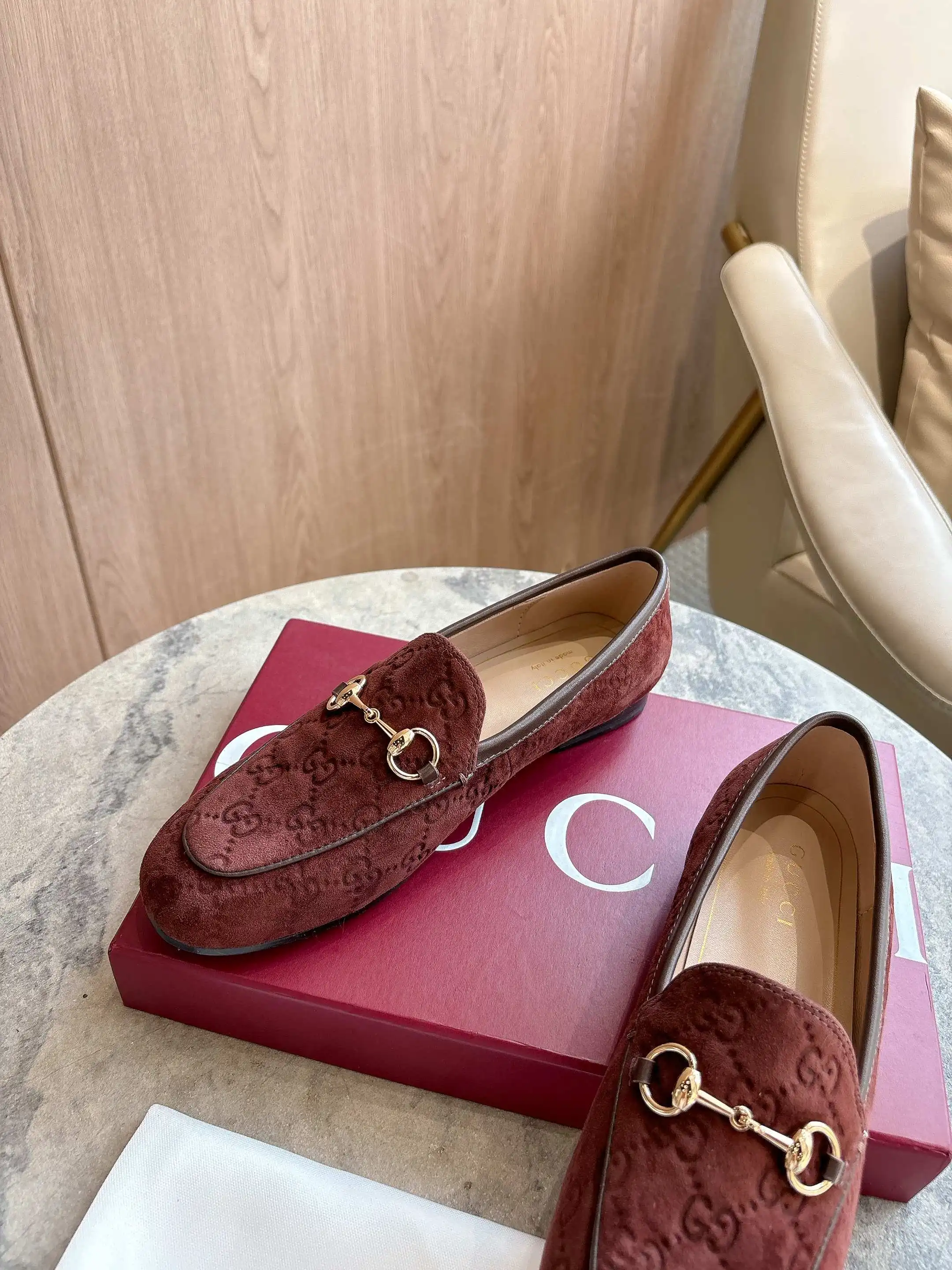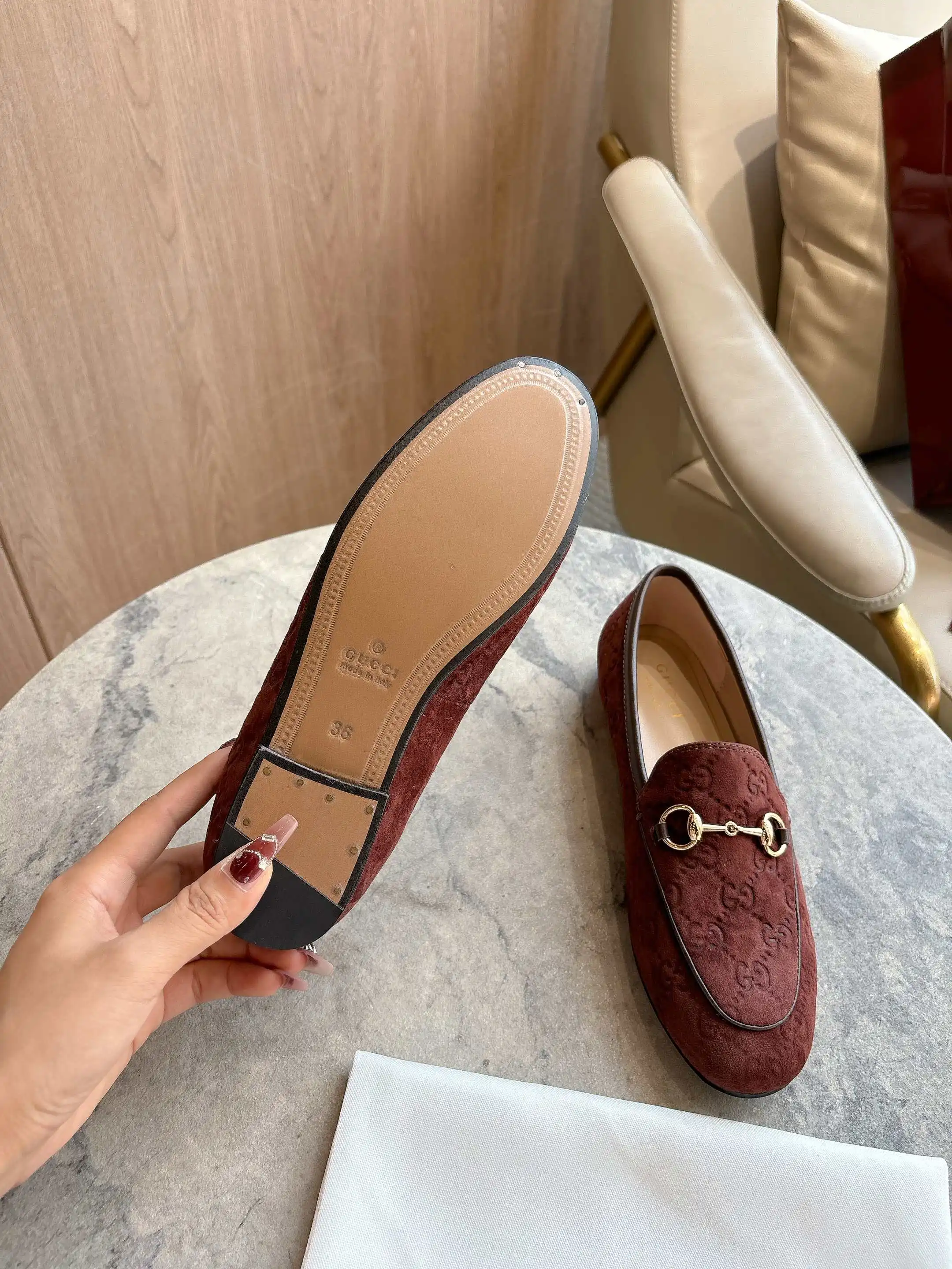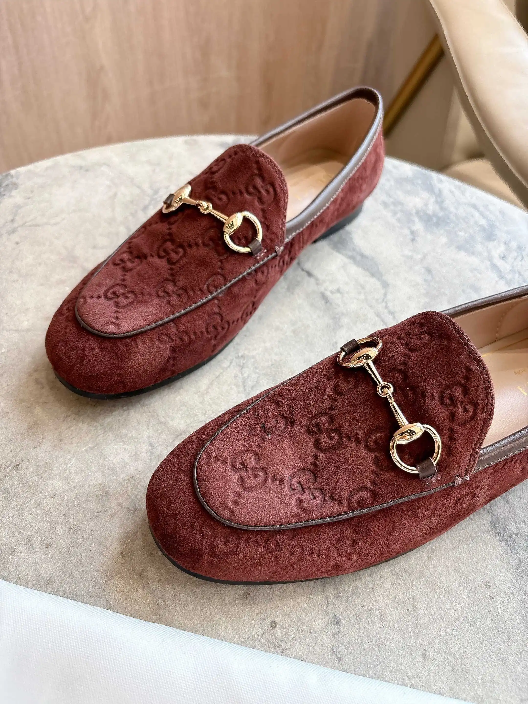 1819-10* 咖啡 35-42 作为Gucci设计传承的杰出代表 Jordaan系列饰马衔扣乐福鞋生动彰显经典优雅格调 这款鞋履采用品牌标志性字母交织图案光滑绒面材质 成就隽永经典 这款鞋履材质柔软 廓形精致流畅 彰显日常优雅风范