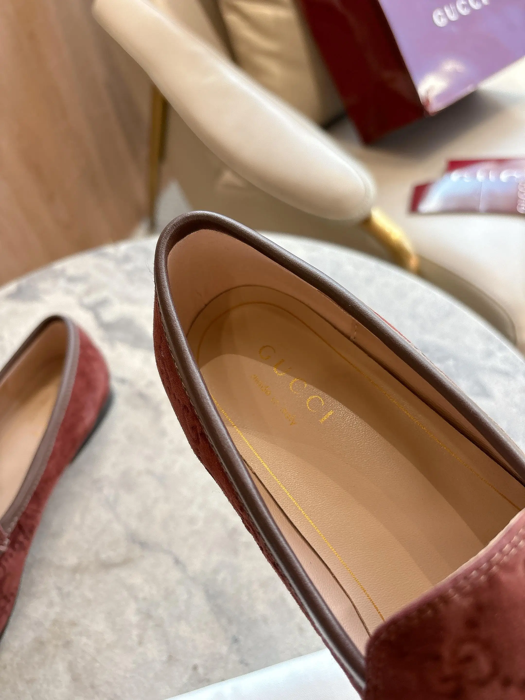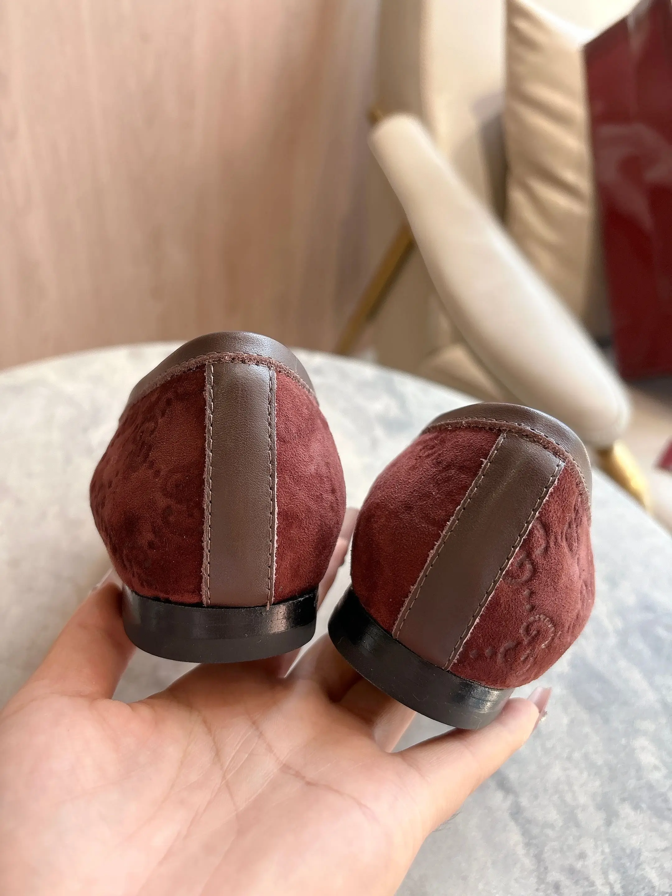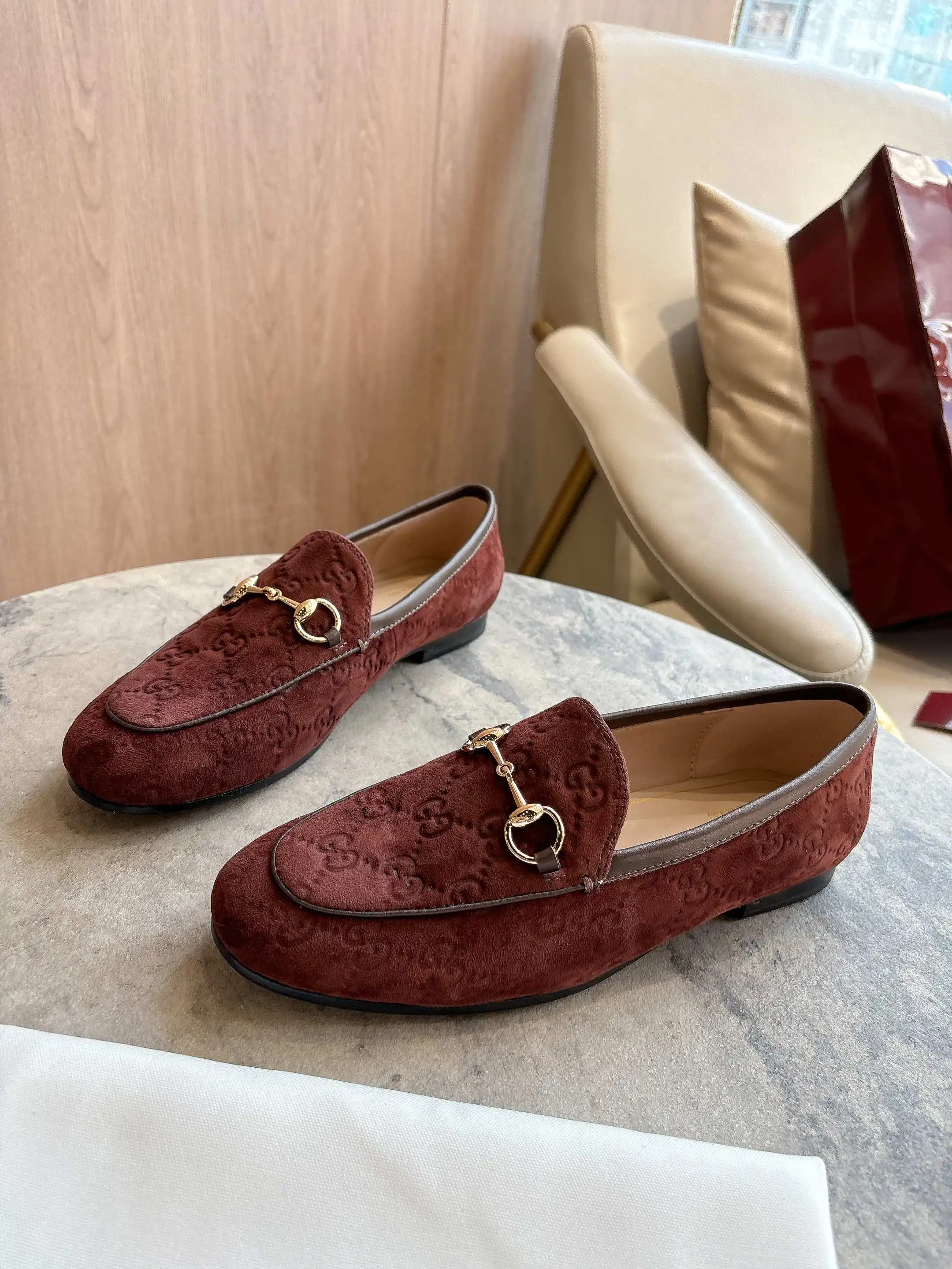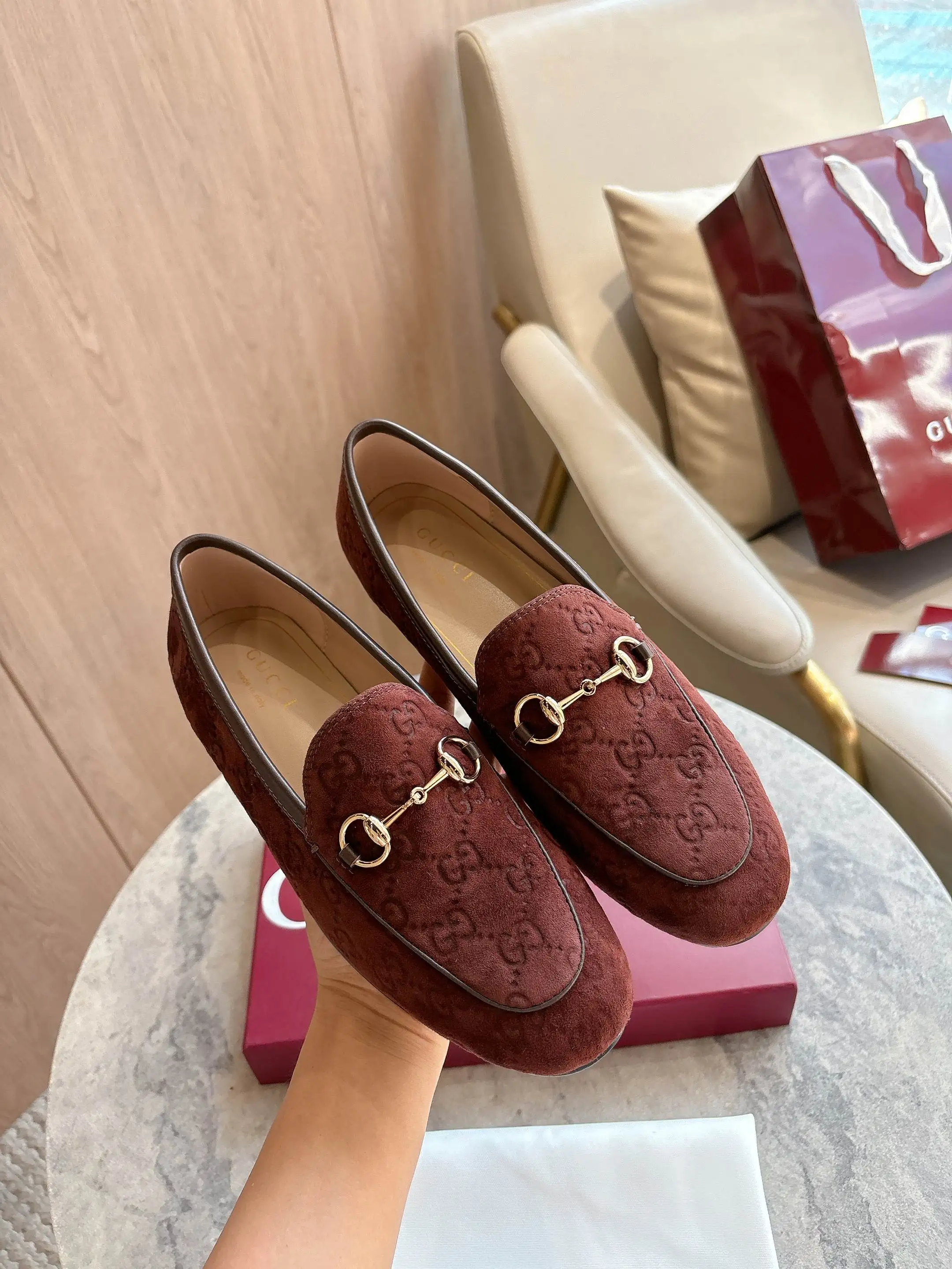 1819-10* 咖啡 35-42 作为Gucci设计传承的杰出代表 Jordaan系列饰马衔扣乐福鞋生动彰显经典优雅格调 这款鞋履采用品牌标志性字母交织图案光滑绒面材质 成就隽永经典 这款鞋履材质柔软 廓形精致流畅 彰显日常优雅风范