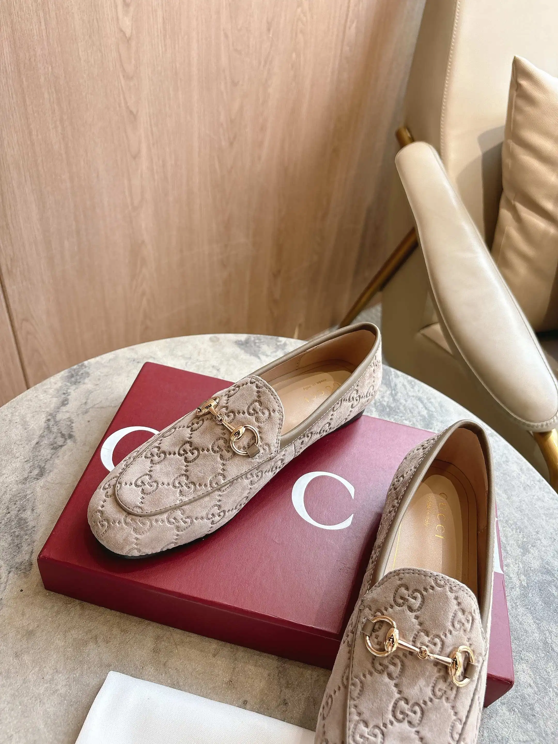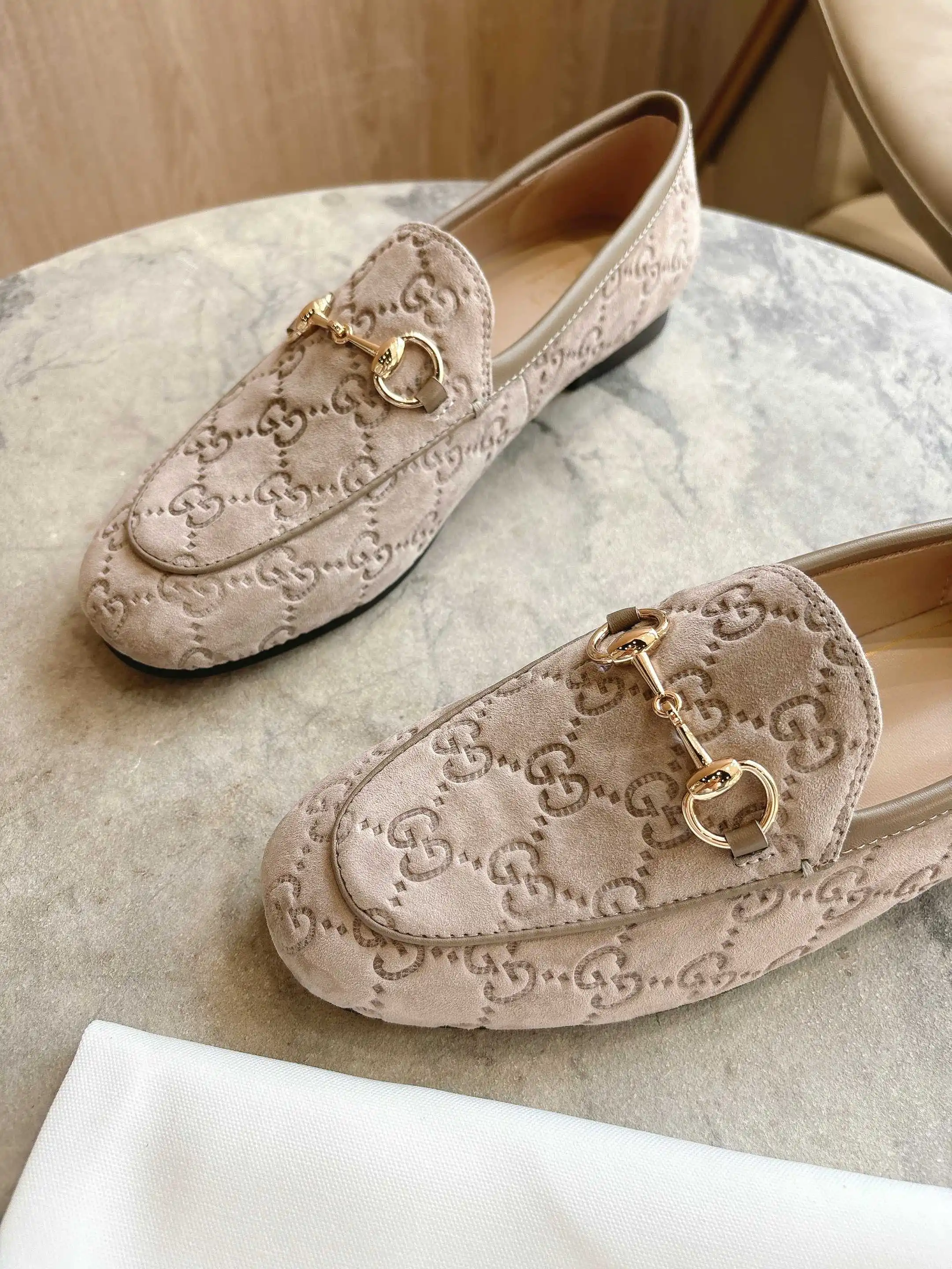 1819-10* 灰 35-42 作为Gucci设计传承的杰出代表 Jordaan系列饰马衔扣乐福鞋生动彰显经典优雅格调 这款鞋履采用品牌标志性字母交织图案光滑绒面材质 成就隽永经典 这款鞋履材质柔软 廓形精致流畅 彰显日常优雅风范