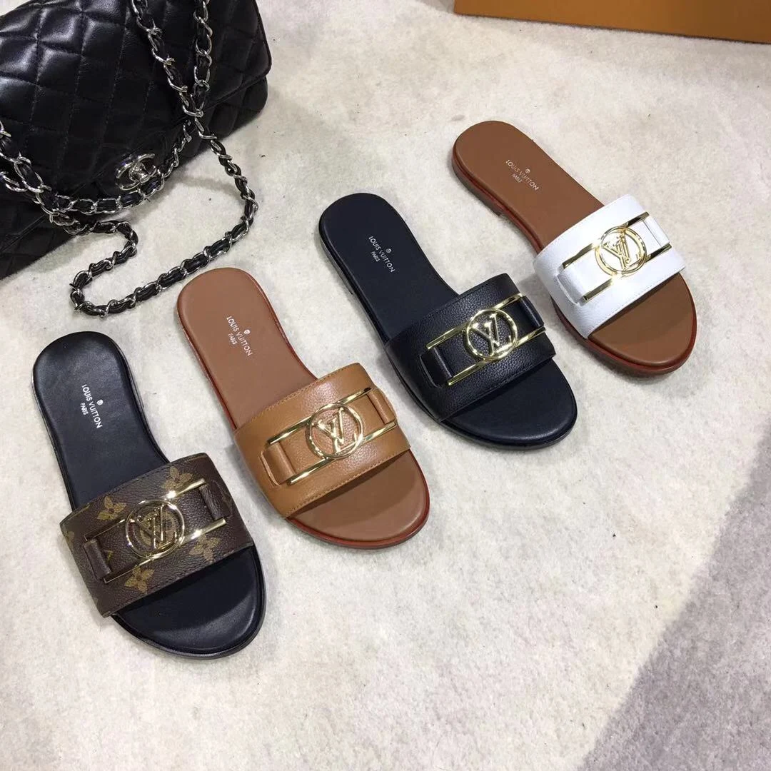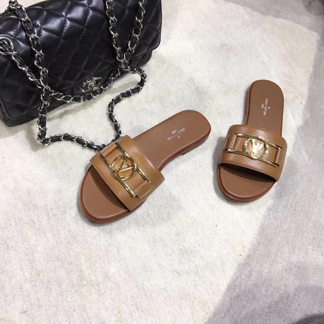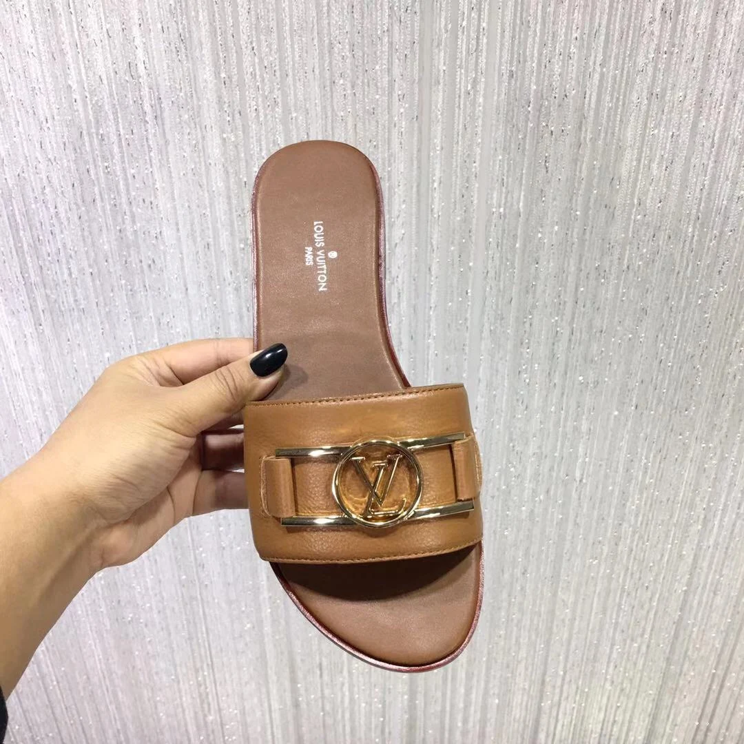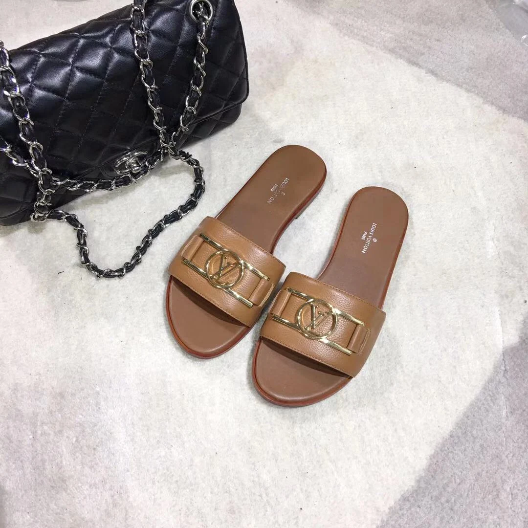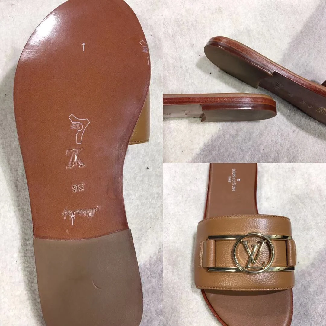 LV 女士老花荔枝纹头层牛皮拖鞋