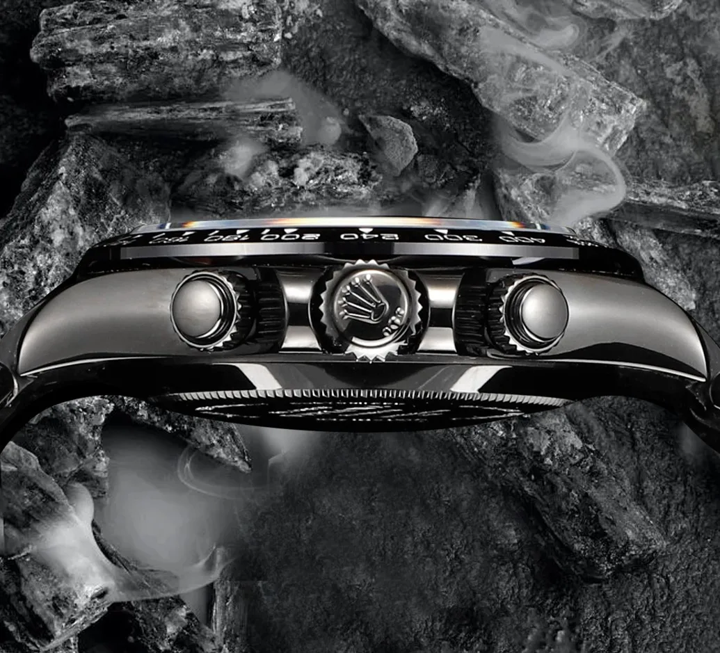 超薄升级12.3mm最新第四代迪通拿精钢全黑款 最新碳黑真空电镀复刻版40mm高端品质实拍 全黑钢迪通拿 采用改良版最新机芯 非市面13.5mm普通壳壳套 真皮表带或胶带或精钢表带 出厂配套原厂收纳箱 附带工具真头粒皮带一套 精彩细节 1 新款黑精钢迪通拿主要有三个变化 分别在表盘刻度 指针颜色和表壳材质 2 表壳 表带采用904L精钢材质打磨 每个壳套全程CNC处理所有细节 再经过人工流程润饰 打磨和检测做工精细 3 机芯采用稳定Cal改良版最新一代一档7750超薄机芯机械 计时功能与专柜同步 表带配备防止意外打开的可调节蚝式保险扣 这高雅的实心链结表带 佩戴舒适 操作也十分简便