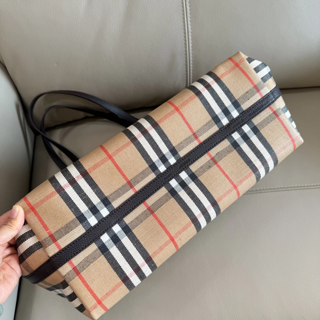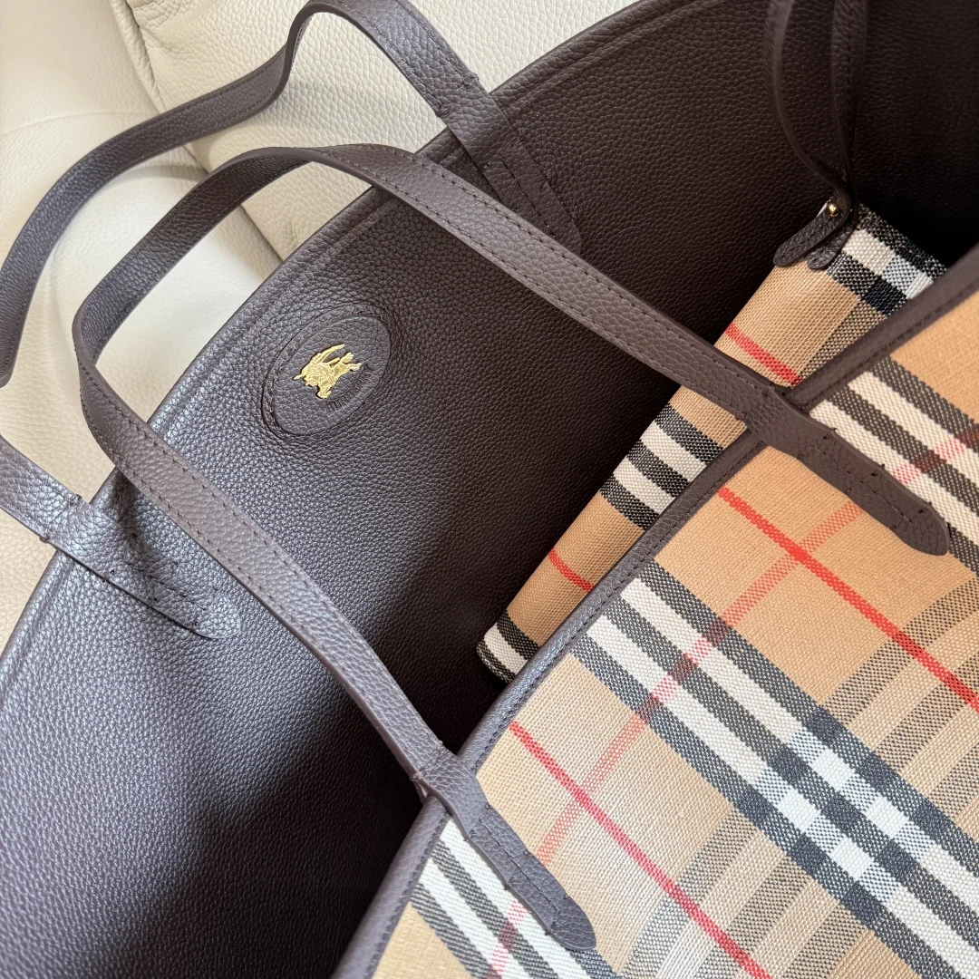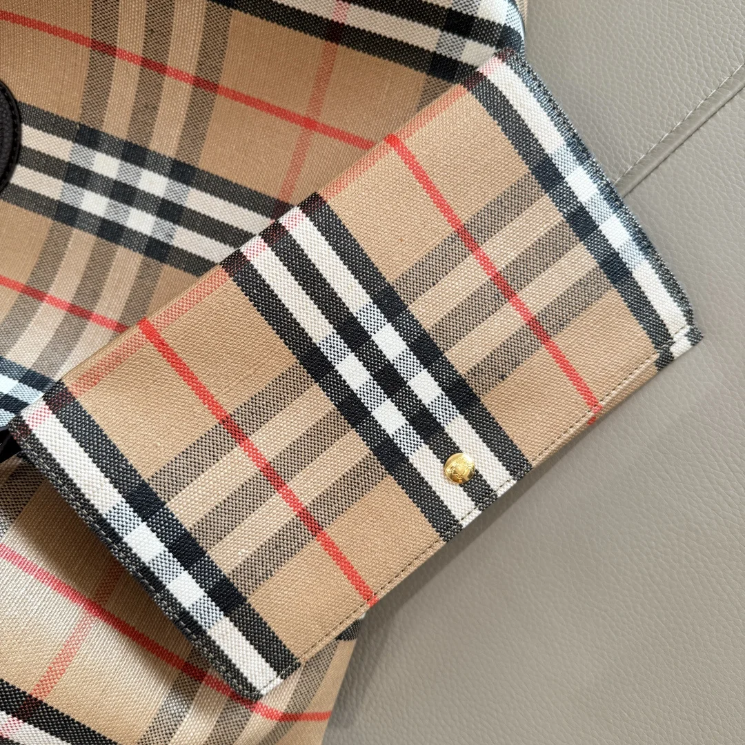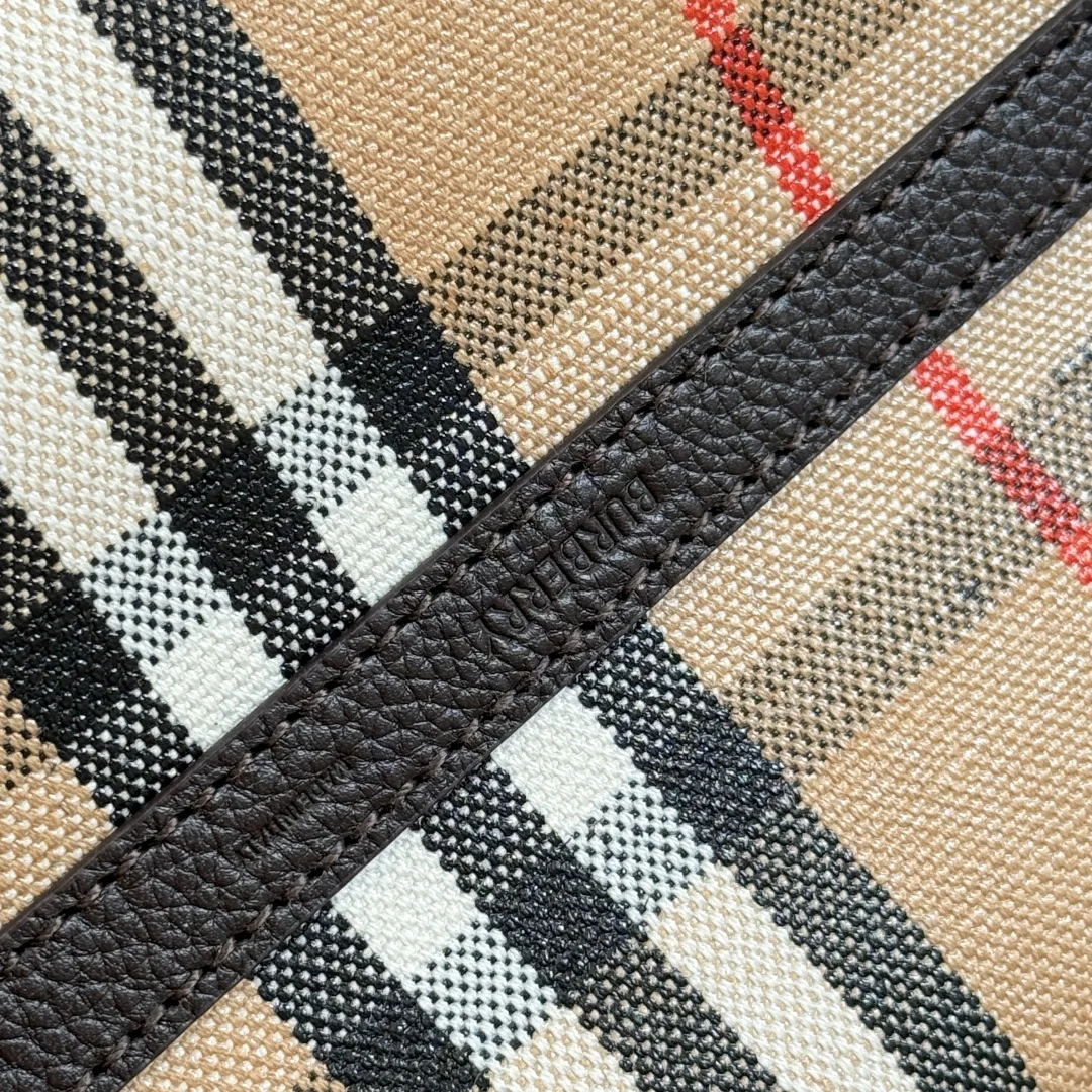 选用粒纹小牛皮材质打造 于意大利工坊精制而成 反面为 Burberry 格纹棉质亚麻混纺 面料 以标志性沙米色演绎 出自品牌 Bloomsbury 系列 点缀牛皮拼金属時士印章 源自 1980年代品牌包款的典藏圏案 随附可拆式按扣收纳袋 适合存放小件物品 尺寸37.5x17x30cm型号6061