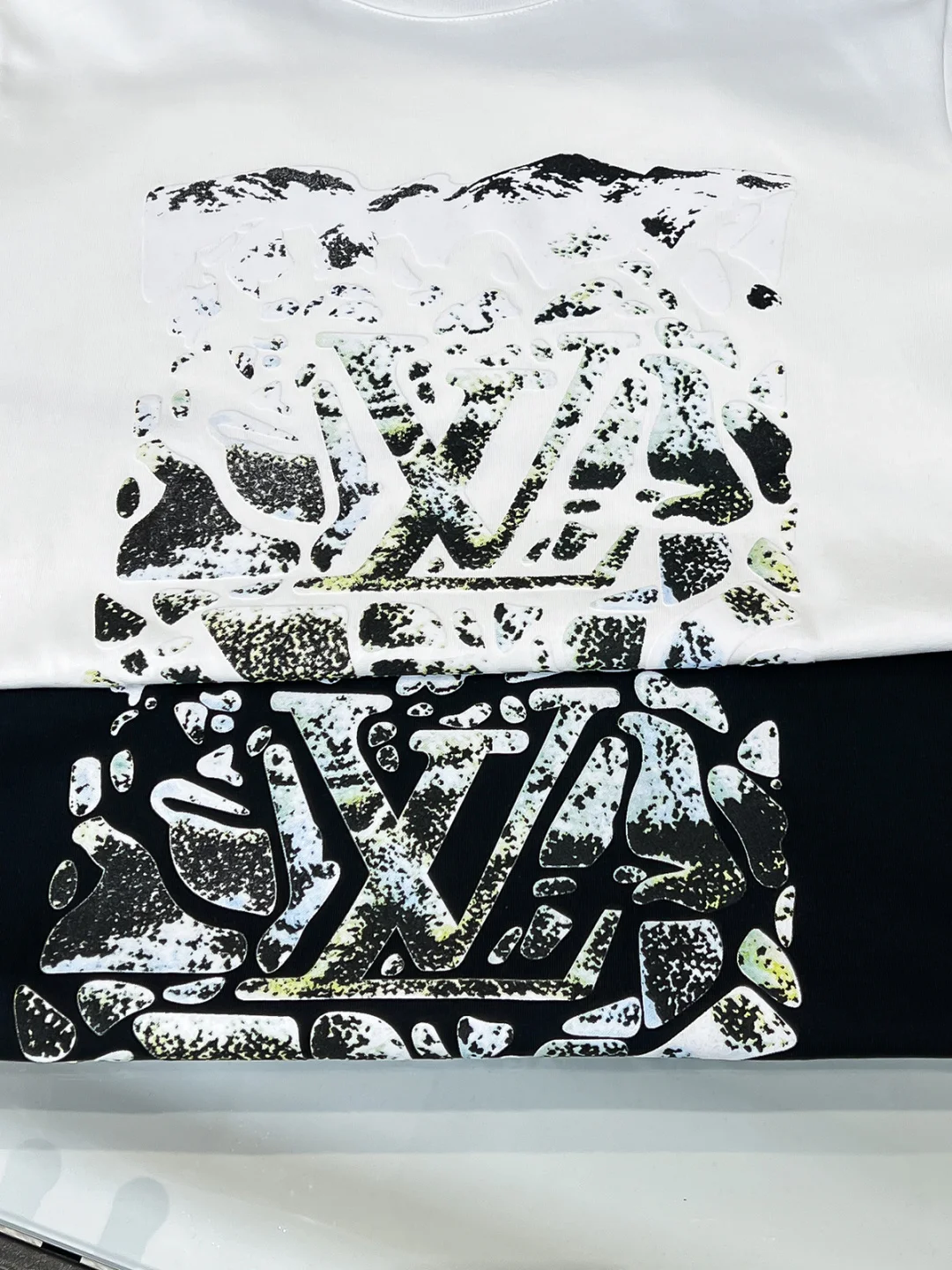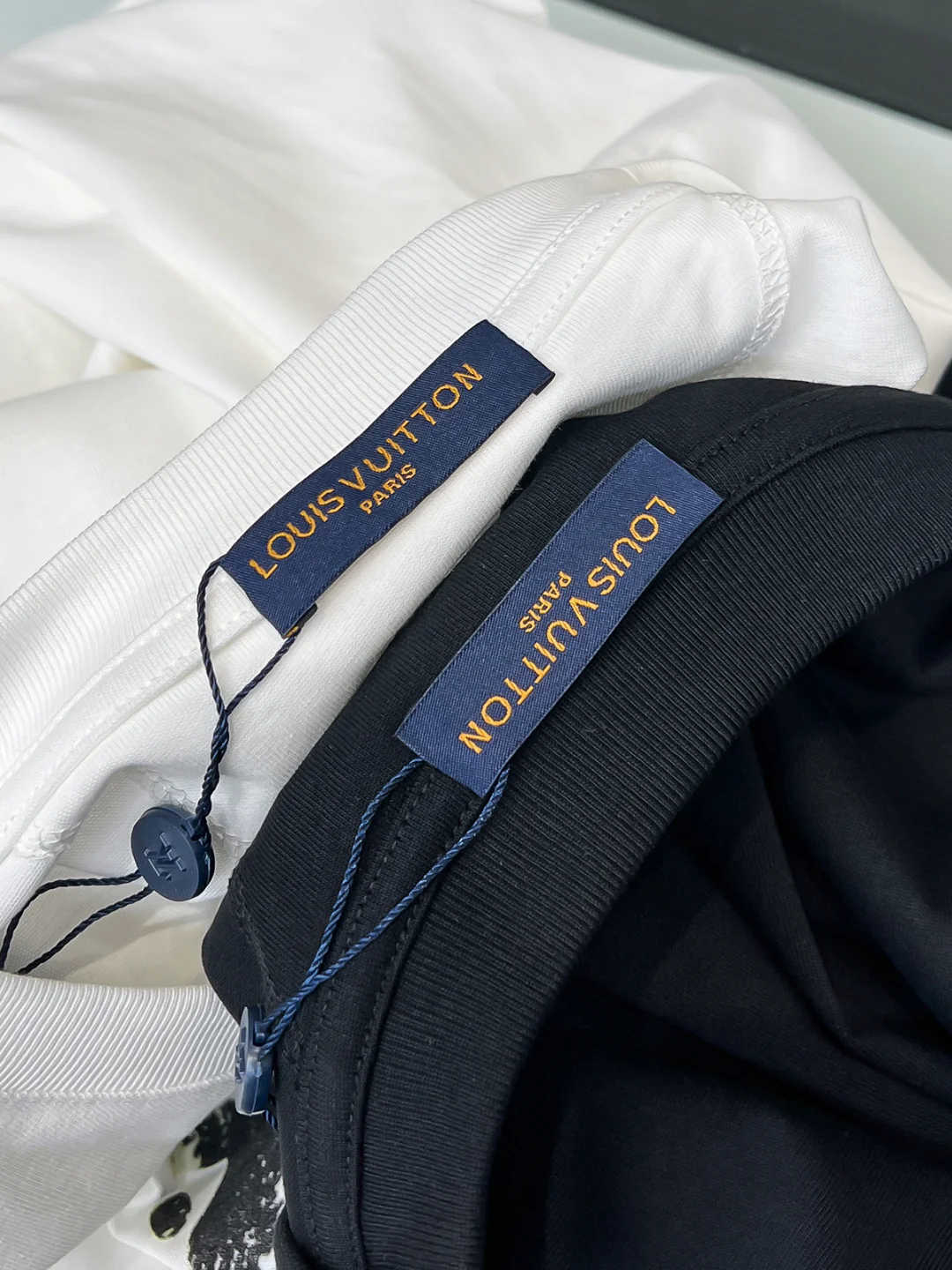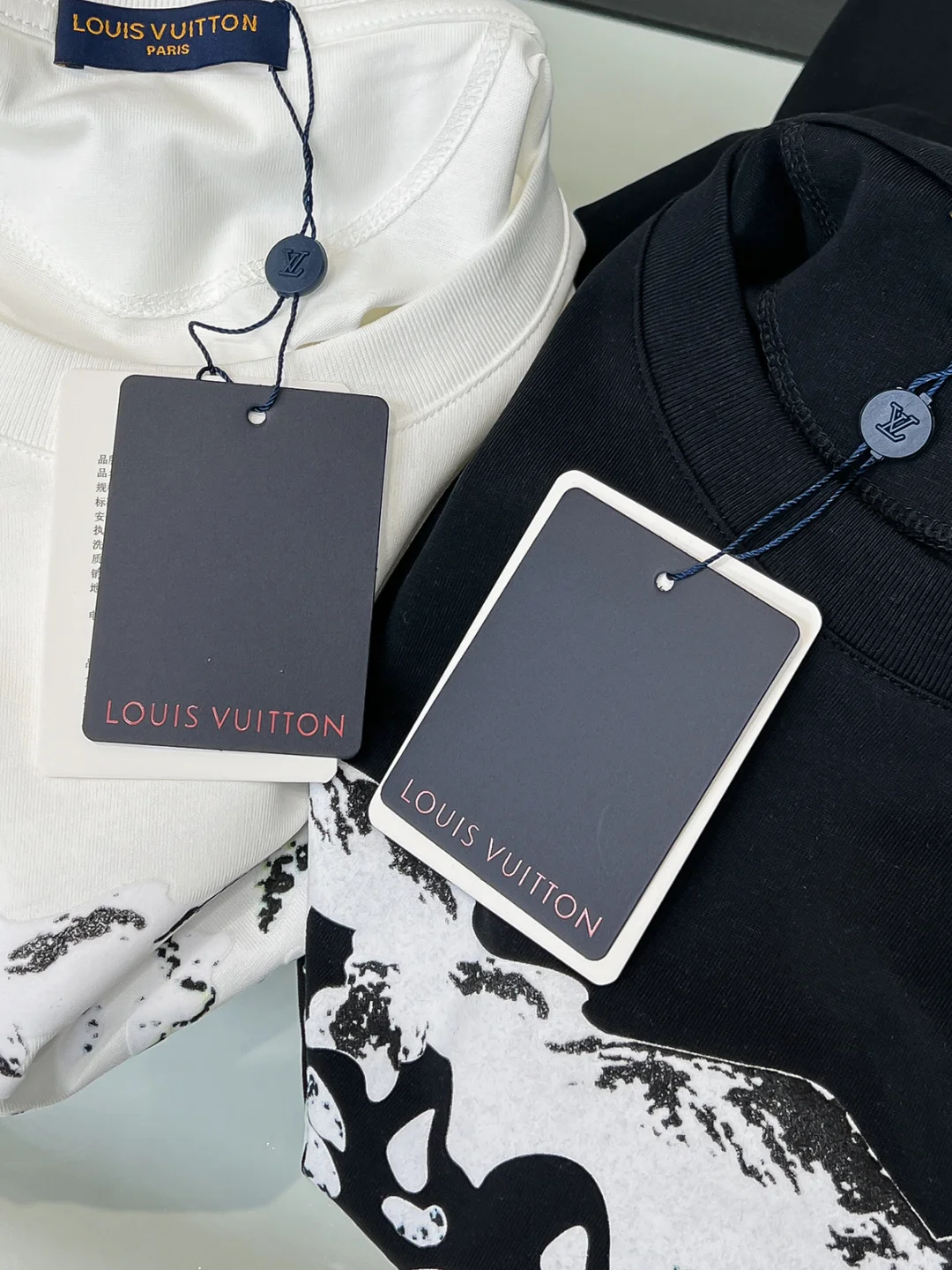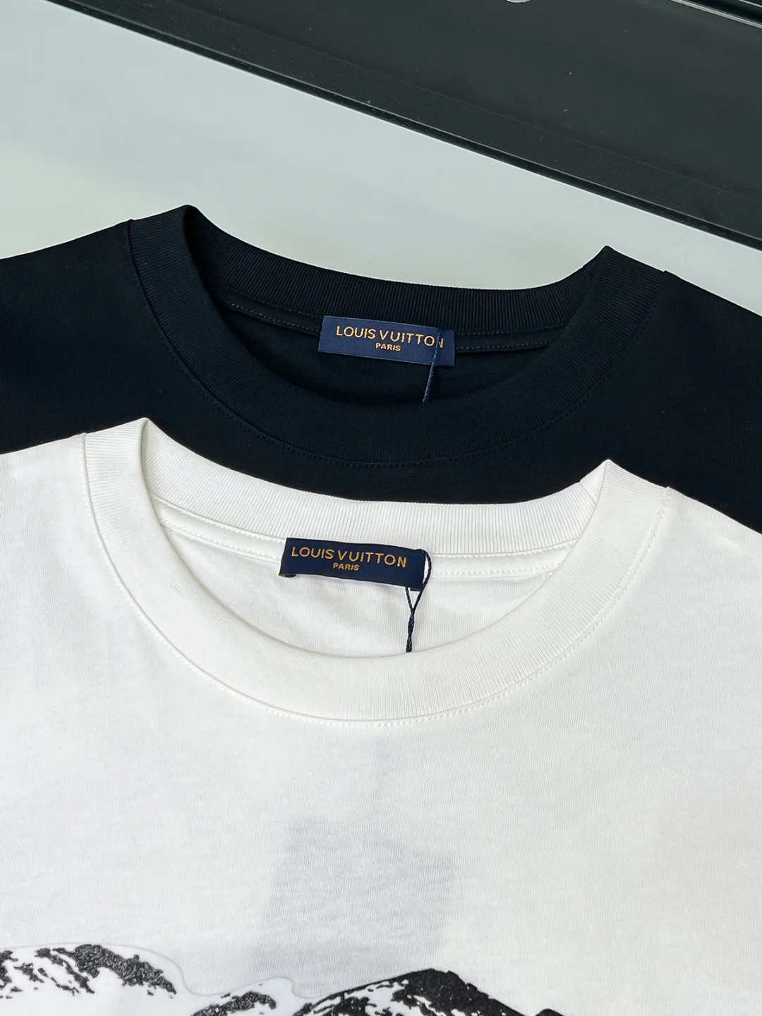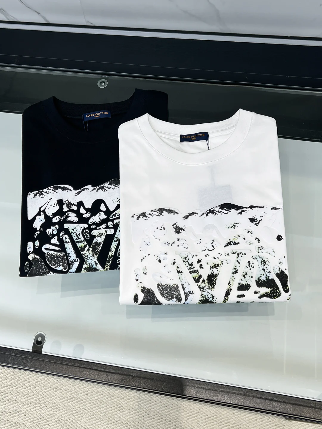 高版本注意细节 背后有龟背 Louis Vu滑雪 系列短袖T恤 LV2026滑雪系列T恤 定制面料 穿着舒适透气 正面发泡印花融合雪山 森林和抽象裂纹 隐含LV标识 艺术感满满 微宽松版型 单穿或内搭都很ok男女同款𝐂𝐎𝐋𝐎𝐔𝐑 白色 黑色𝐒𝐈𝐙𝐄 S-2XL 背后有龟背