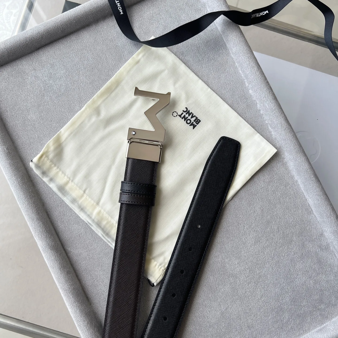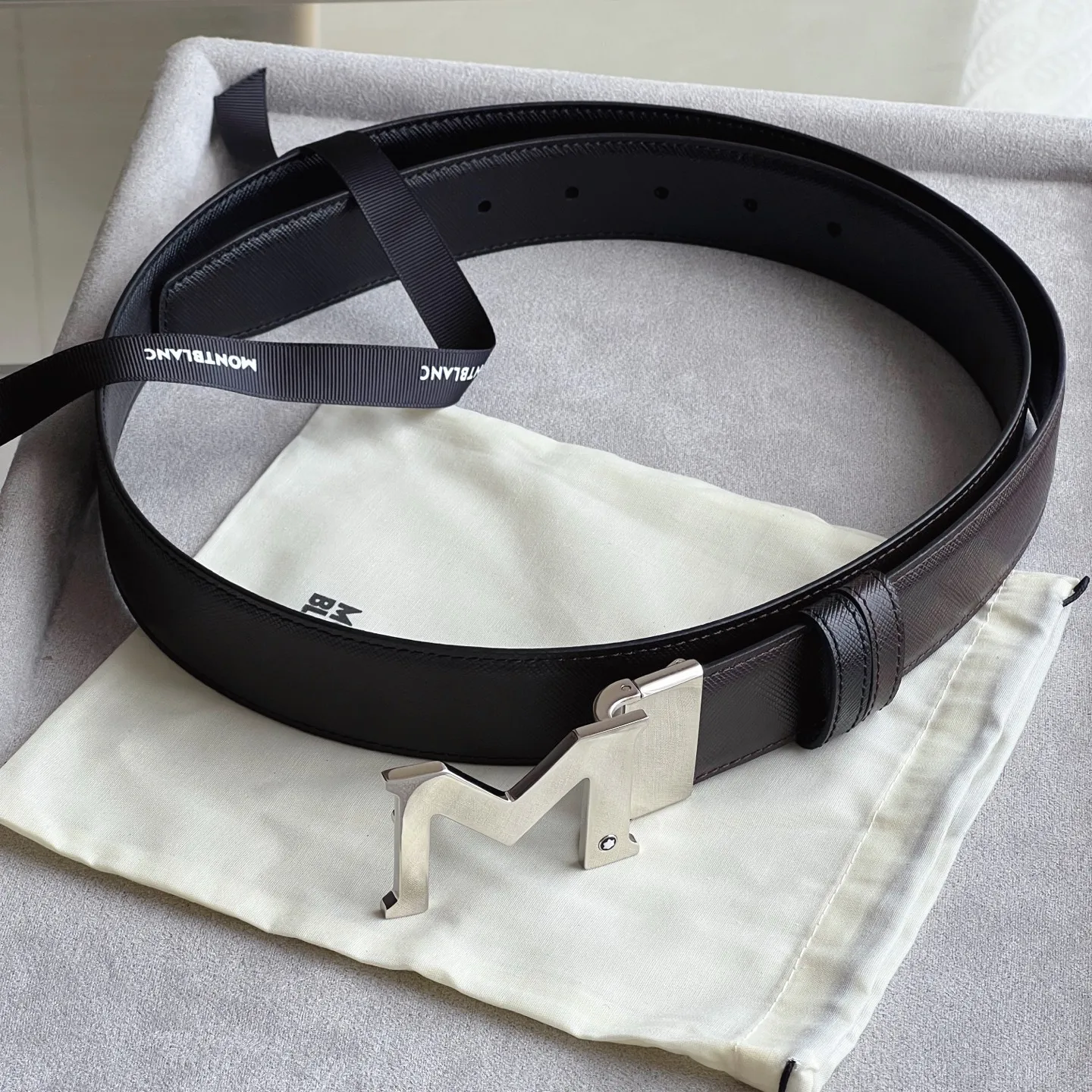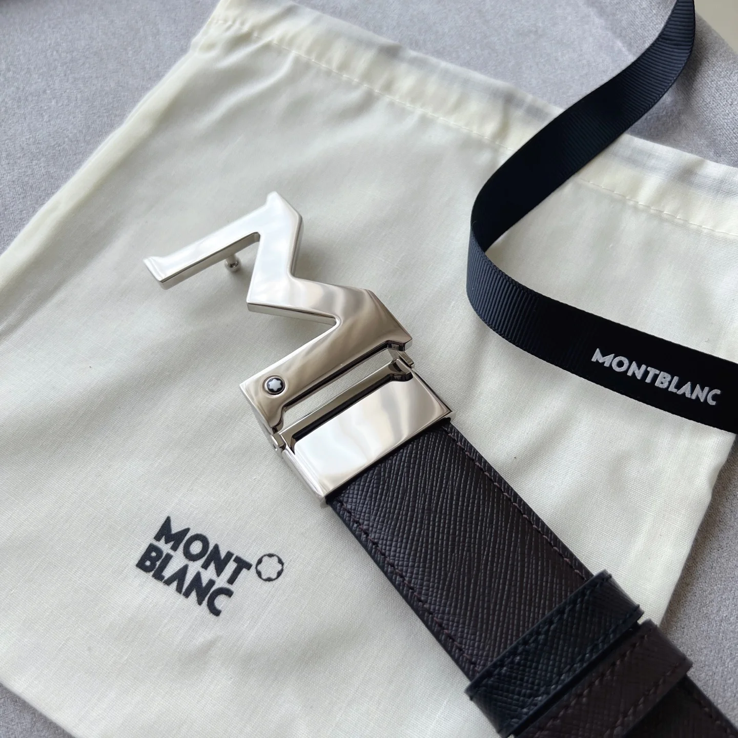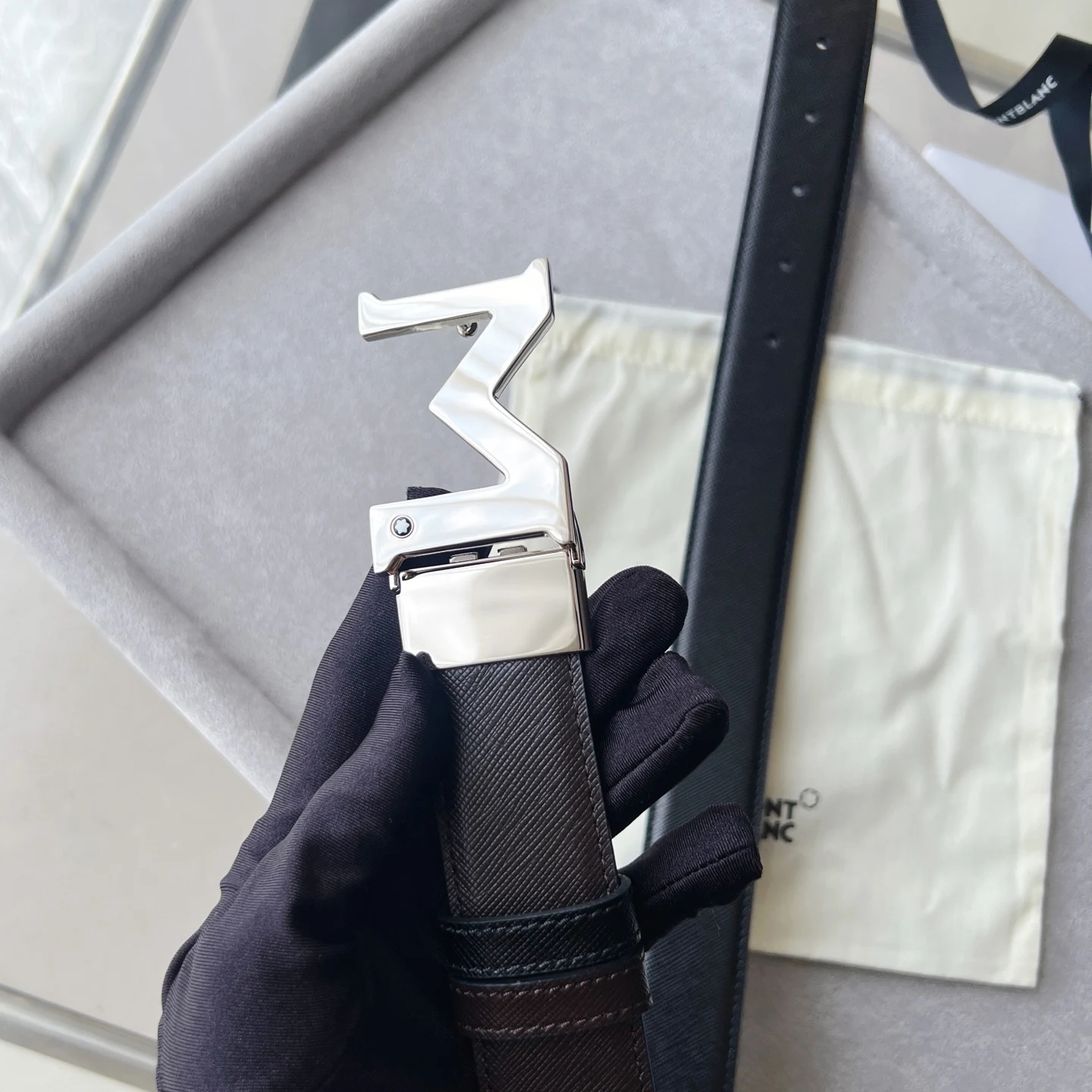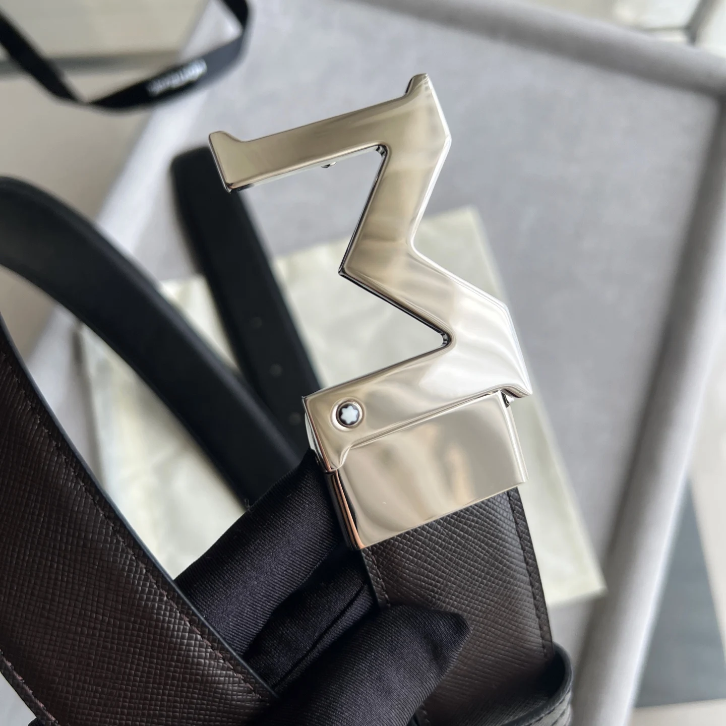 带扣饰有万宝龙六角白星品牌标识