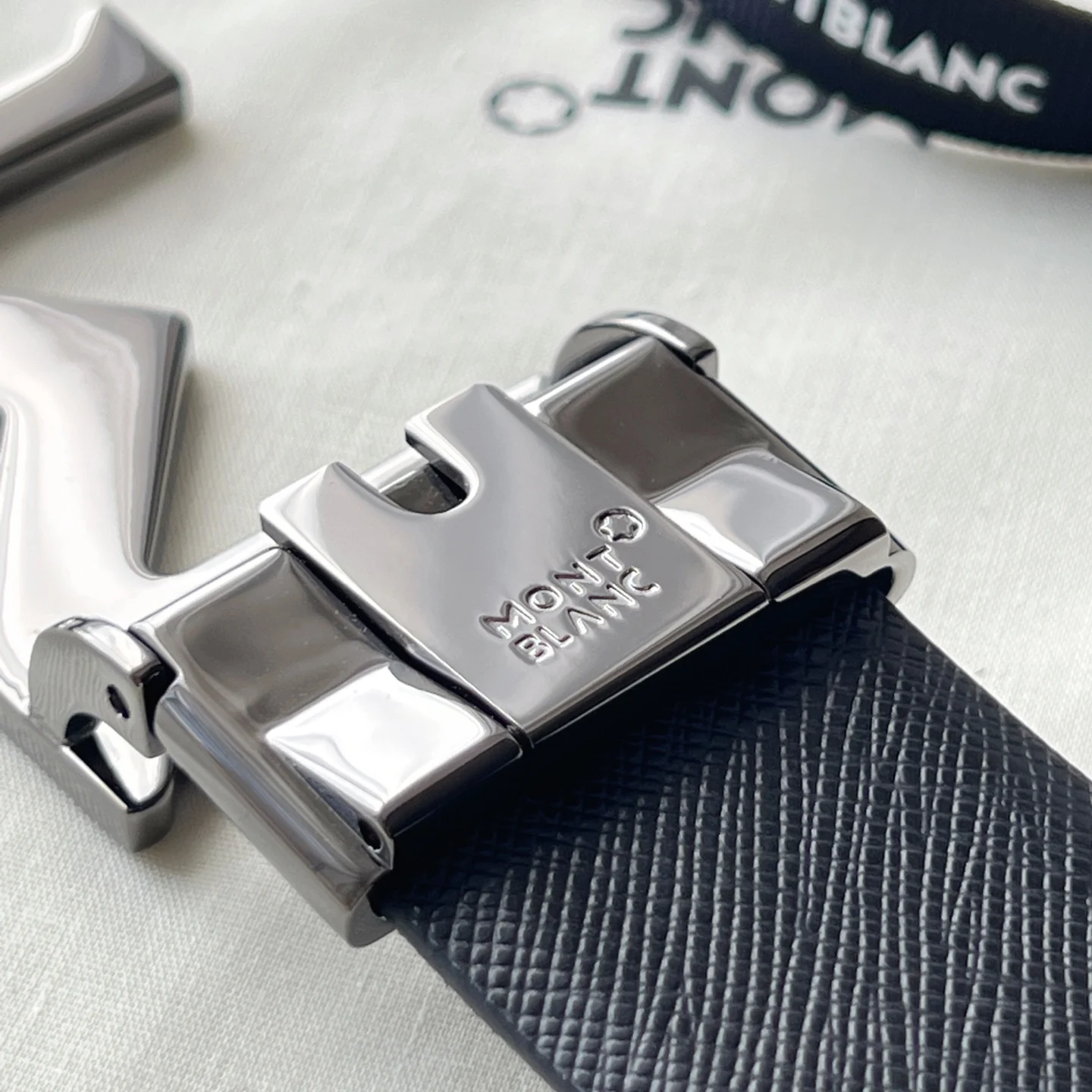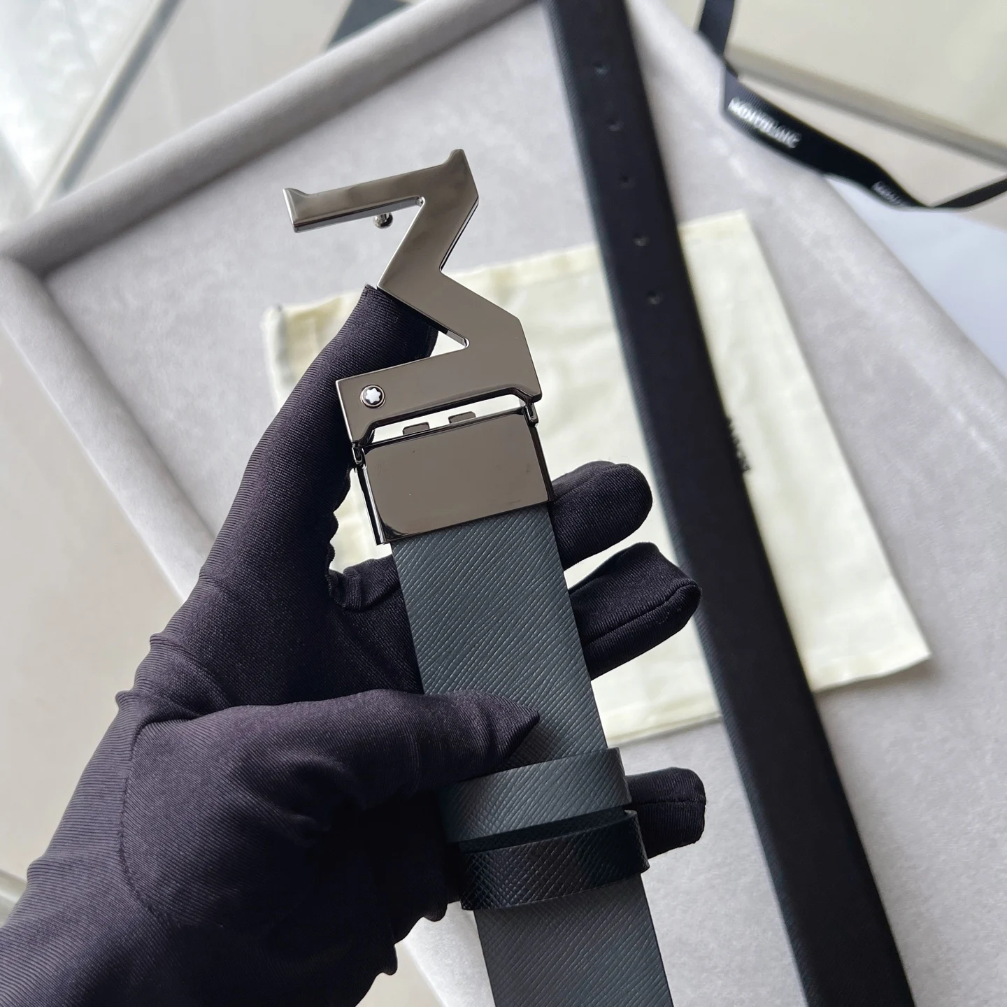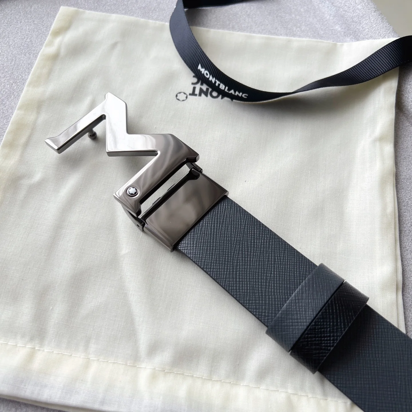 镀钯 M 字图案带扣 可调节长度 3.5厘米 x 120厘米 双面灰色粒纹和黑色粒面皮带 营造运动气息