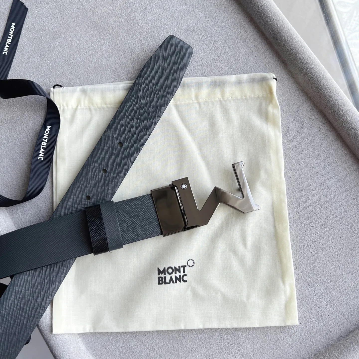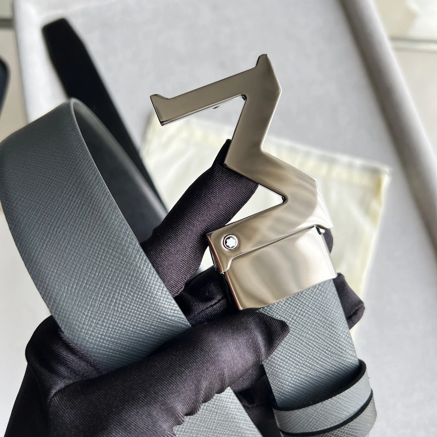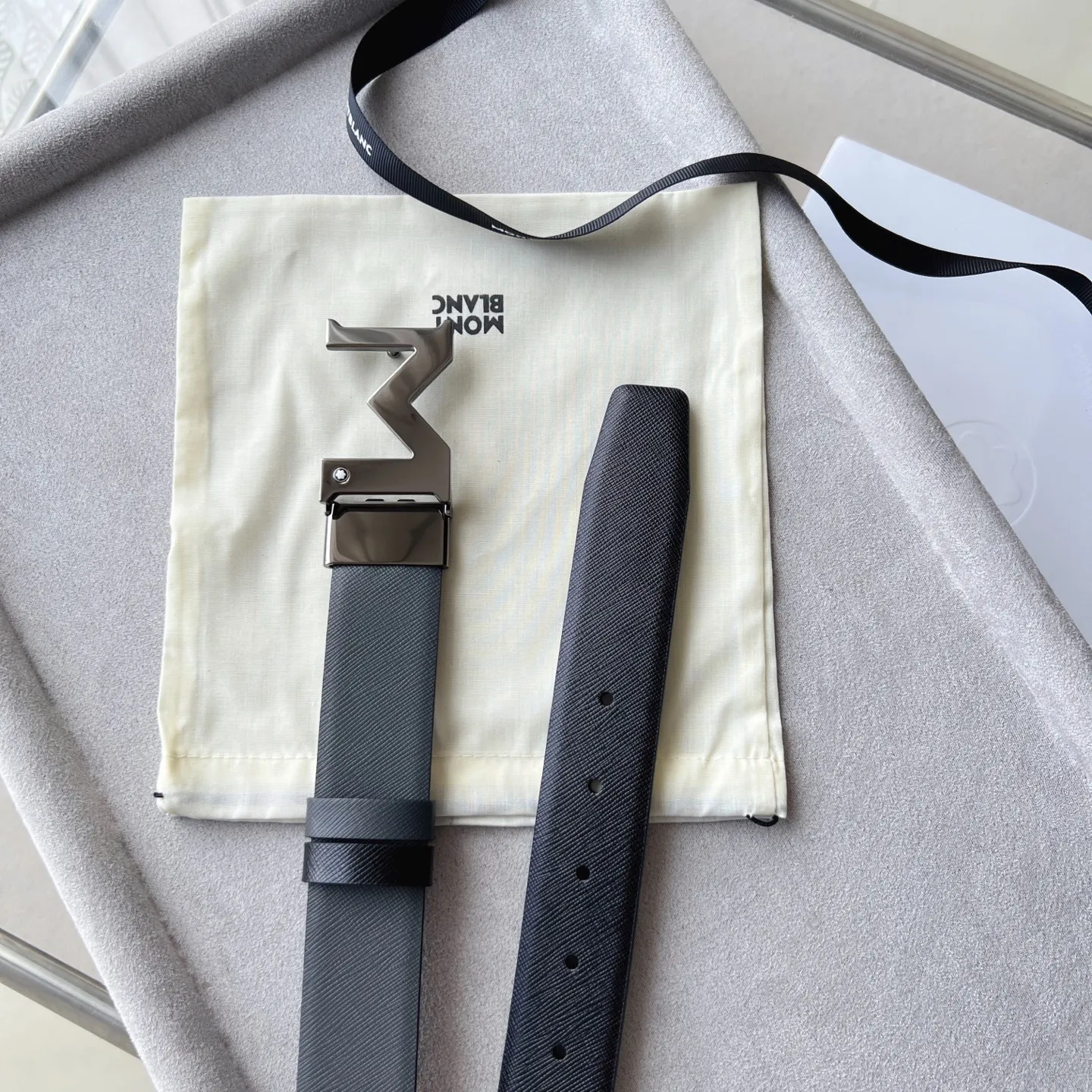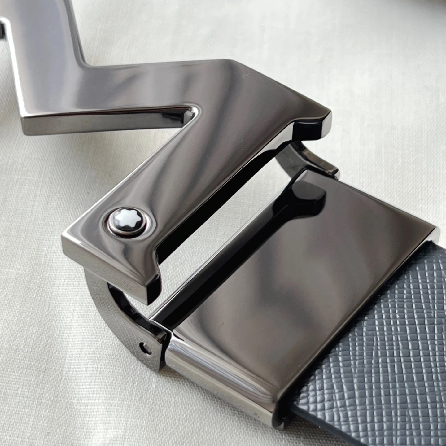 镀钯 M 字图案带扣 可调节长度 3.5厘米 x 120厘米 双面灰色粒纹和黑色粒面皮带 营造运动气息