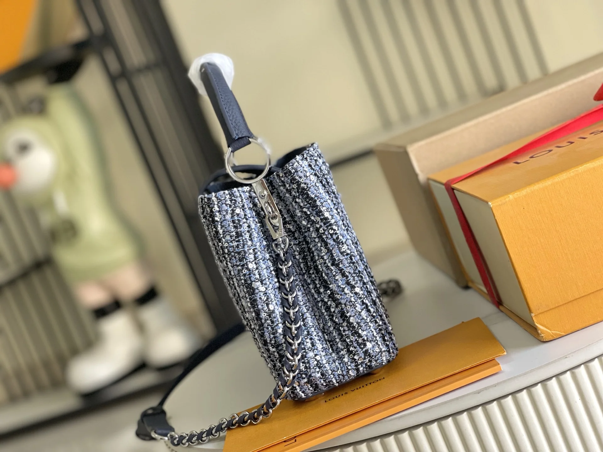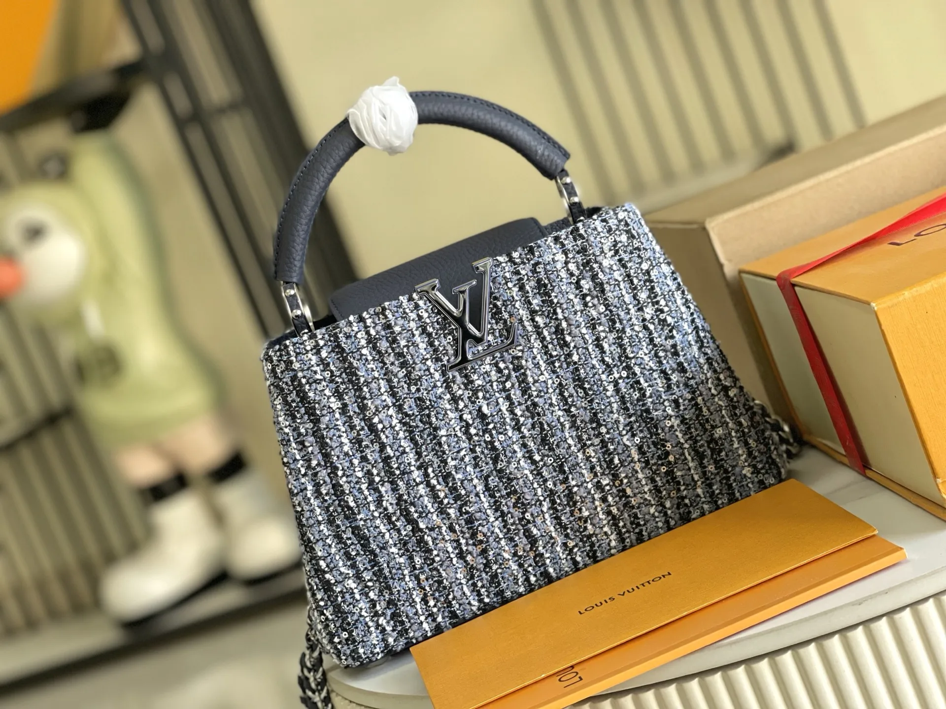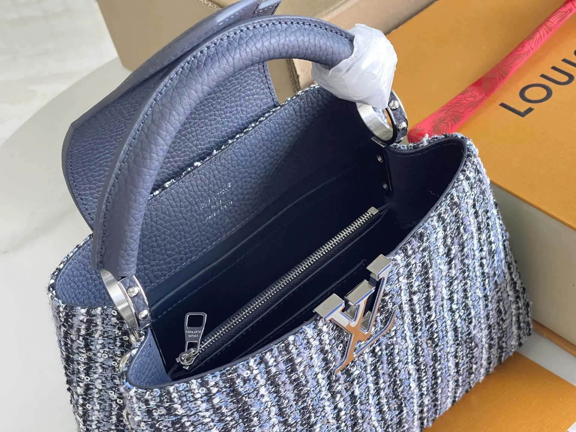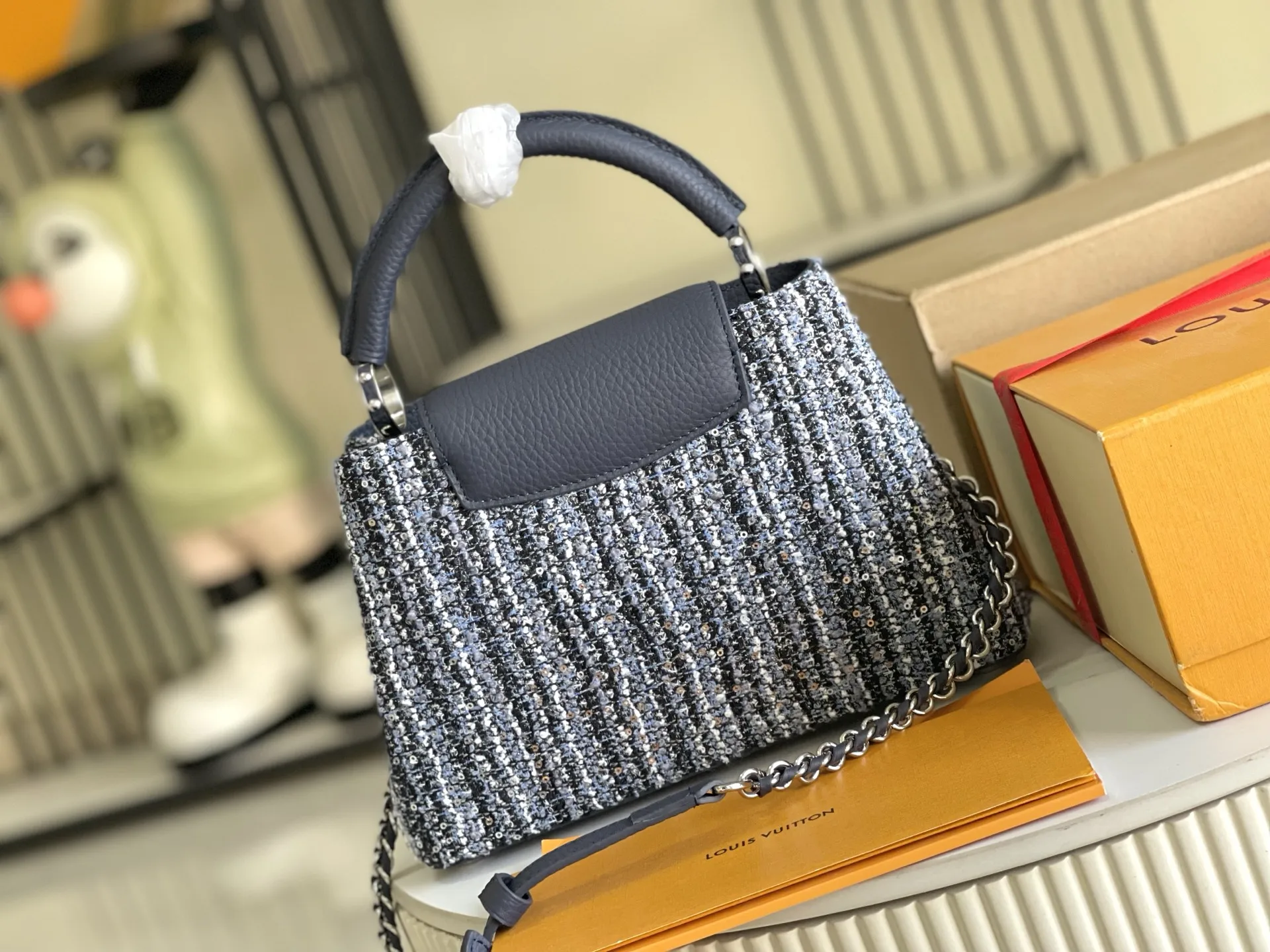 163 芯片 特级精品原厂皮 M12948小号 蓝白花呢亮片CapucinesBB手袋本季讲述全新的Capucines故事 精致的金属色Monogram花卉饰带 使此款经典手袋散发出更加柔美的气质 精致的白色包身搭配金色花冠装饰 优雅而实用