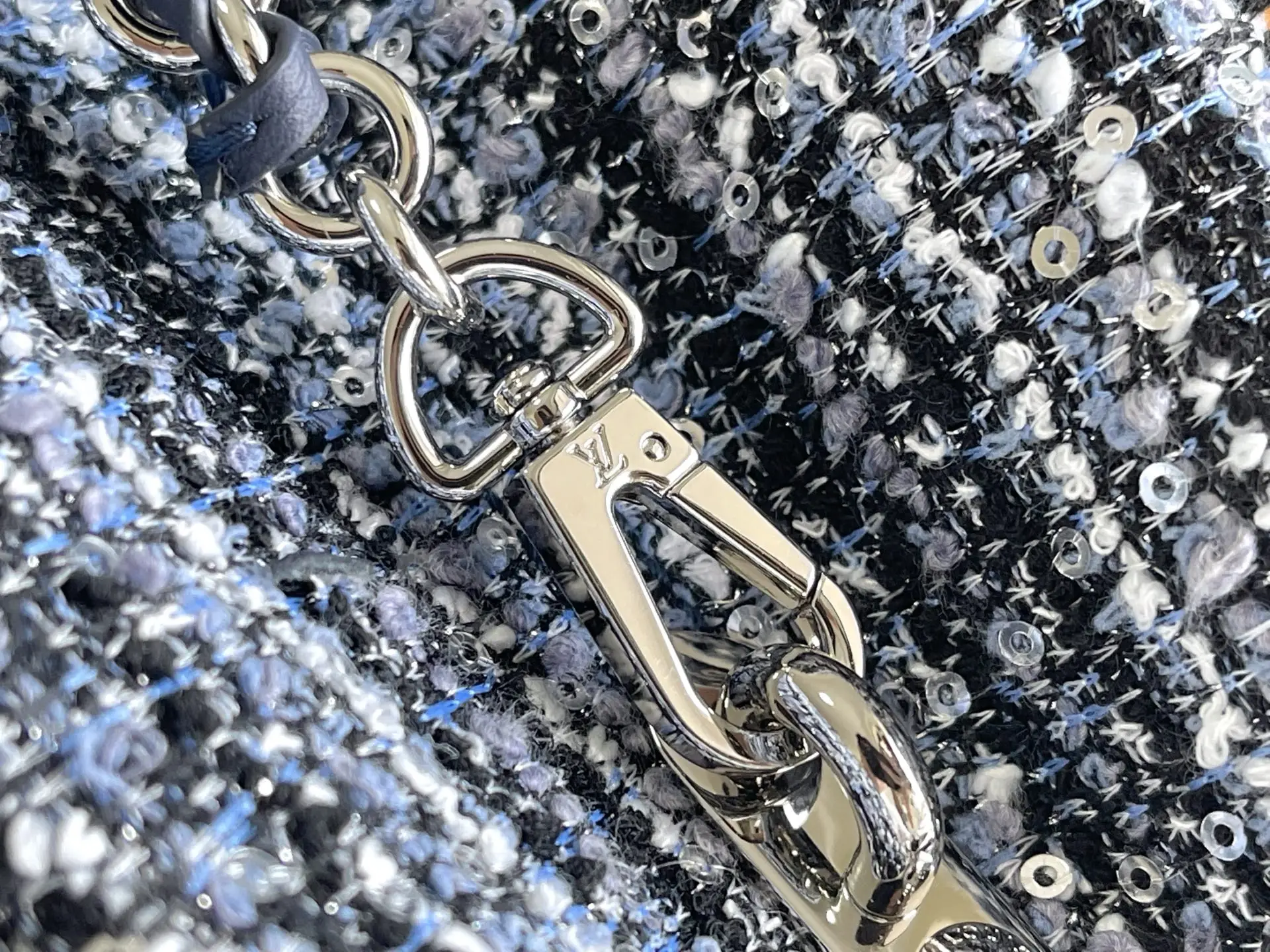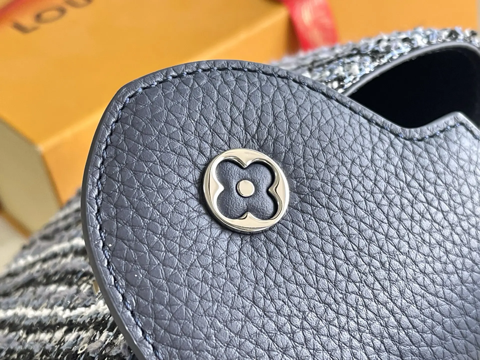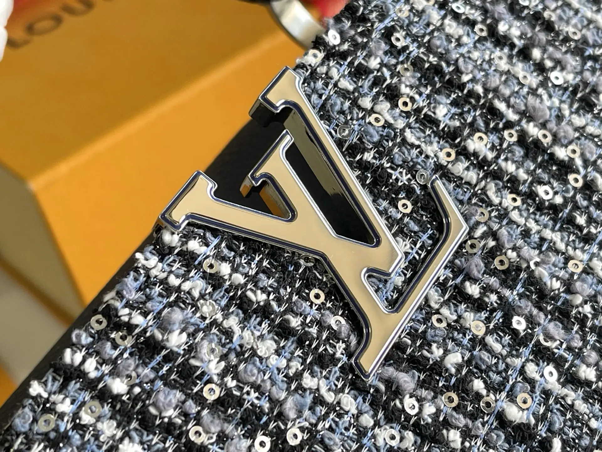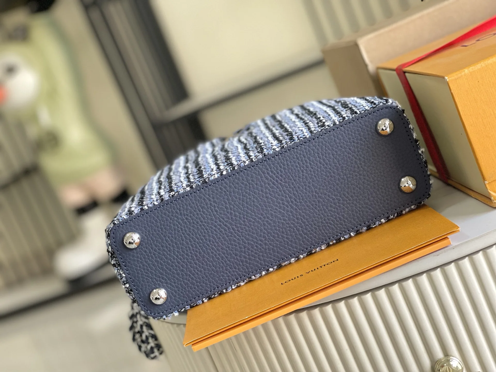 163 芯片 特级精品原厂皮 M12948小号 蓝白花呢亮片CapucinesBB手袋本季讲述全新的Capucines故事 精致的金属色Monogram花卉饰带 使此款经典手袋散发出更加柔美的气质 精致的白色包身搭配金色花冠装饰 优雅而实用