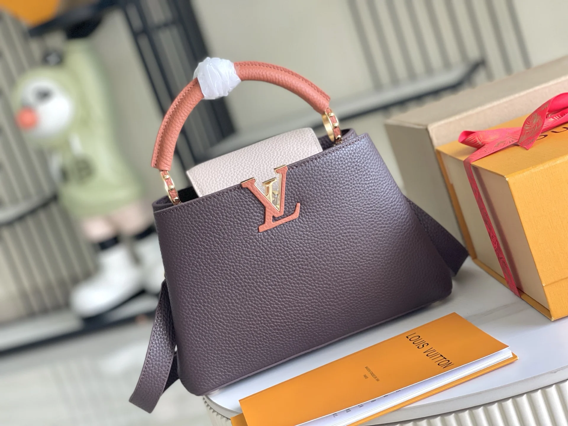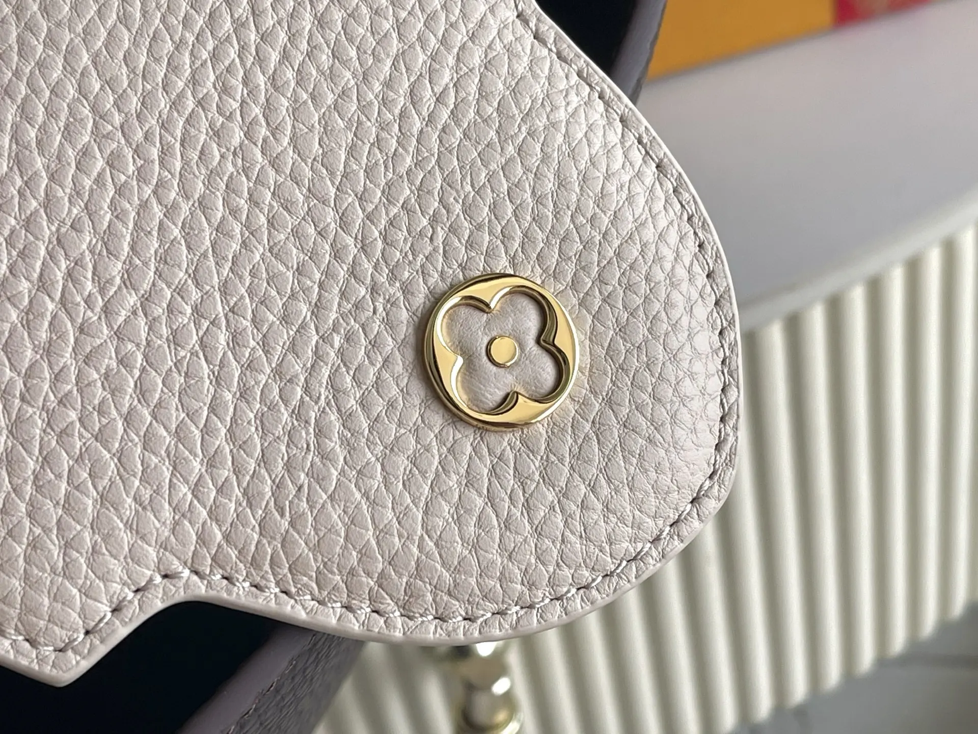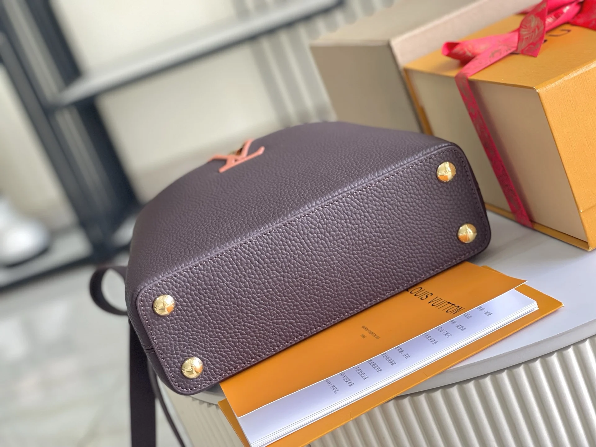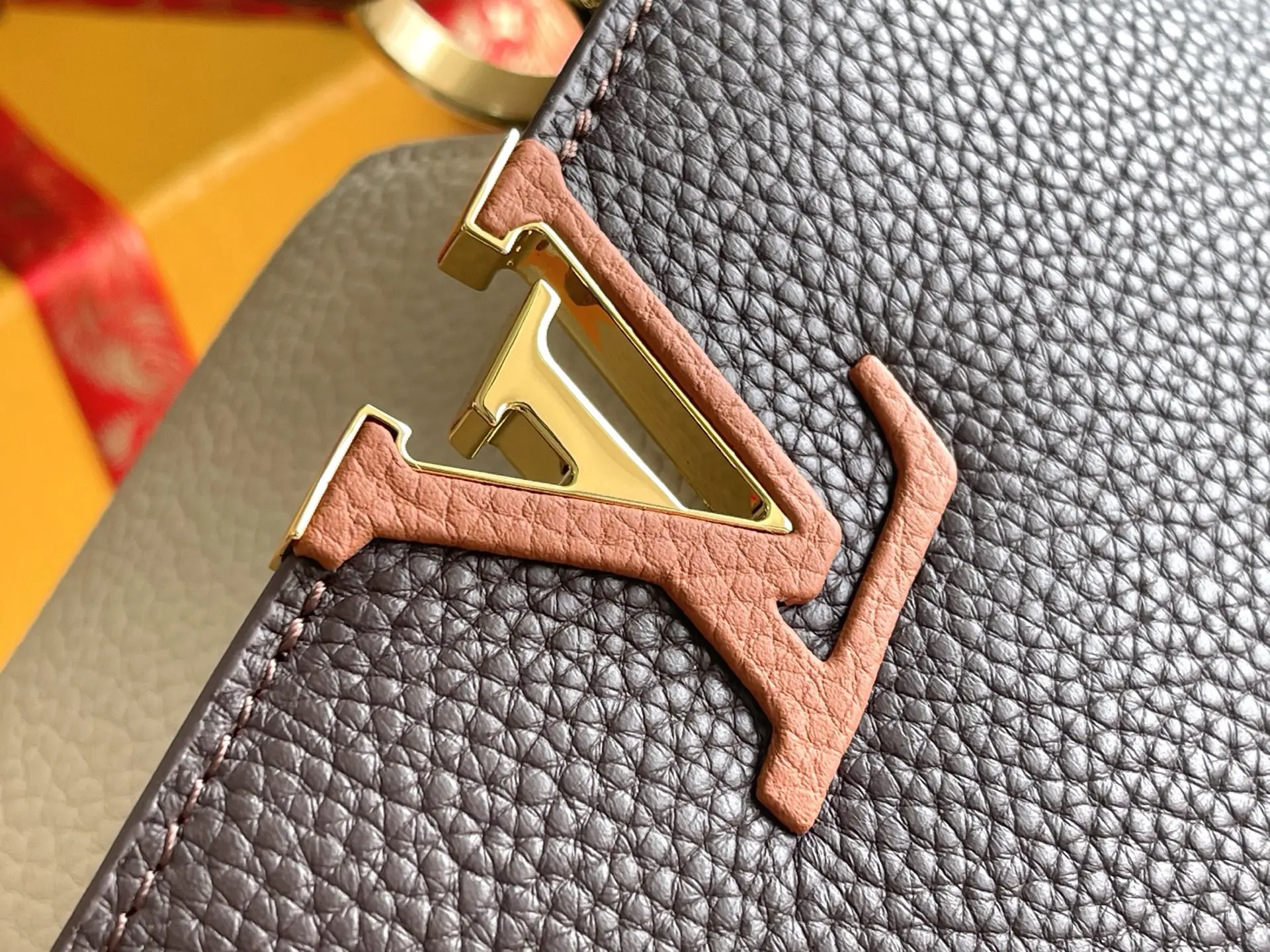 第一家路易威登门店开在巴黎的嘉布遣街上 Capucines手袋与品牌一样经久不衰 可以为任何造型带来时尚的精致感 全粒面Taurillon皮打造出一款奢华的手提包 各种传统的细节是手袋的亮点 LV首字母 独特的边环 翻盖上精细的Monogram花朵 配有顶部手柄 可脱卸包带与独特包盖 多种背携风格 适应不同造型或心情