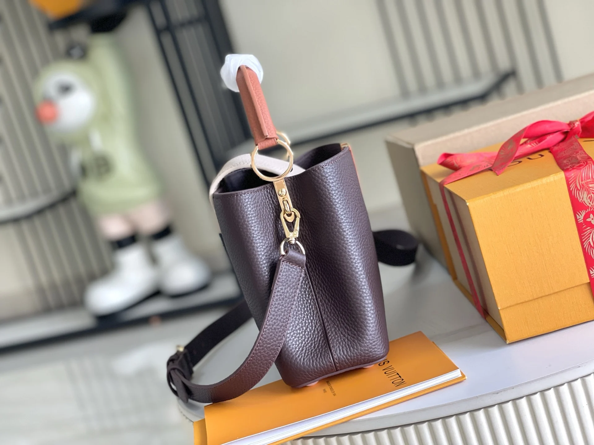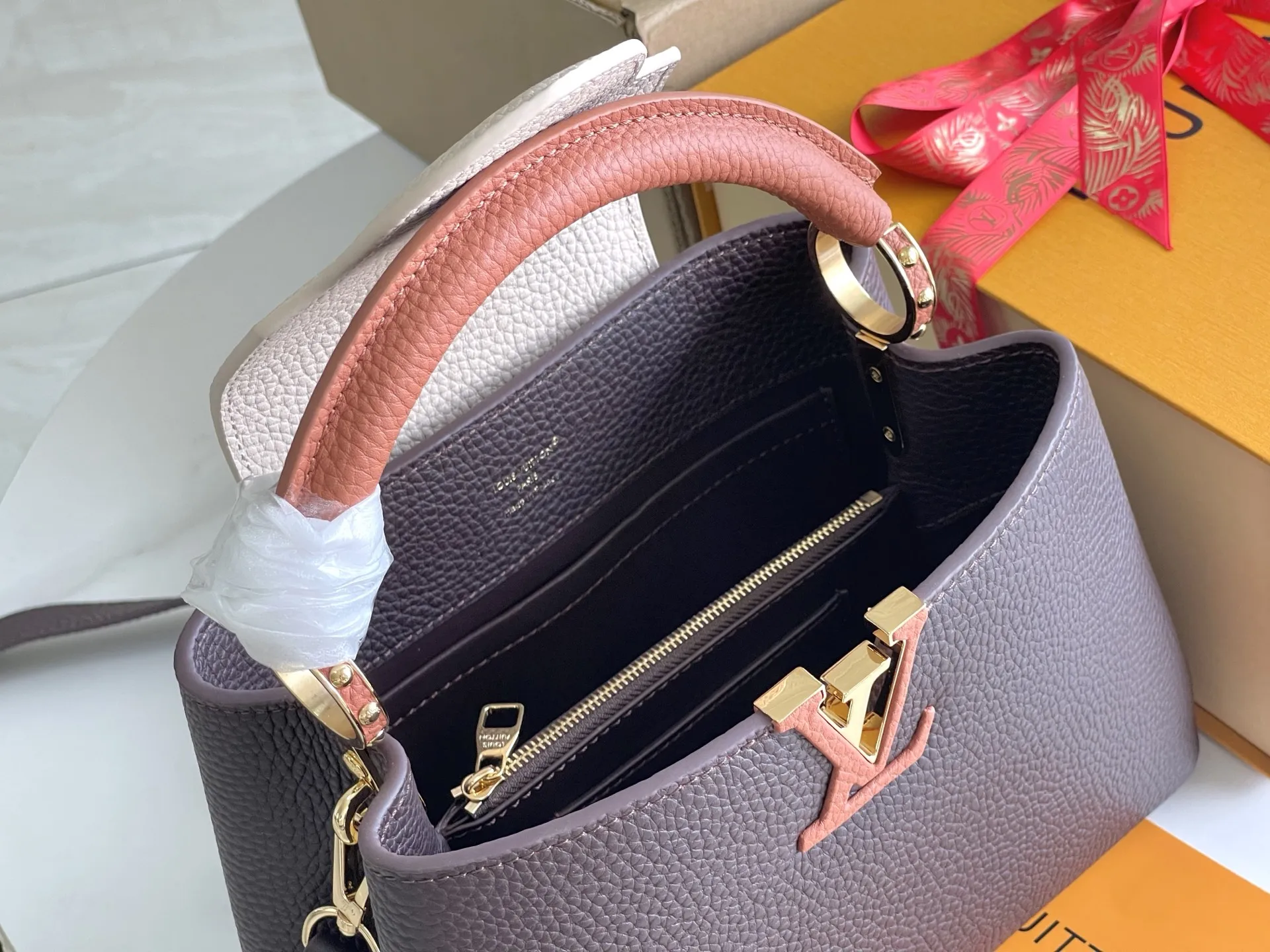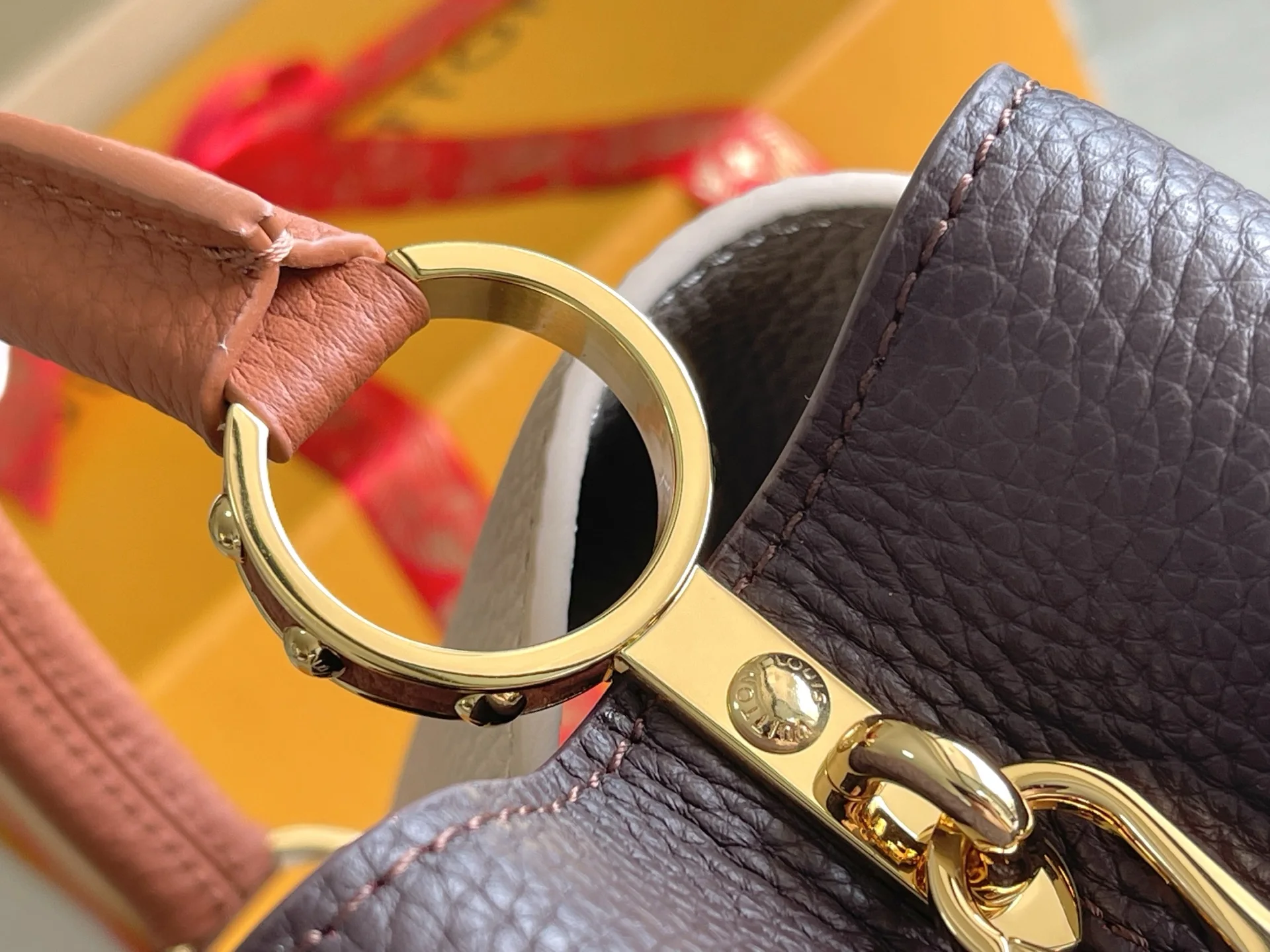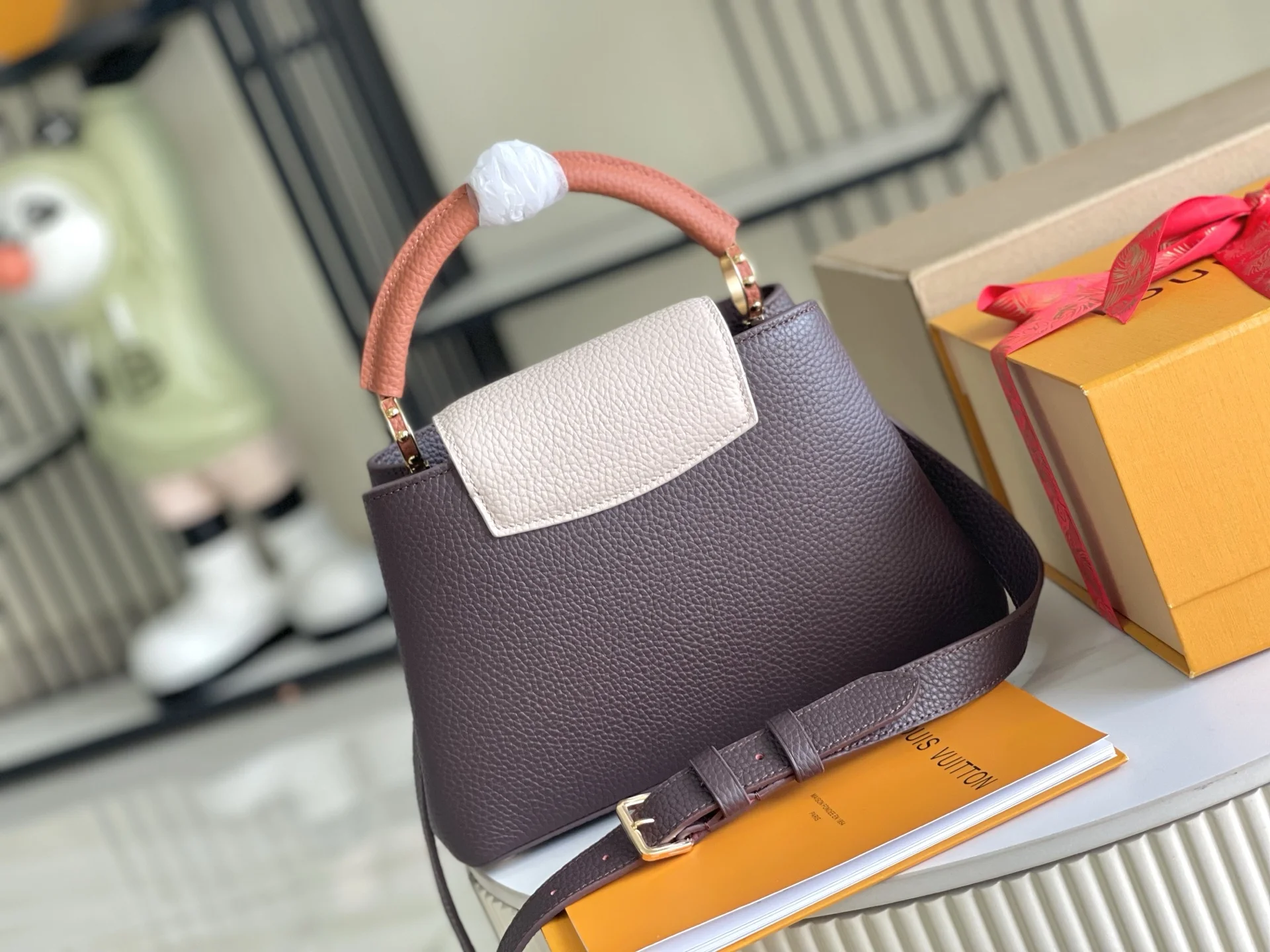 第一家路易威登门店开在巴黎的嘉布遣街上 Capucines手袋与品牌一样经久不衰 可以为任何造型带来时尚的精致感 全粒面Taurillon皮打造出一款奢华的手提包 各种传统的细节是手袋的亮点 LV首字母 独特的边环 翻盖上精细的Monogram花朵 配有顶部手柄 可脱卸包带与独特包盖 多种背携风格 适应不同造型或心情