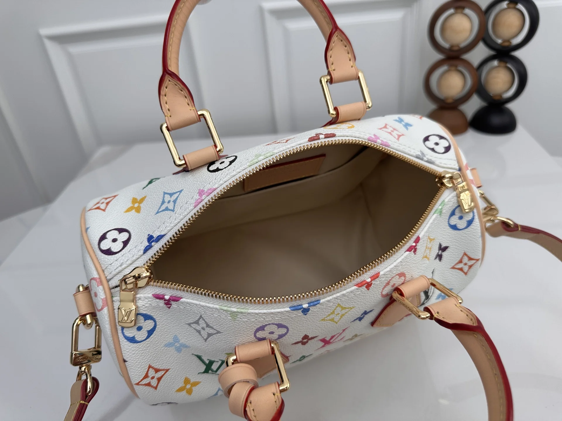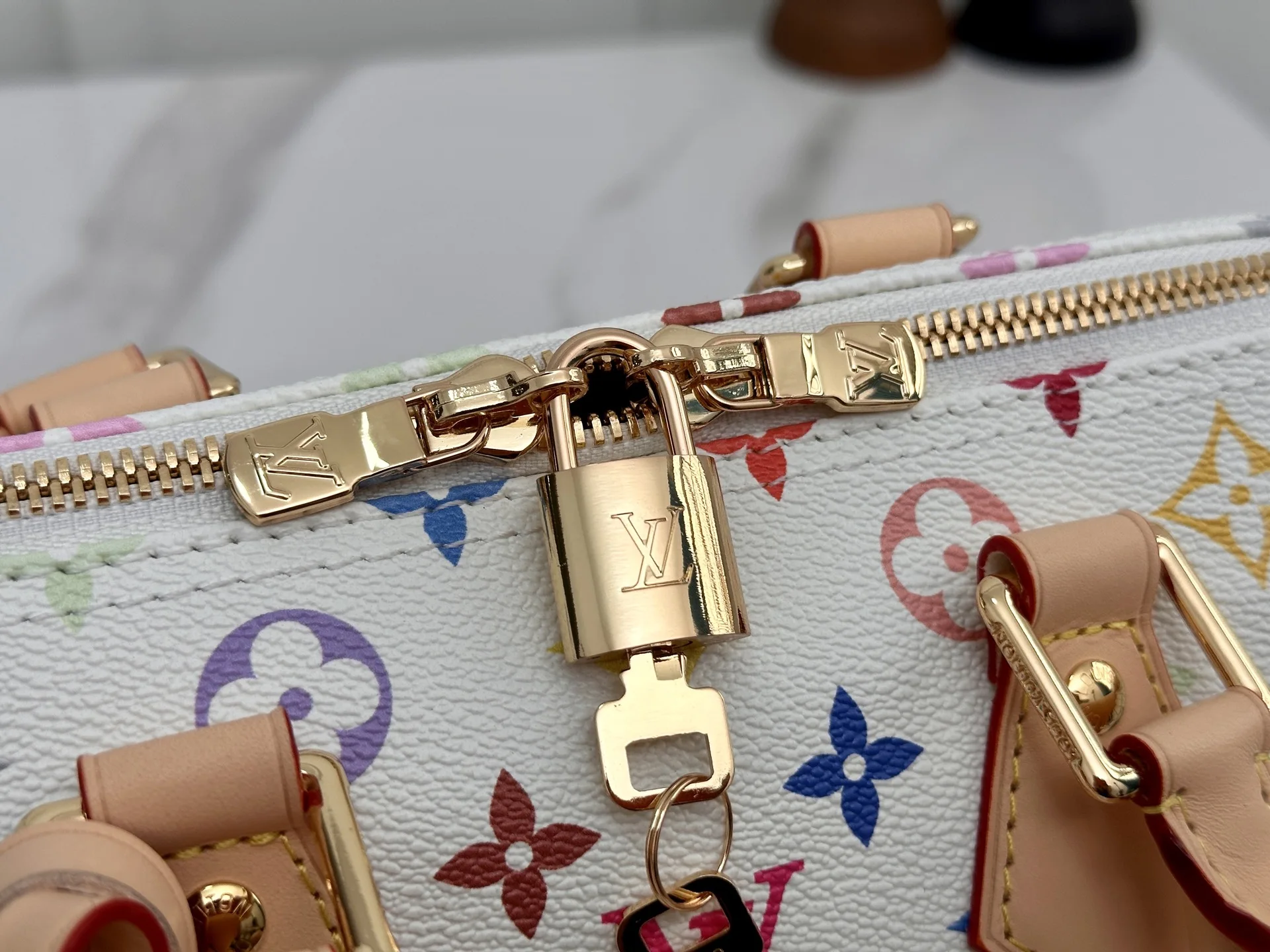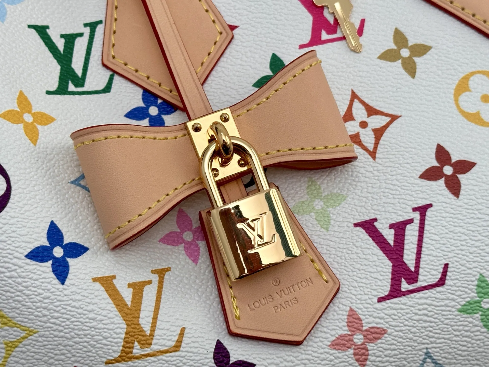 顶级原单 163c芯片 本款M13085白彩 Speedy Bandouliere 25 手袋为经典 Monogram 图案渲染日本艺术家村上隆笔下的明丽色调 与蝴蝶结造型钥匙包一道彰显路易威登 x 村上隆合作系列的灵动风采 牛皮革塑造 Toron 手柄和可拆卸并调节的肩带 耀目挂锁和包角援引品牌行李箱素 尺寸 25×19×15cm