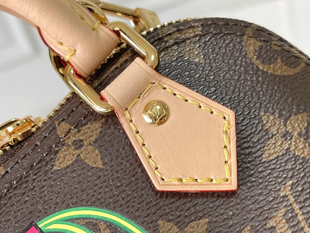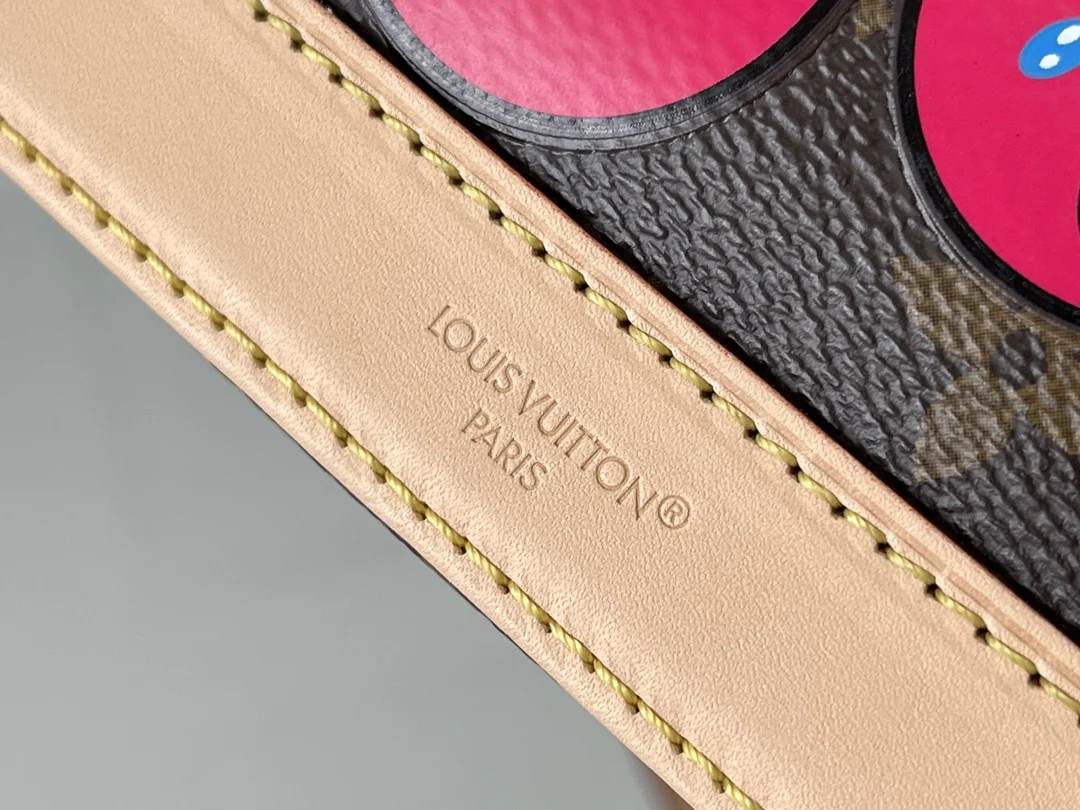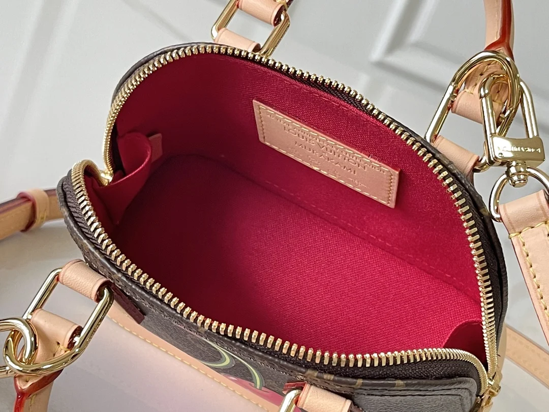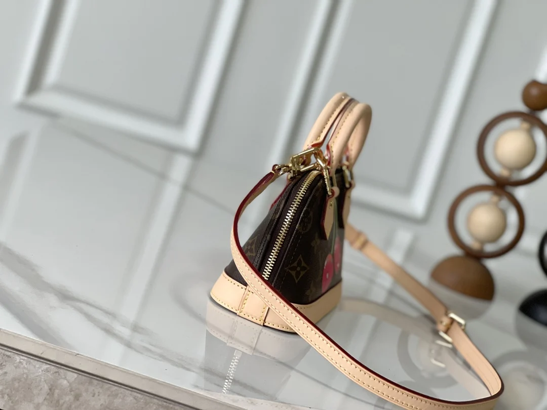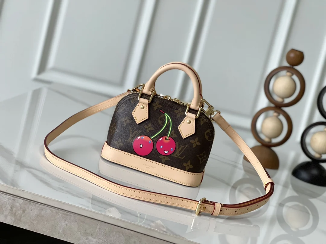 本款 Nano Alma 手袋结合 Monogram 涂层帆布与牛皮革饰边 令玲珑廓形呈现路易威登 x 村上隆复刻系列的樱桃图案 顶部手柄和可拆卸并调节的肩带实现多种背携方式 内部空间可容纳短款夹和大号智能手机等日常所需