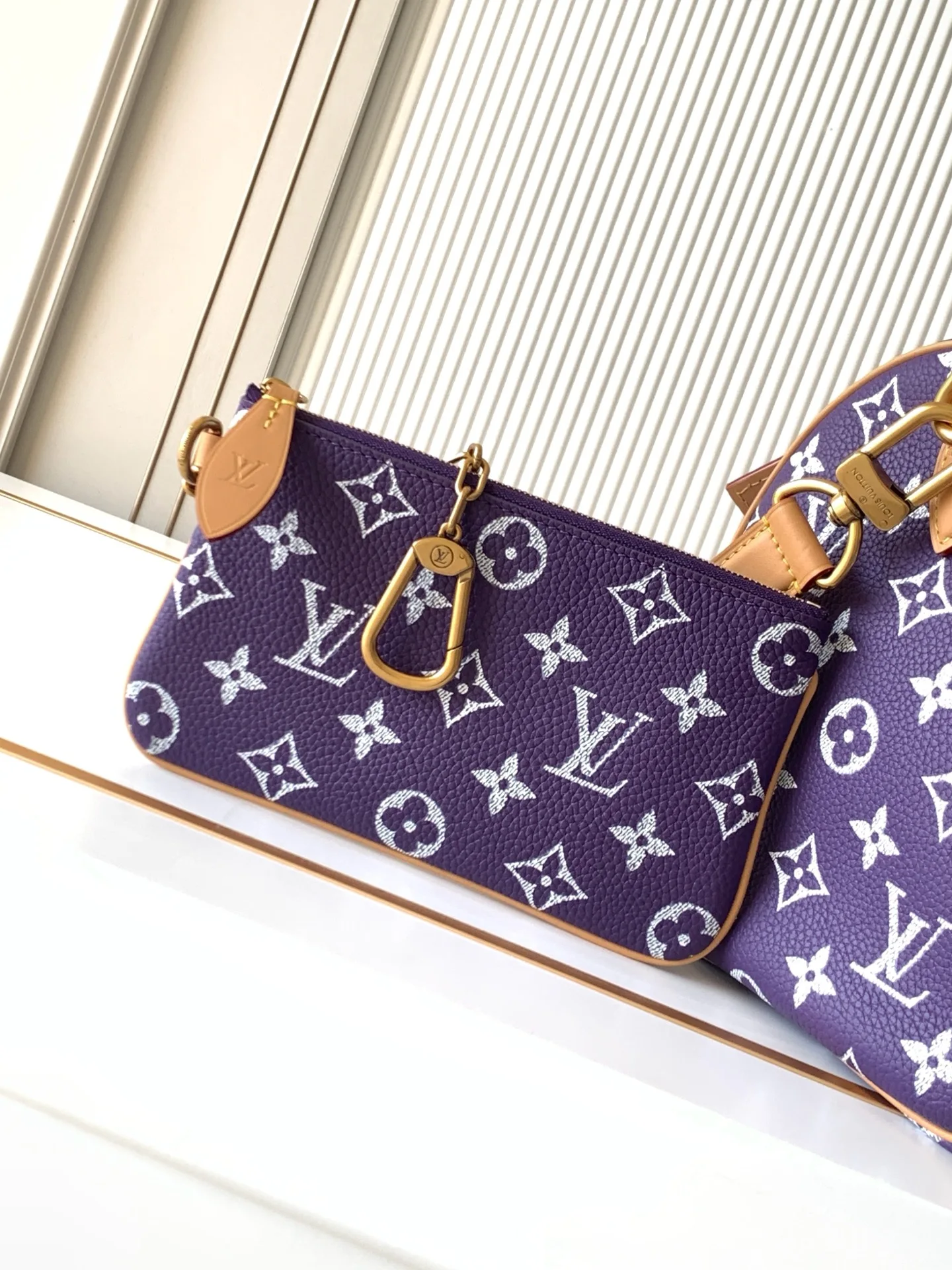 Monogram 图案 搭配条纹牛皮革内衬 设有可拆卸收纳袋和多重口袋 肩带:可拆卸 可调节包带半长:46.0厘米