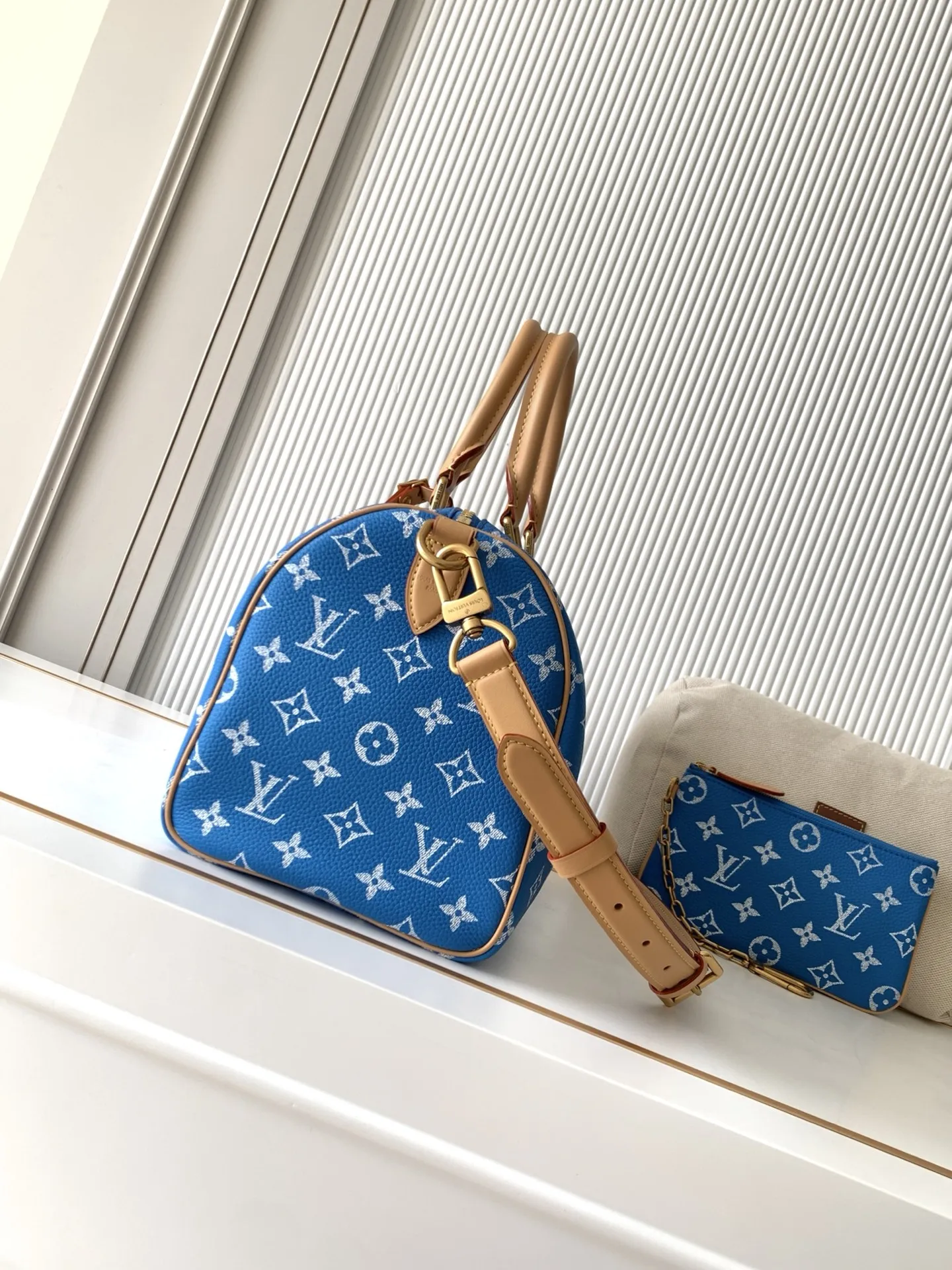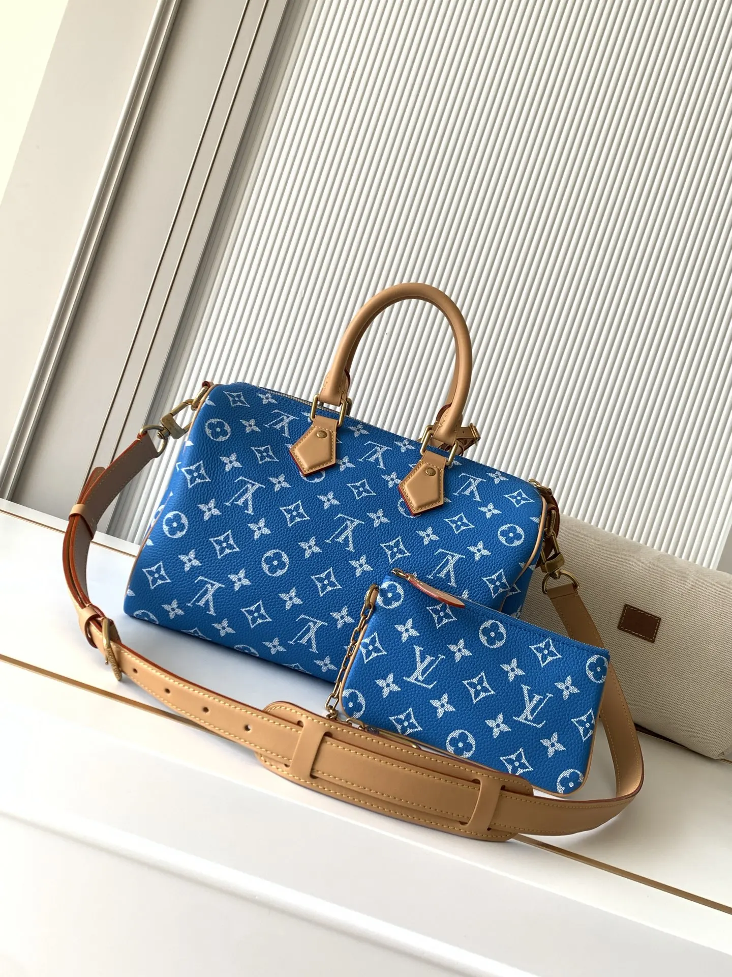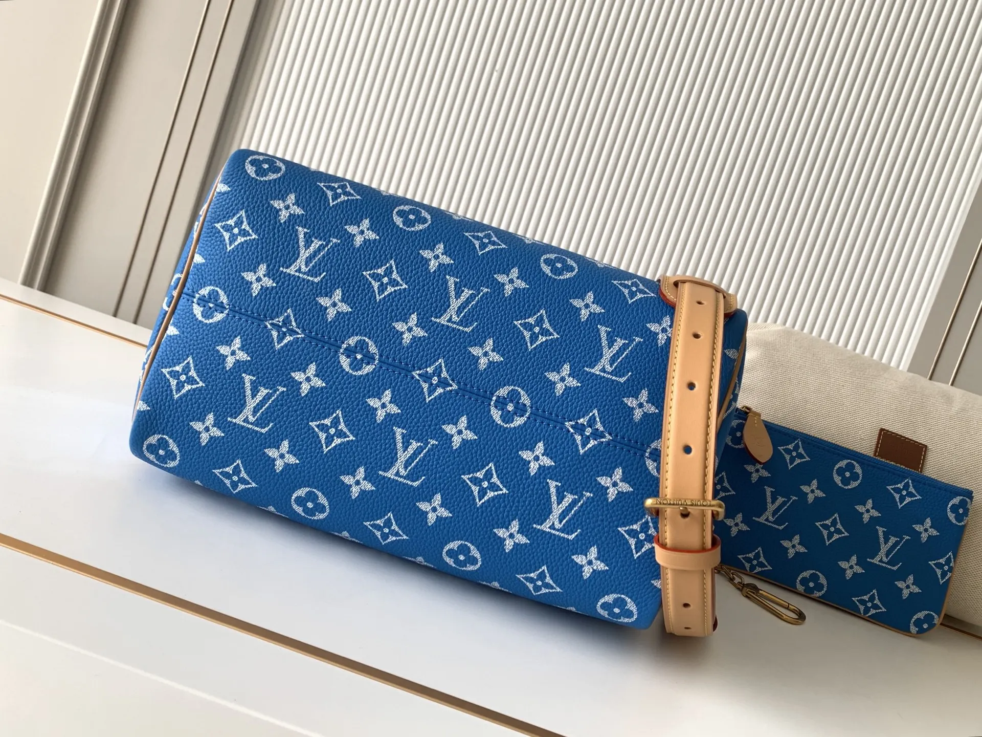 全钢五金 MB163c01变码芯片 款号M14074中蓝 本款Speedy P9 Bandouliere30手袋于细腻牛皮革表面描绘