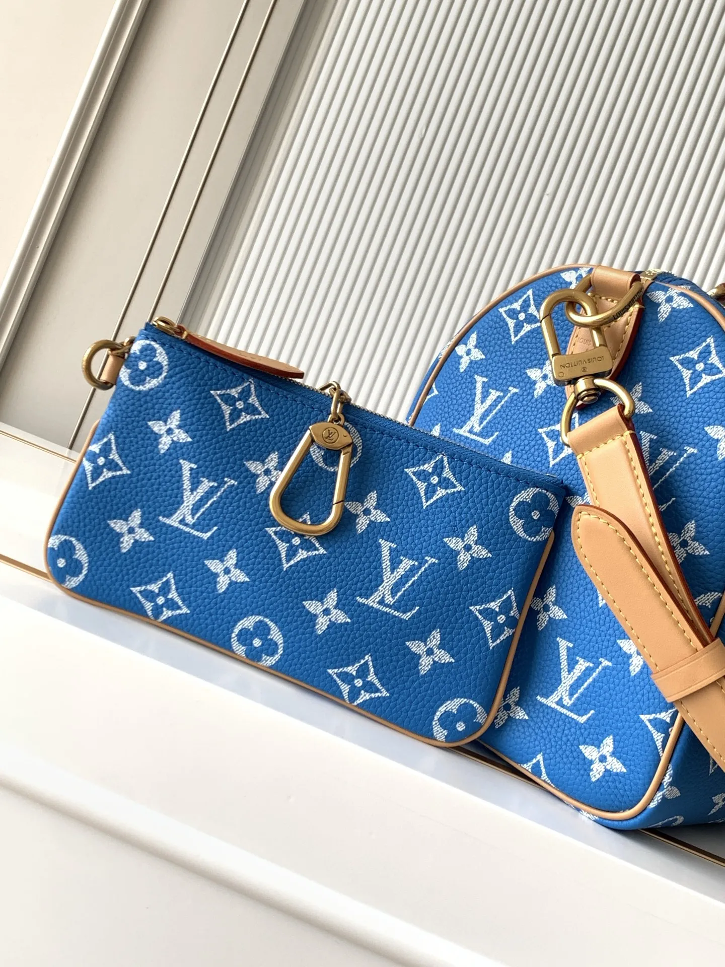 Monogram 图案 搭配条纹牛皮革内衬 设有可拆卸收纳袋和多重口袋 肩带:可拆卸 可调节包带半长:46.0厘米