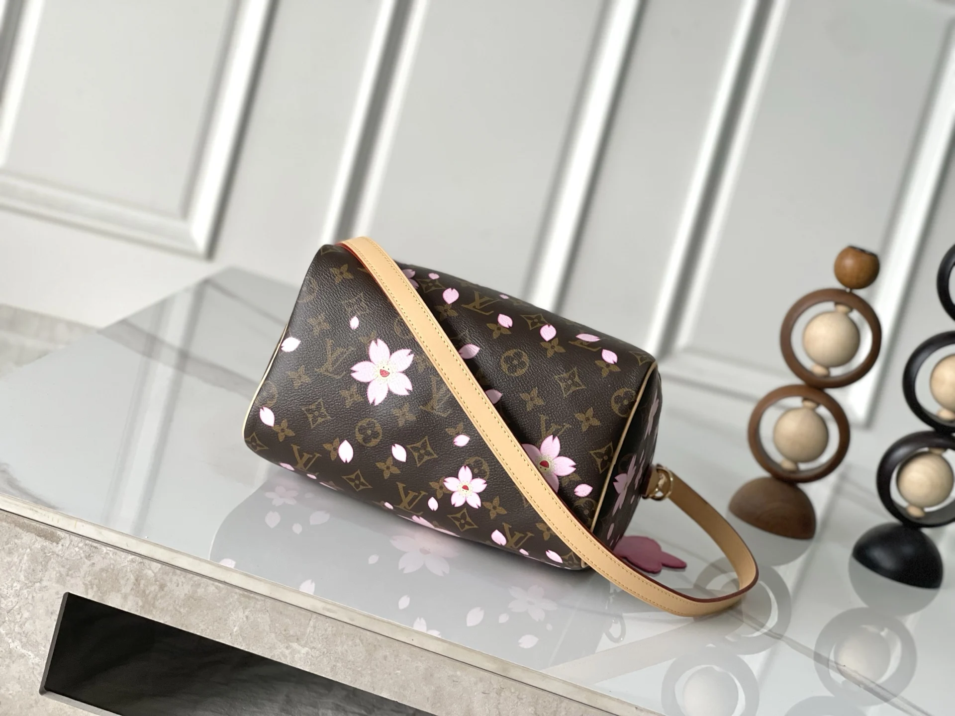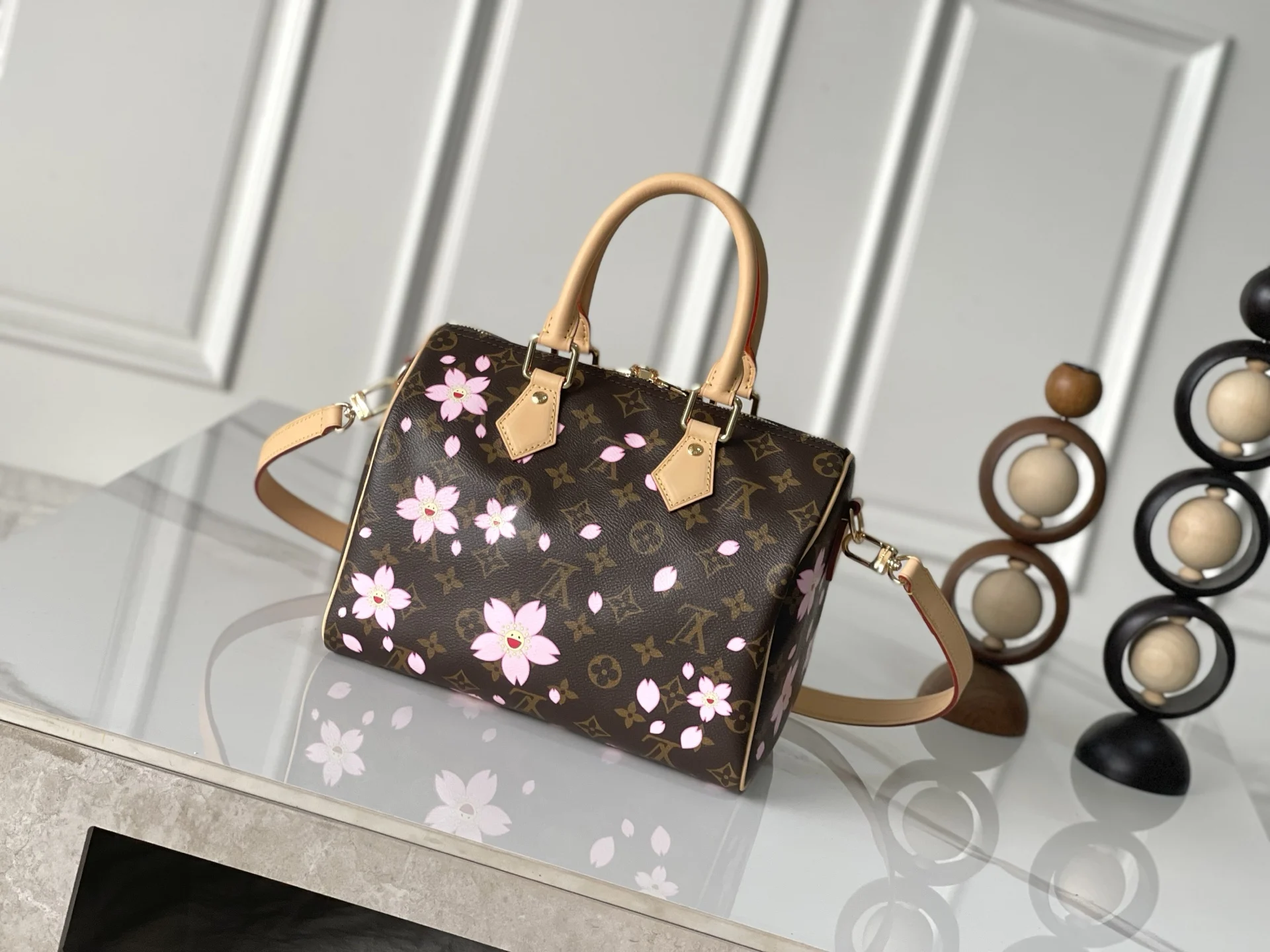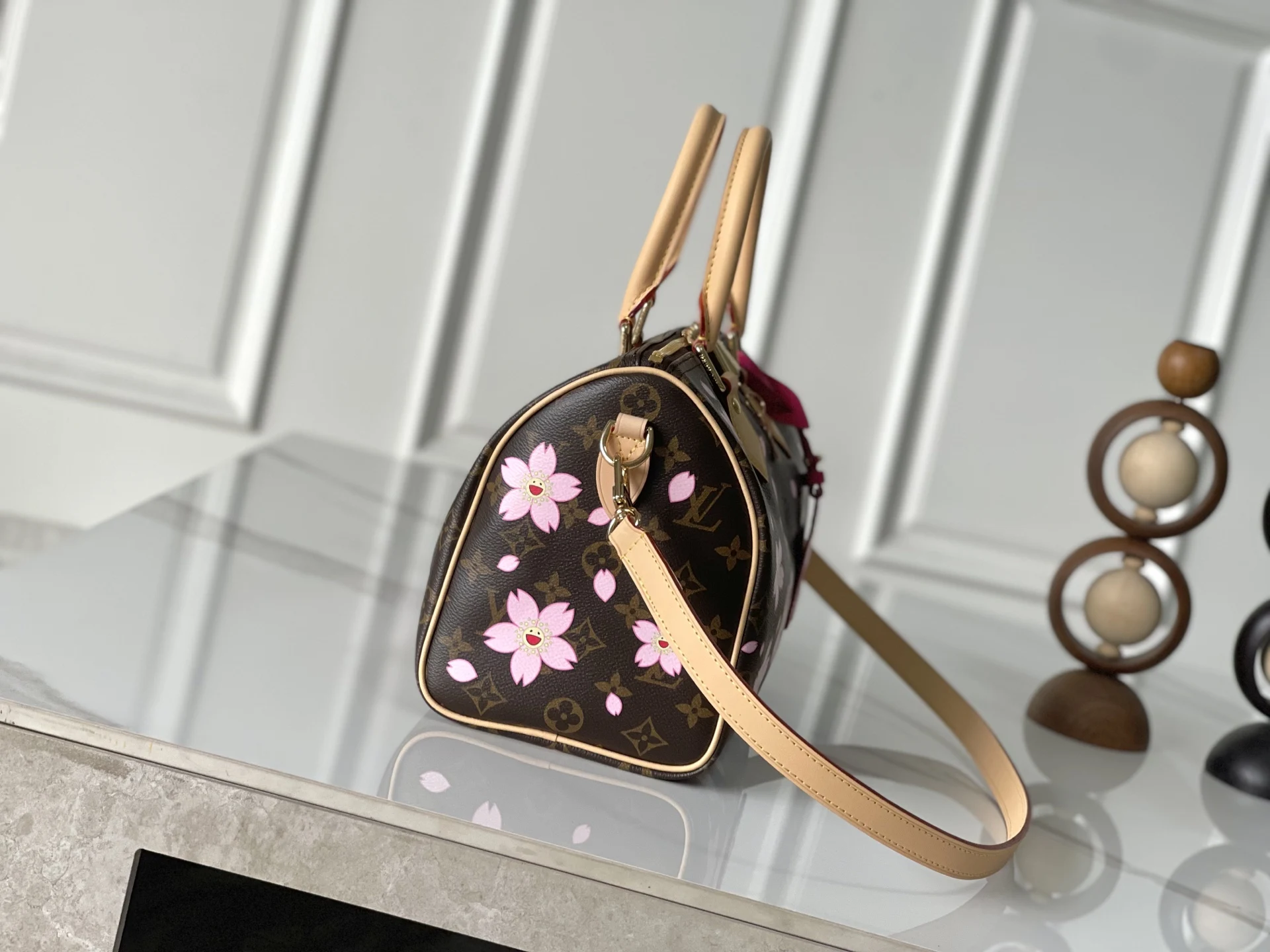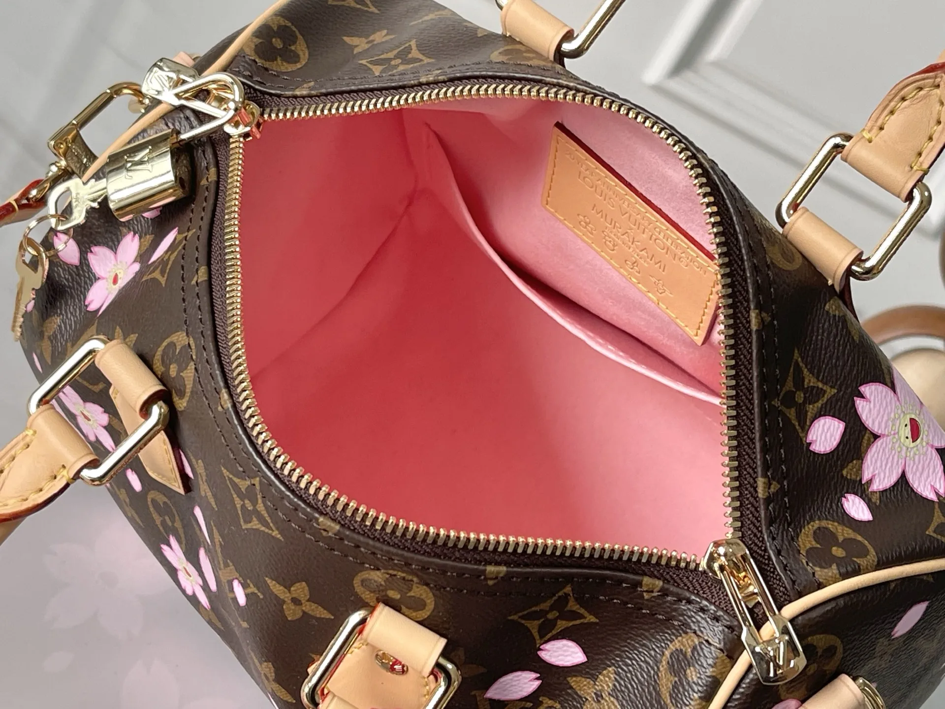 163C01 芯片版 款号 M14174 原单加强版 独家实拍背景图 本款 Speedy Bandouliere 25 手袋出自路易威登 x 村上隆复刻系列 为品牌经典 Monogram 涂层融入村上隆笔下灵动的 Cherry Blossom 图案 再令相同素延续至可拆卸包饰 牛皮革构筑 Toron 手柄与可拆卸皮革肩带 双拉链和挂锁确保个人物品安全无虞 25.0 x 19.0 x 15.0 厘米 (长 x 高 x 宽)