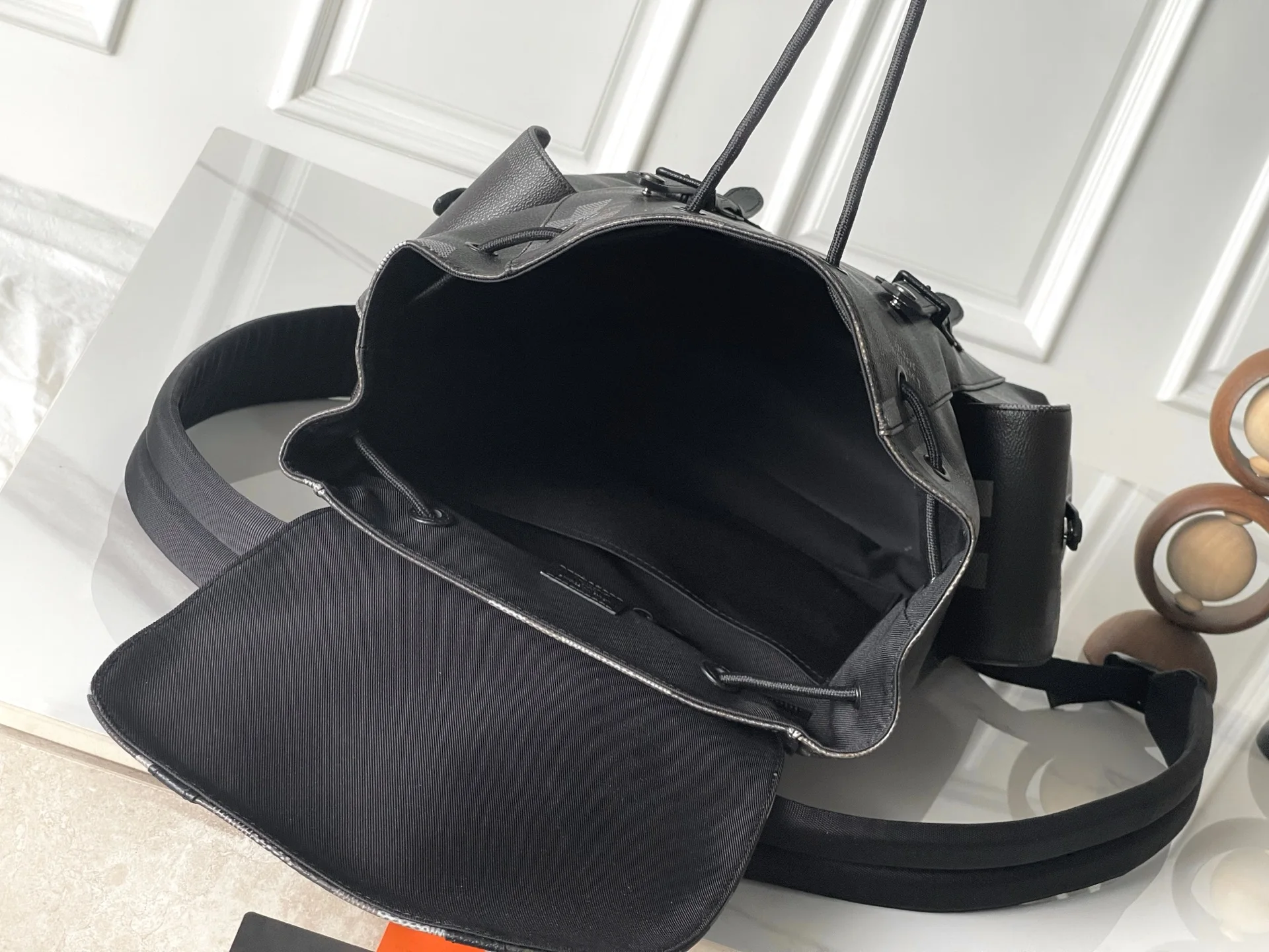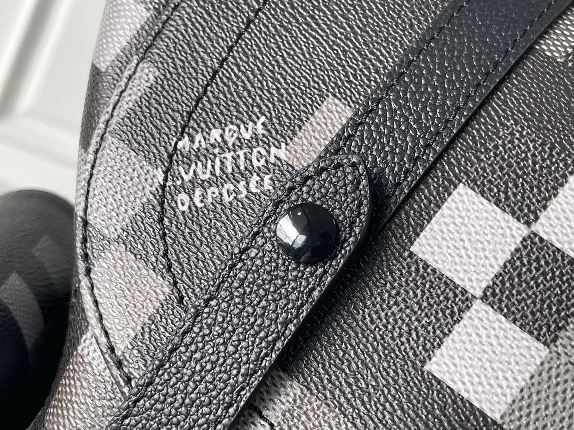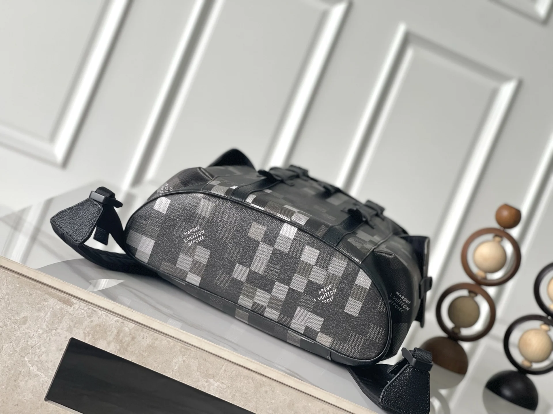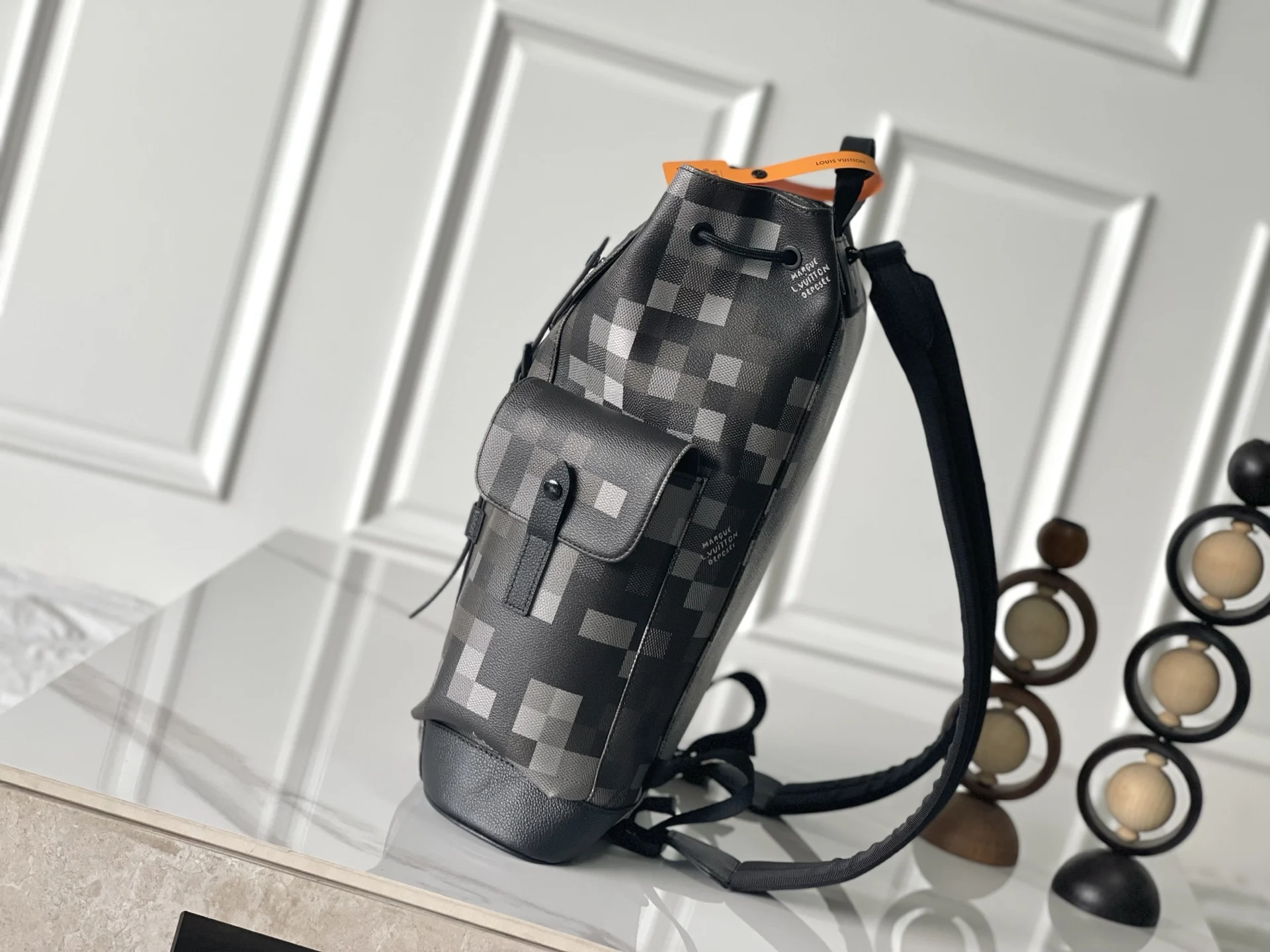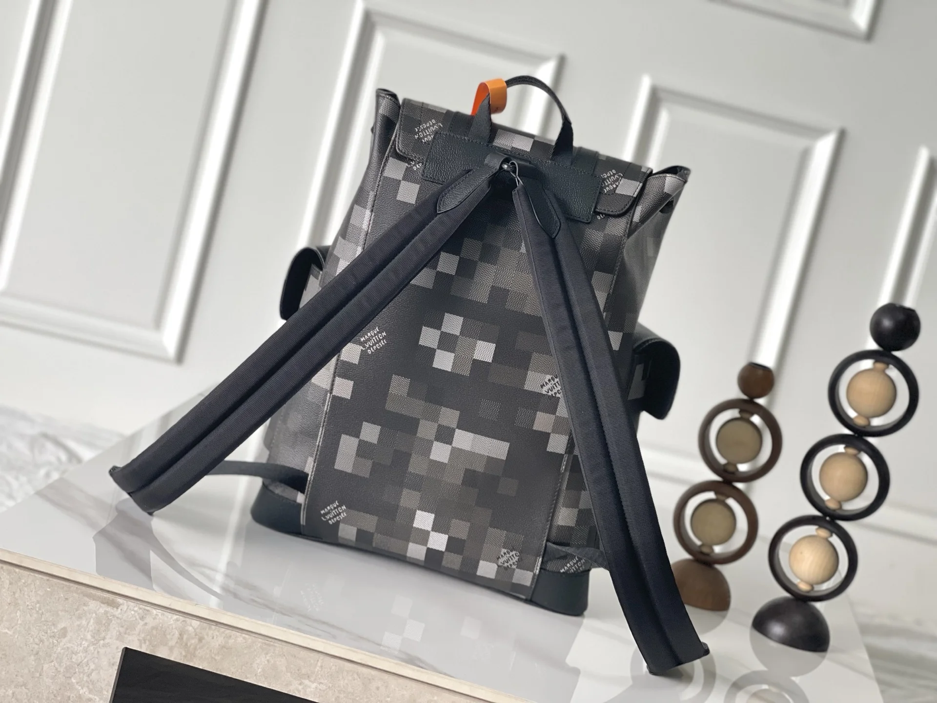 本款 M14952 Christopher 中号双肩包选用 Damoflage Black 帆布塑造摩登考究构型 并以像素效果重构经典 Damier 图案 Marque L. VuittonDeposee 标识亦融入其中 生动演绎超现代风尚 38 × 44 ×12.5厘米 长度×高×宽