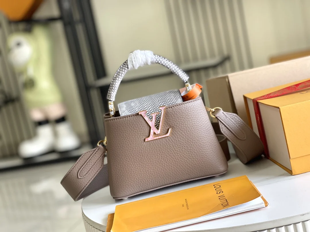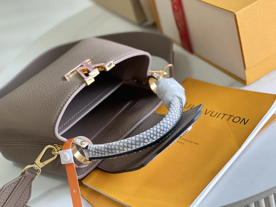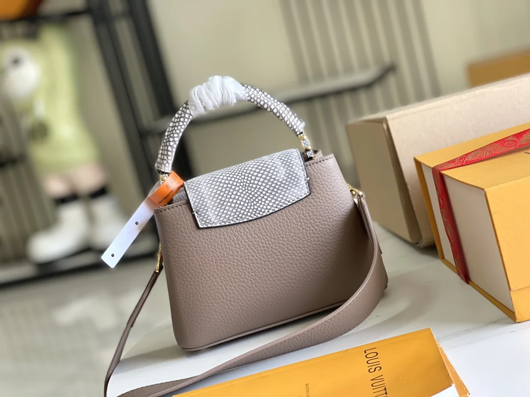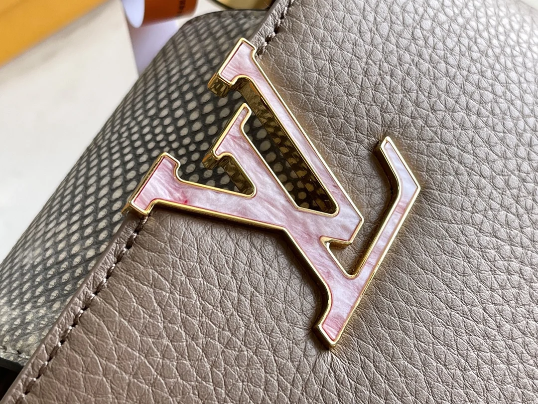 本款 Capucines Mini 手袋取材 Taurillon 皮革 以异域沙蛇皮革塑造翻盖和手柄 再将贝壳嵌入 LV 标识 可拆卸宽幅肩带方便斜挎和肩背 顶部手柄可供手提和肘挎