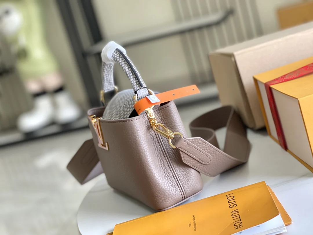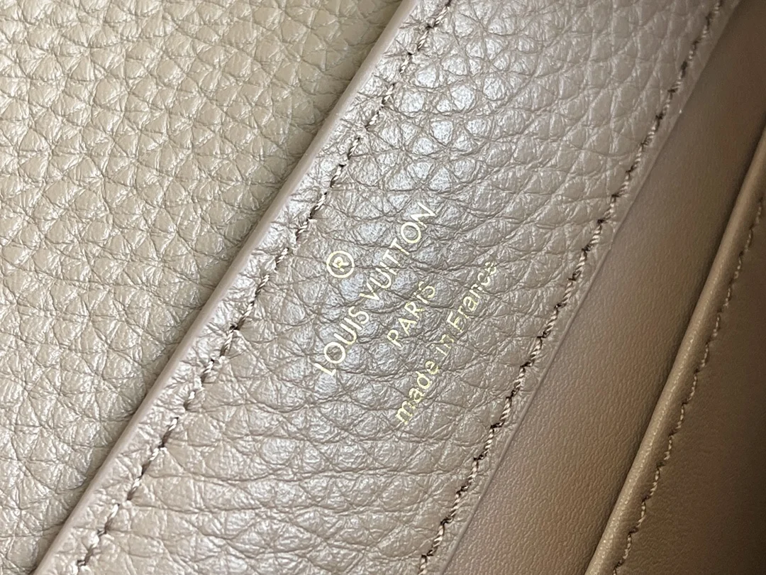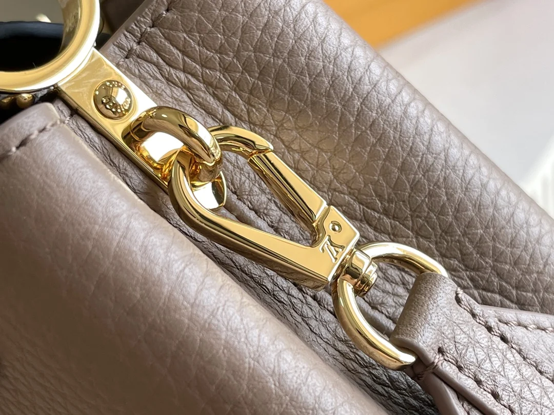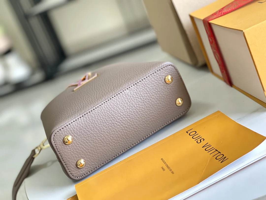 本款 Capucines Mini 手袋取材 Taurillon 皮革 以异域沙蛇皮革塑造翻盖和手柄 再将贝壳嵌入 LV 标识 可拆卸宽幅肩带方便斜挎和肩背 顶部手柄可供手提和肘挎