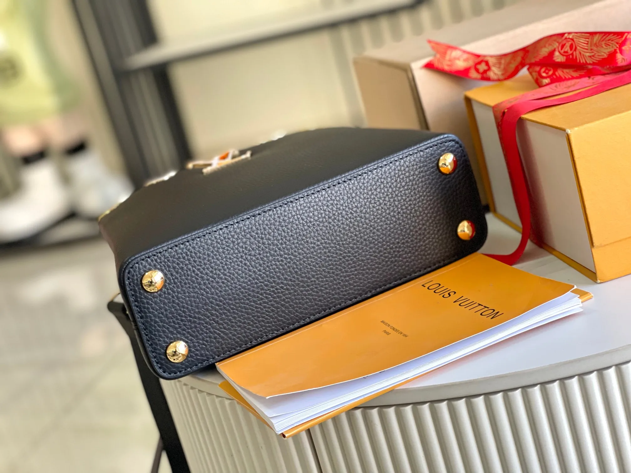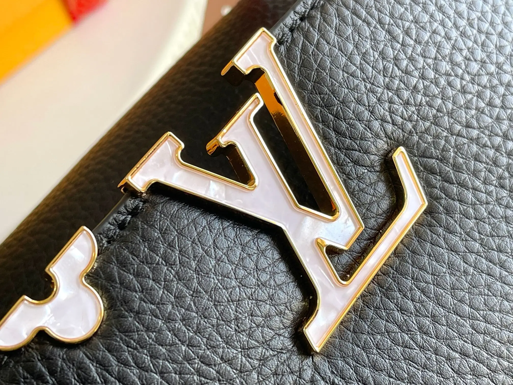 特级配全套包装 变码芯片 特级精品原厂皮 M23263小号 贝壳花冠黑色金扣 CapucinesBB手袋本季讲述全新的Capucines故事 精致的金属色Monogram花卉饰带 使此款经典手袋散发出更加柔美的气质 精致的白色包身搭配金色花冠装饰 优雅而实用