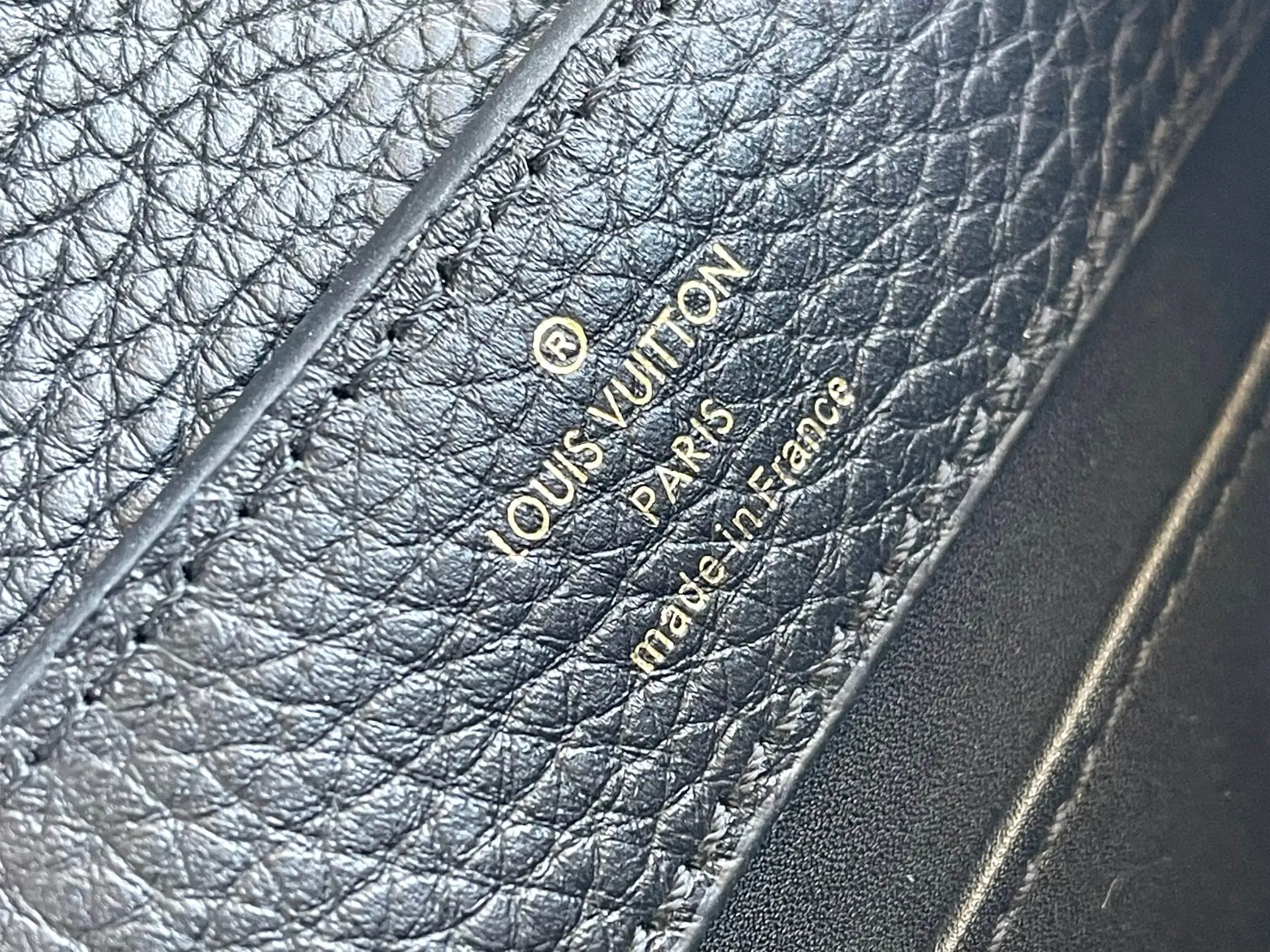 特级配全套包装变码芯片 特级精品原厂皮 M23263贝壳黑色金扣 贝壳花冠五金CapucinesMini迷你号 皮革包身的顶部边缘环绕花朵恰似经典 Monogram 花卉的绽放 为简约线条添缀一丝华美 本款CAPUCINES mini手袋彰显优雅奢华