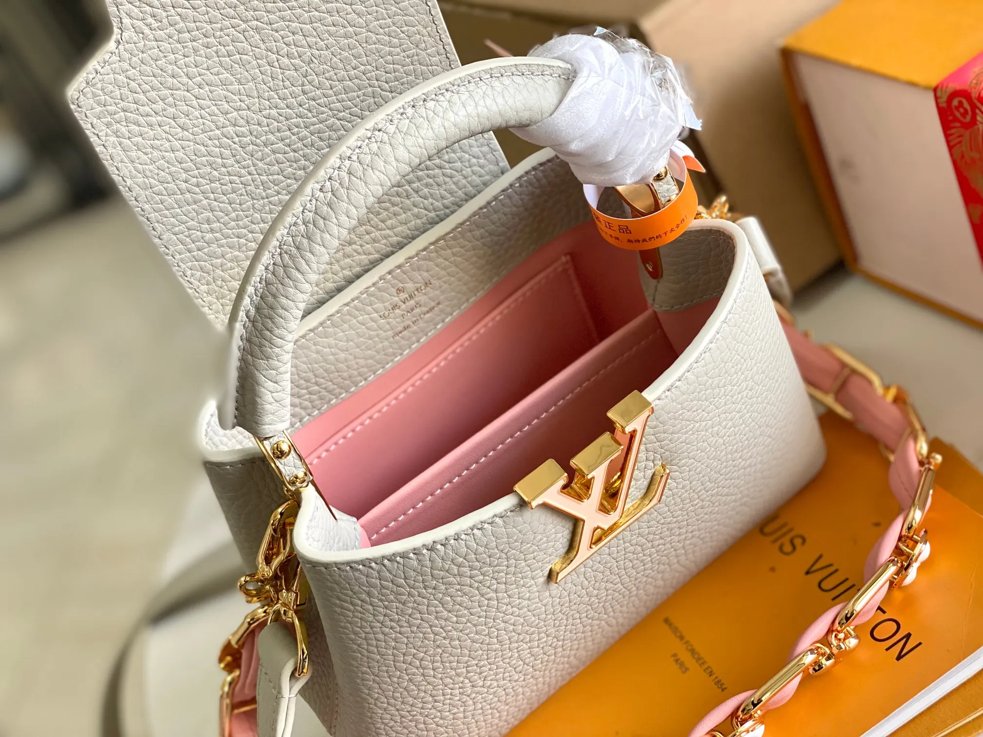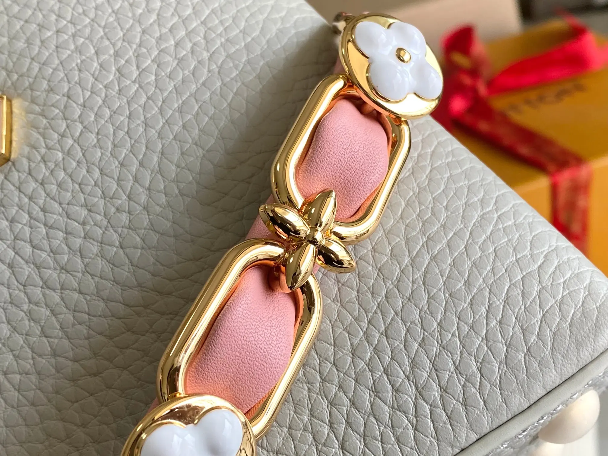 本季新款 Capucines 手袋彰显女性气质 金属链节与淡雅柔软牛皮革编织成精美链条 珐琅及饰面 Monogram 花卉错落点缀其上 珐琅品牌标识烘托出珠宝质感 更令手袋美不胜收