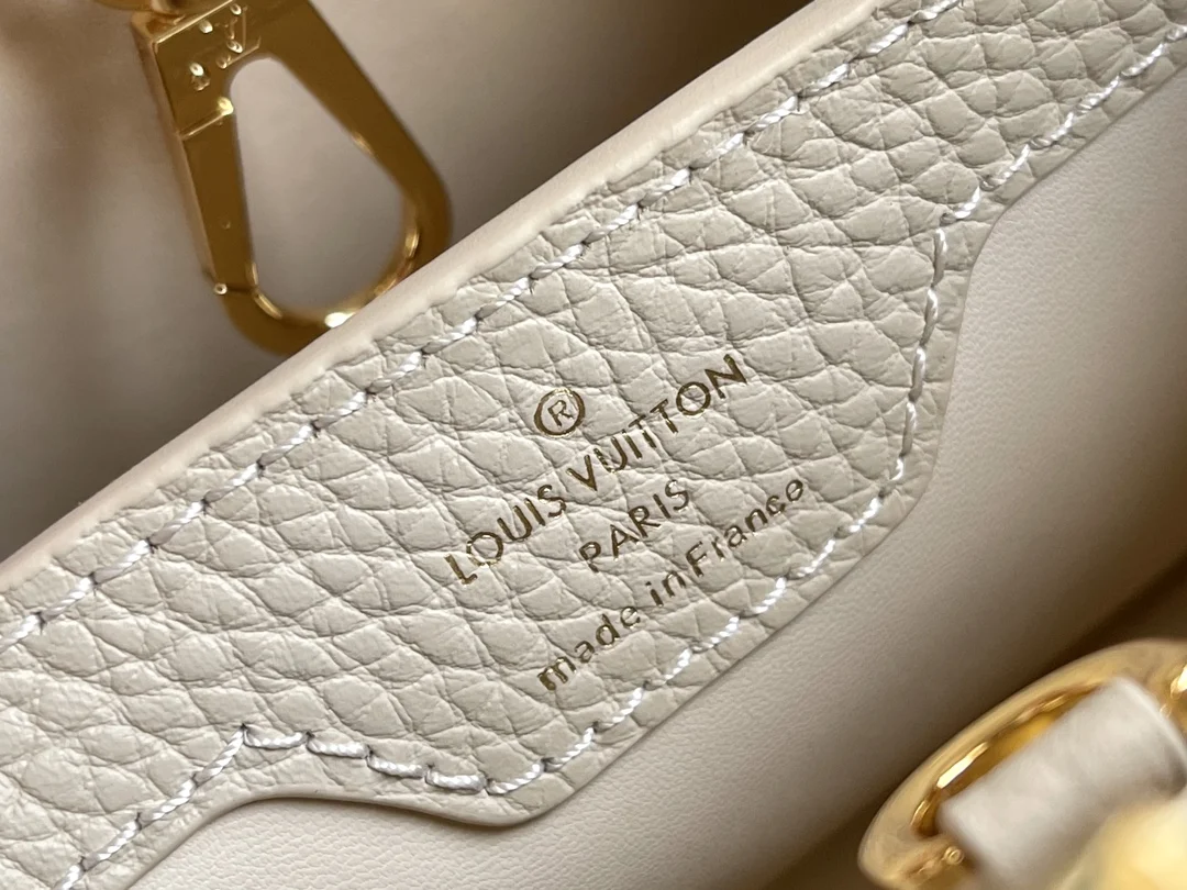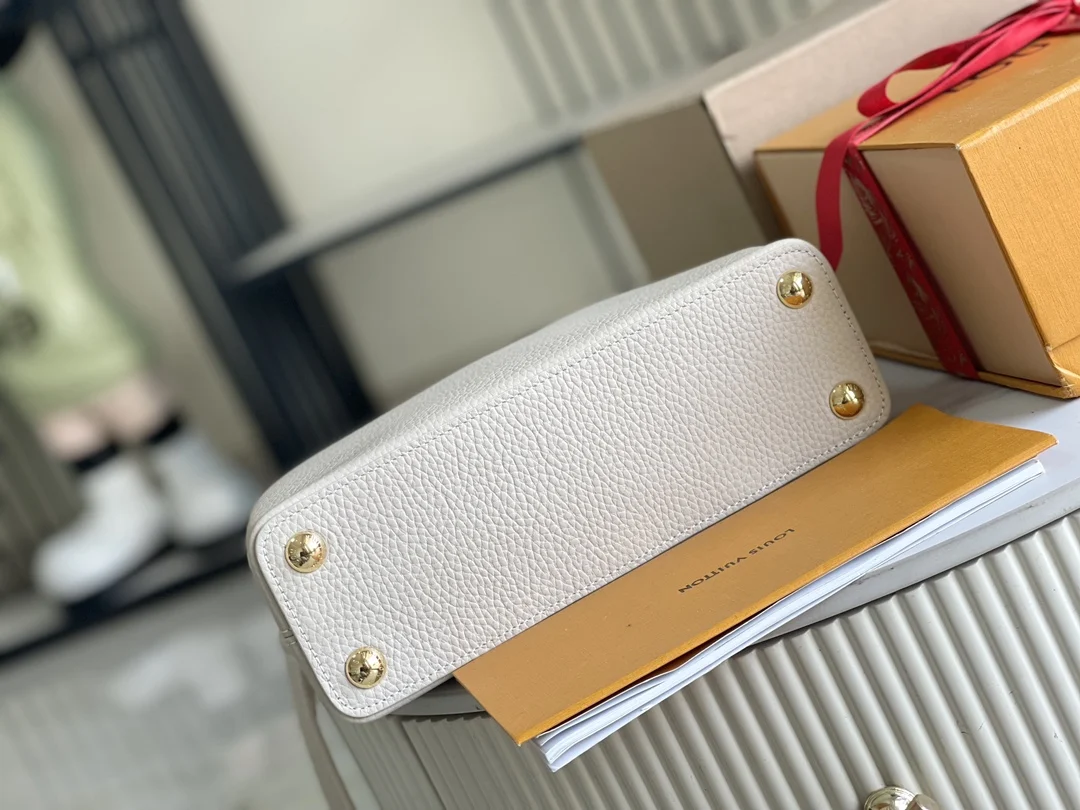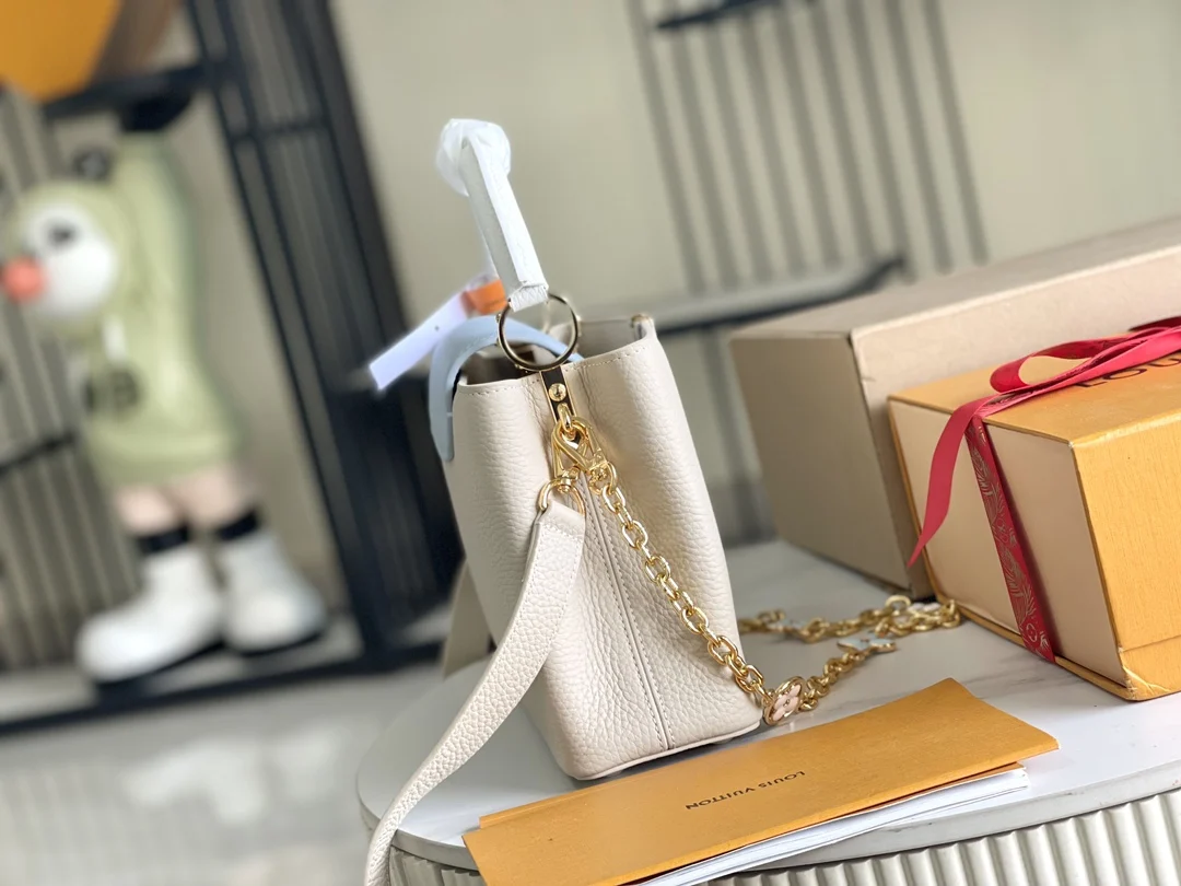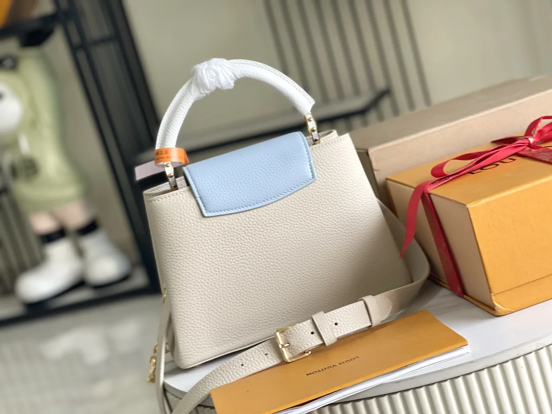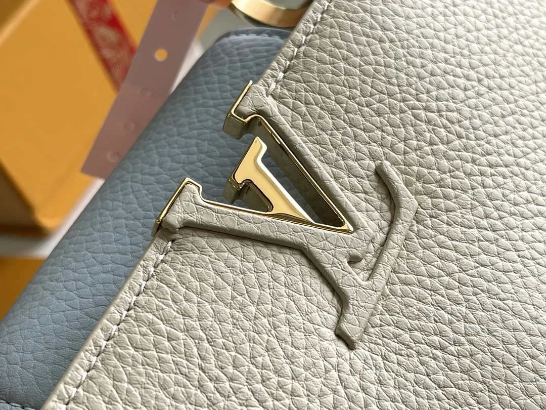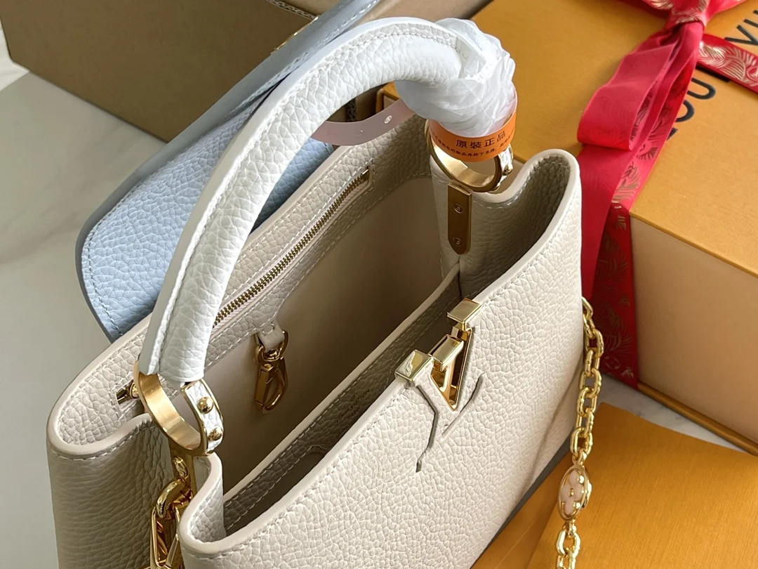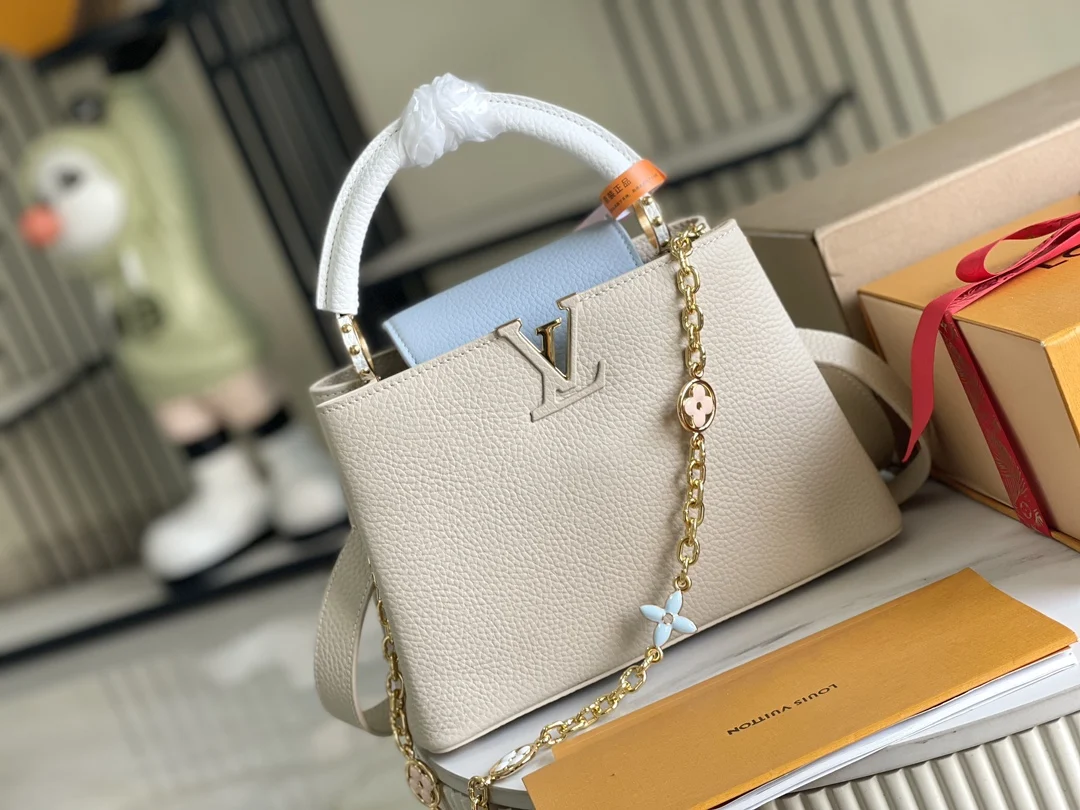 特级配全套包装 变码芯片 特级精品原厂皮 M23950 白蓝小号升级版五金 本款 Capucines 迷你手袋取材 Taurillon 皮革 以珐琅 Monogram 花簇和耀目链环构筑花卉链条 每只花卉均通过手工抛光和上釉显色 彰显品牌精湛匠艺 尺寸 27 x 18 x 9 厘米