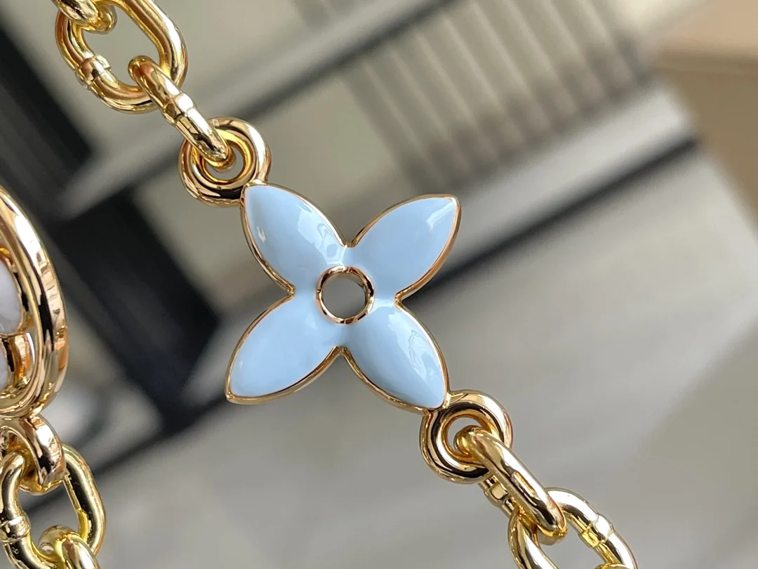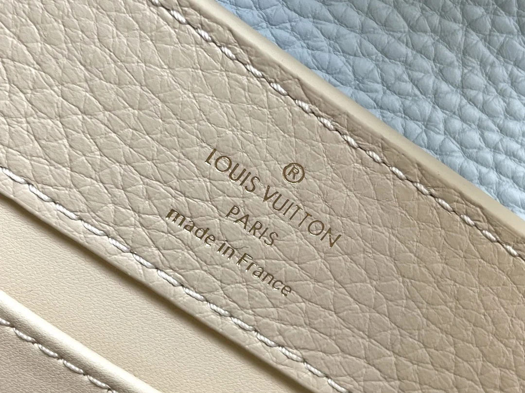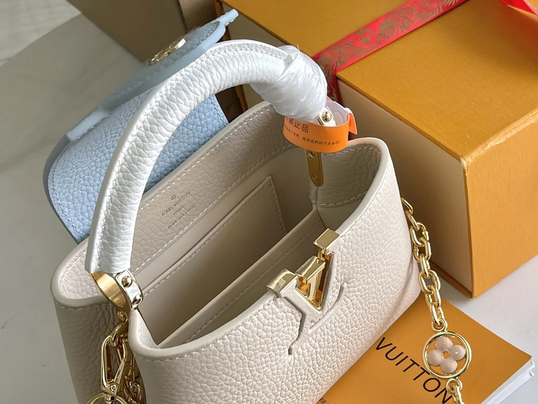 特级配全套包装P变码芯片 特级精品原厂皮 M23950 奶白拼蓝 升级版五金 本款 Capucines 迷你手袋取材 Taurillon 皮革 以珐琅 Monogram 花簇和耀目链环构筑花卉链条 每只花卉均通过手工抛光和上釉显色 彰显品牌精湛匠艺 尺寸 21x 14x 8 厘米