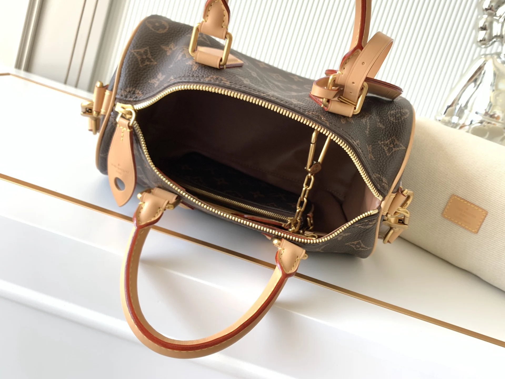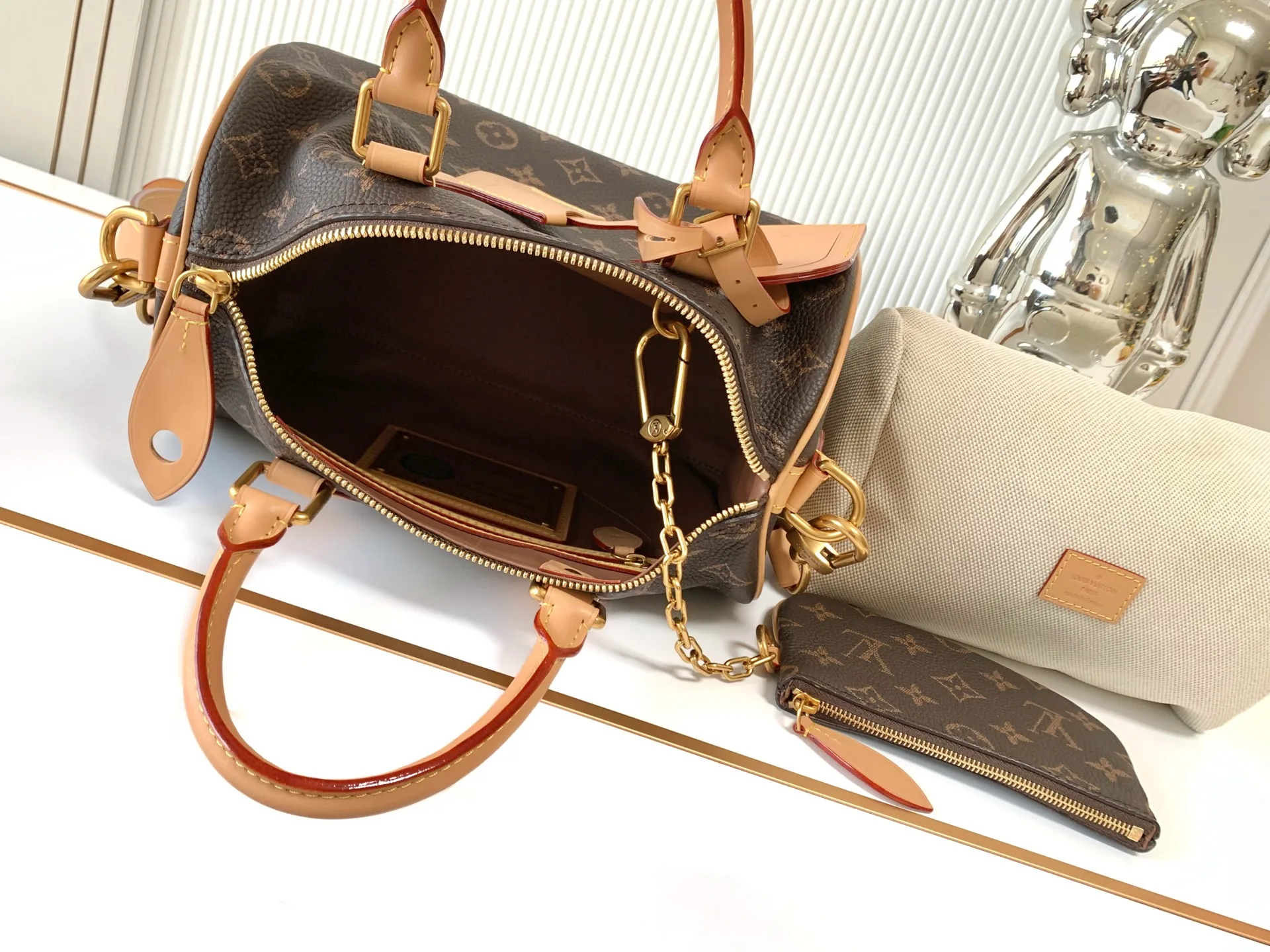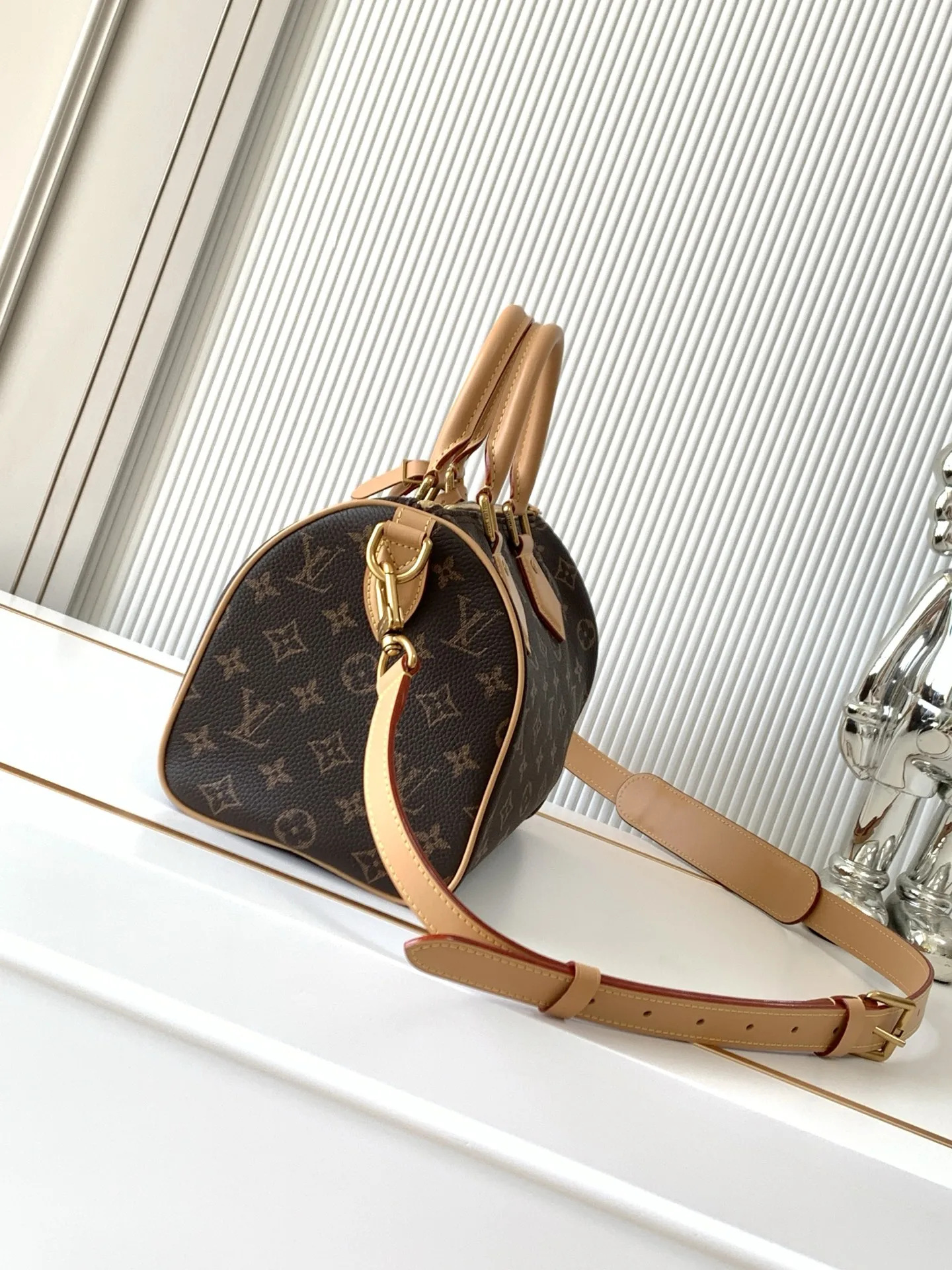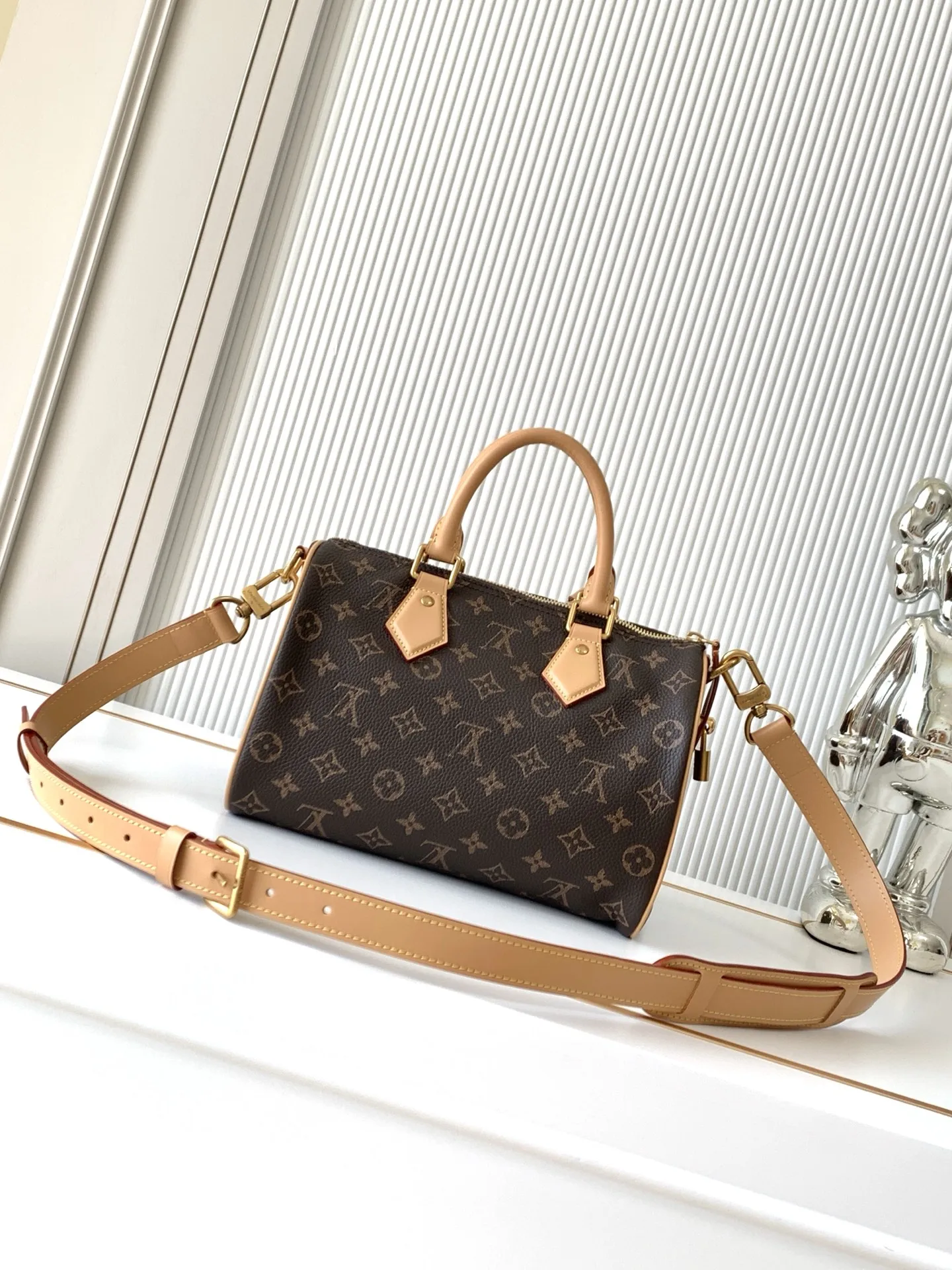 全钢五金 MB163c01变码芯片 款号M24443老花 本款Speedy P9 Bandouliere25手袋结合牛皮革包身和皮革饰边 兼具潮流格调与功能考量 肩带:可拆卸 可调节包带半长:55.0厘米