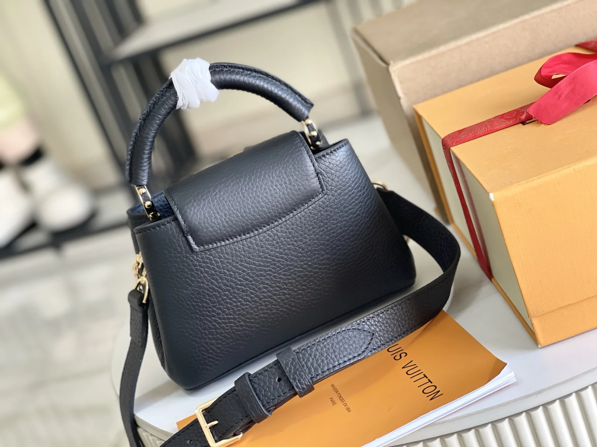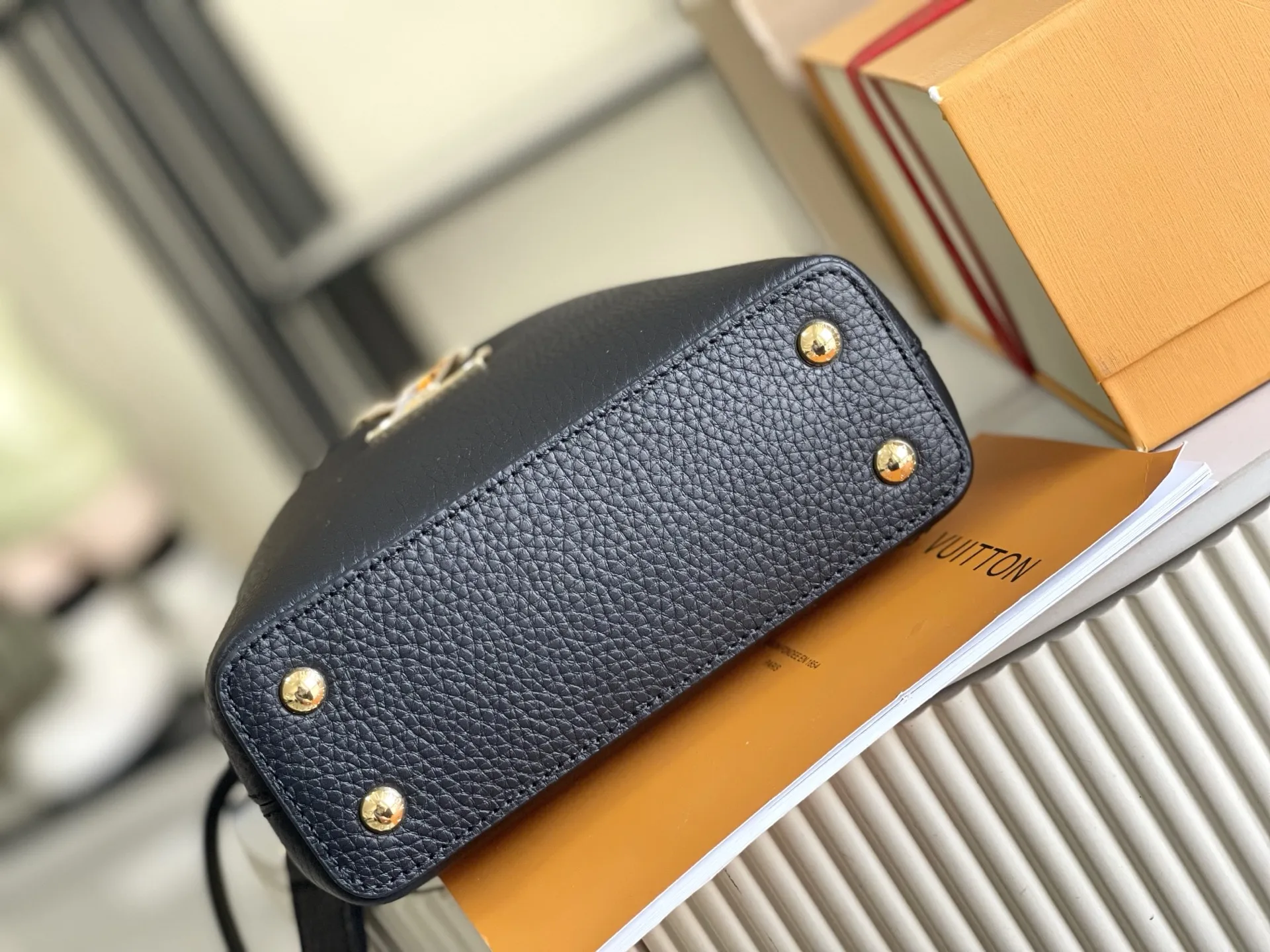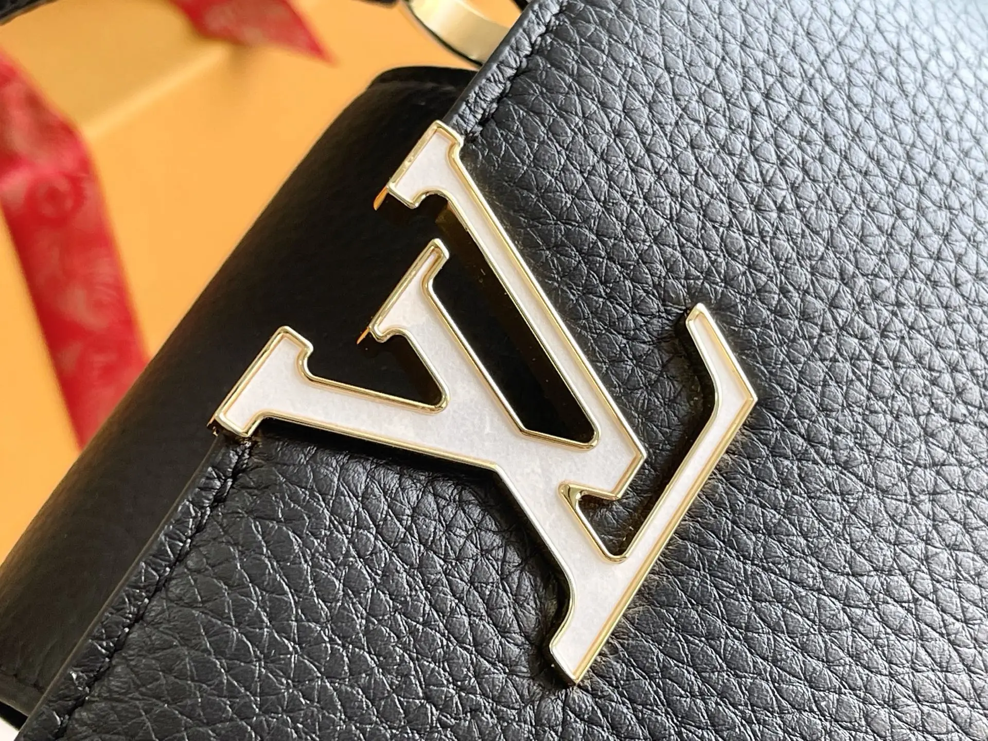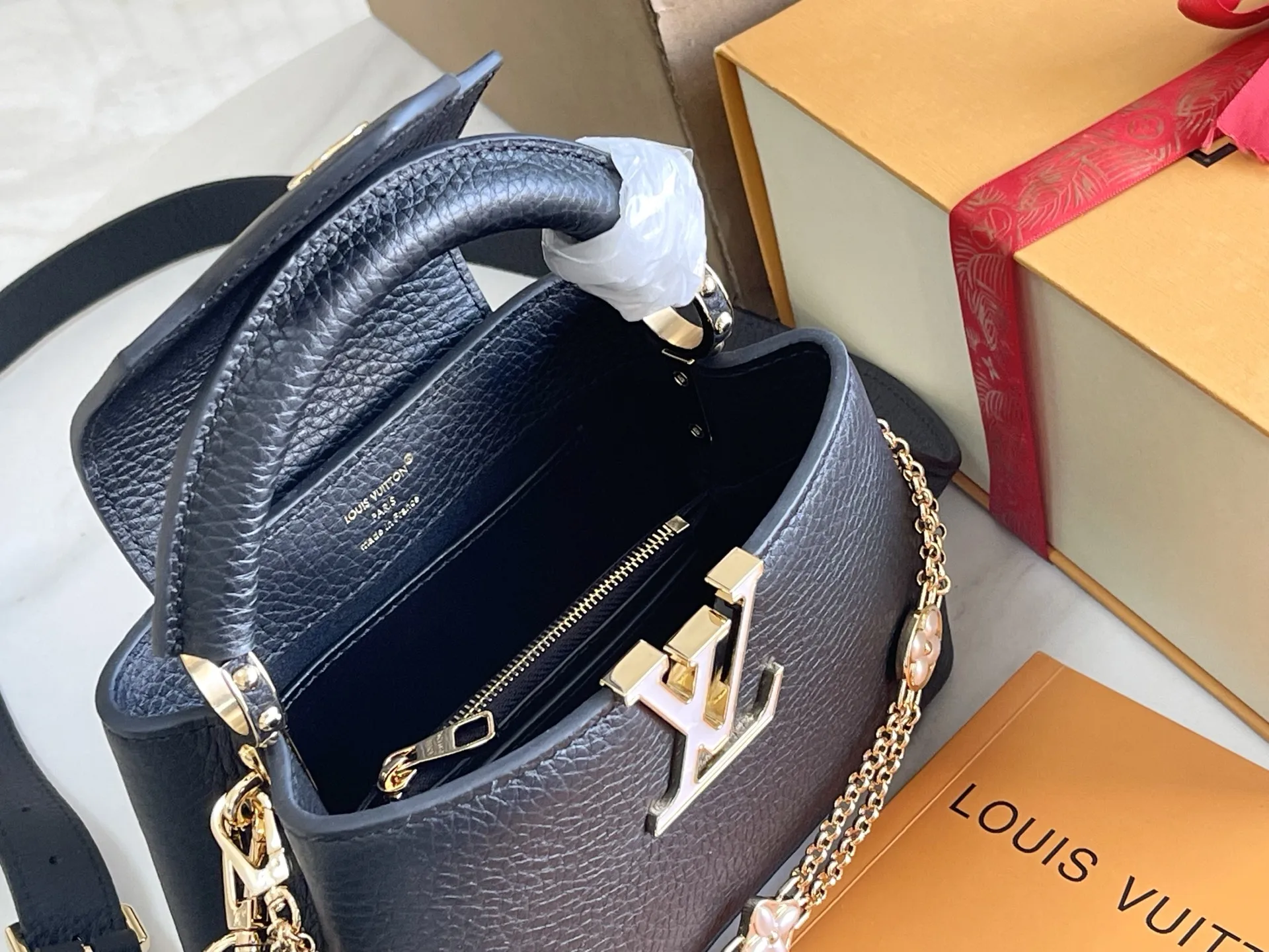 163 芯片 特级精品原厂皮M25461 黑色迷你 升级版五金 Capucines mini 手袋 由全粒面Taurillon皮革制成节 体现了安静的奢华 标志性的LV签名由有光泽的珍珠母制成 为这件作品增添了谨慎的微光 该包的紧凑尺寸掩盖了其实际容量 它将容纳两部智能手机 一个长钱包和其他必需品 尺寸 21 x 14 x 8 厘米
