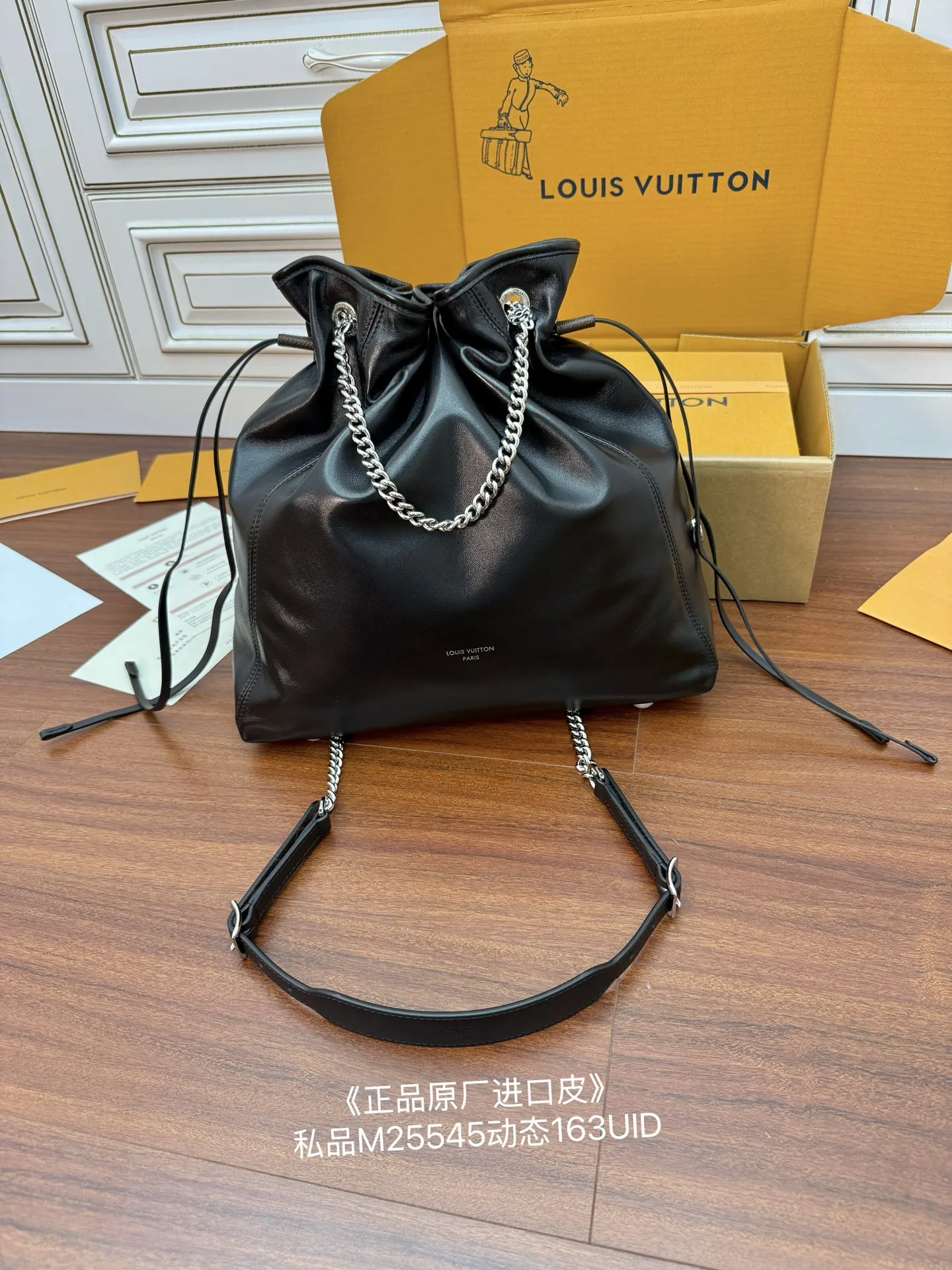 独家(正品原厂进口皮)首发型号 M25545私品 163动态UID 进口菱形面料 品质和材料第九次再次升级 专柜同步 动态电子芯片 礼品袋 保护纸 铜版电子标签 合格证 皮料是正品代工厂意大利A级树膏皮 私品 是在于品质 五金 面料 手工 油边 是A级出品 拍摄图跟产品一致丶配图上的全套包装.尺寸 33x24x11.5CM