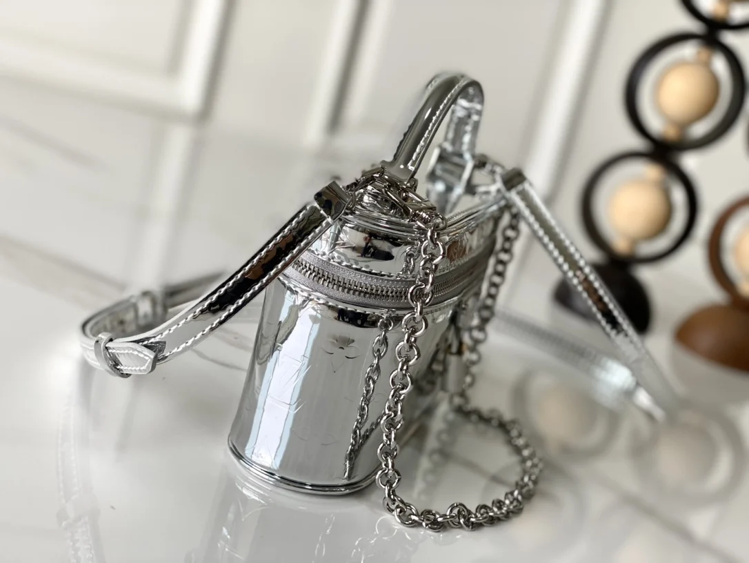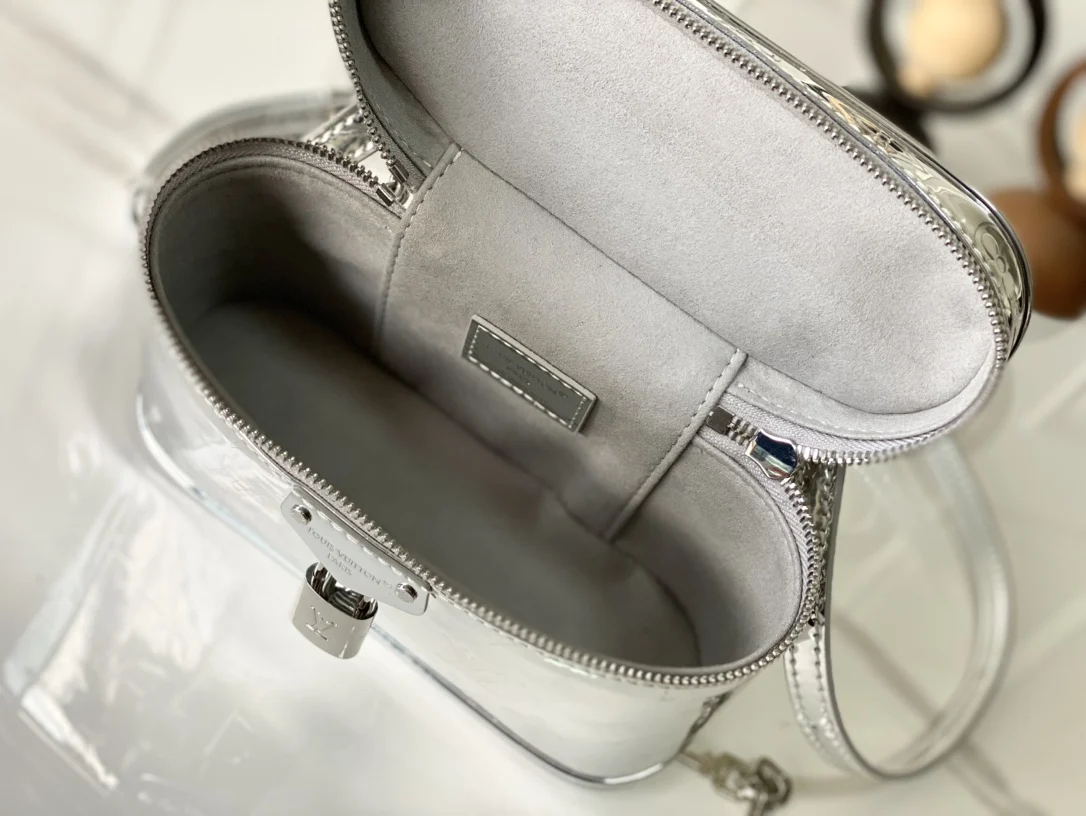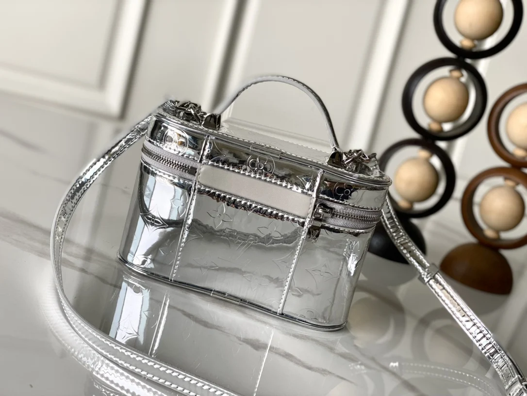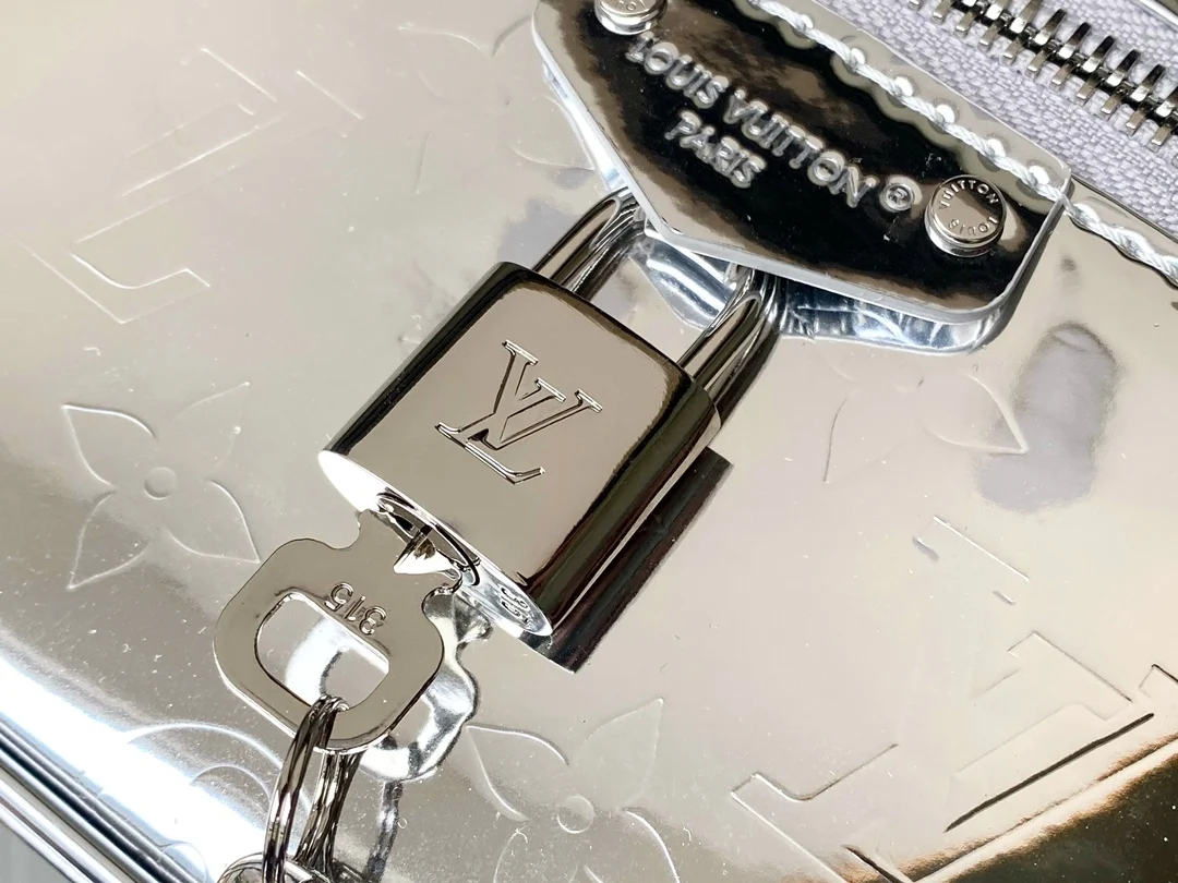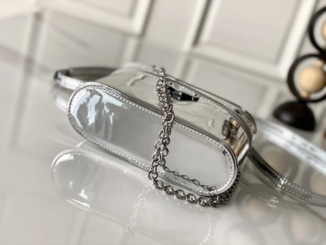 本款 Vanity Chain Pouch 手袋出自 LV Ski 系列 向品牌传统化妆箱汲取灵感 以 Monogram Miroir 帆布诠释旅行精神 LV 字母铭纹挂锁 可拆卸肩带和链条彰显考究细节 包带半长可调至 58.0 厘米