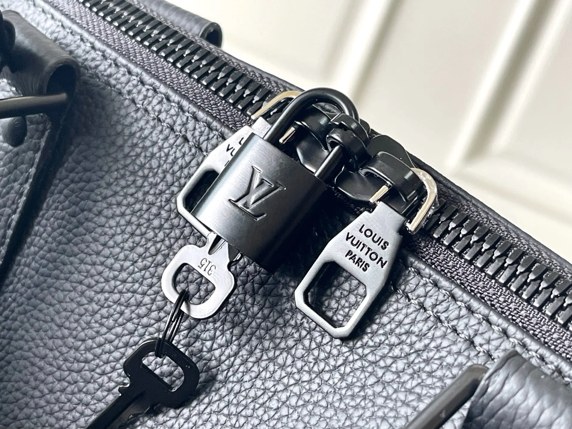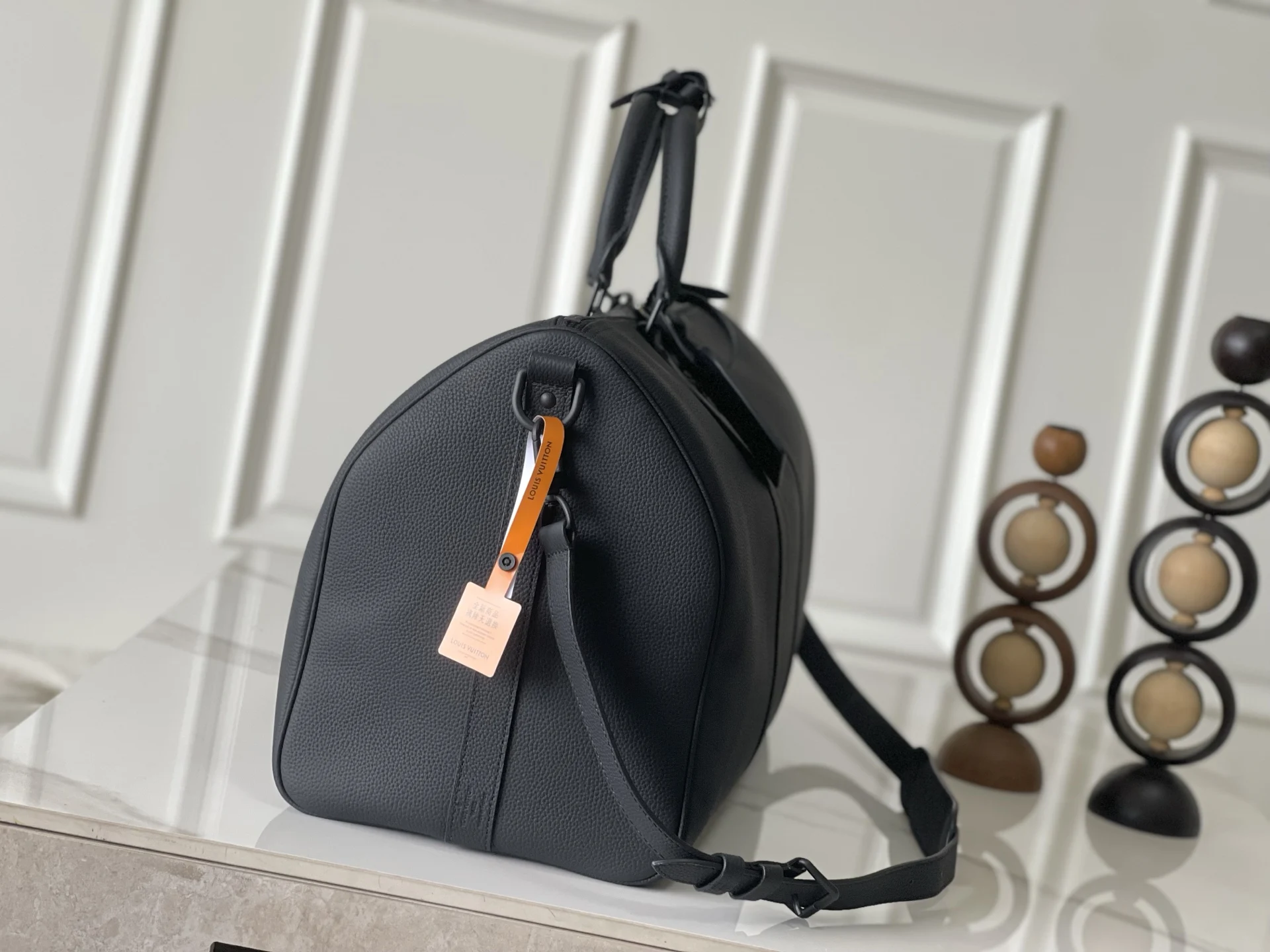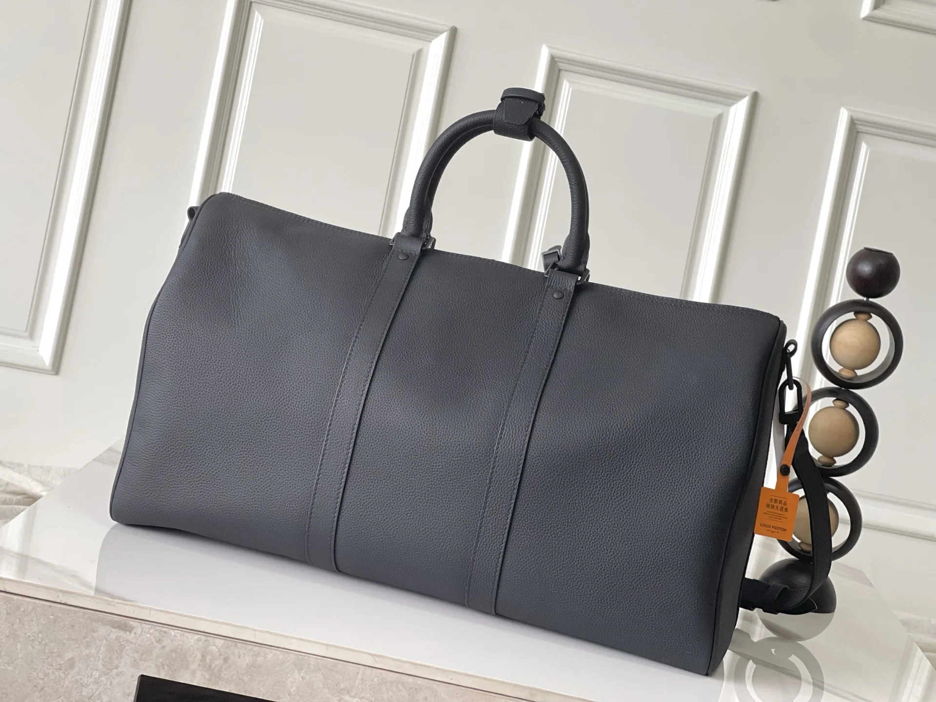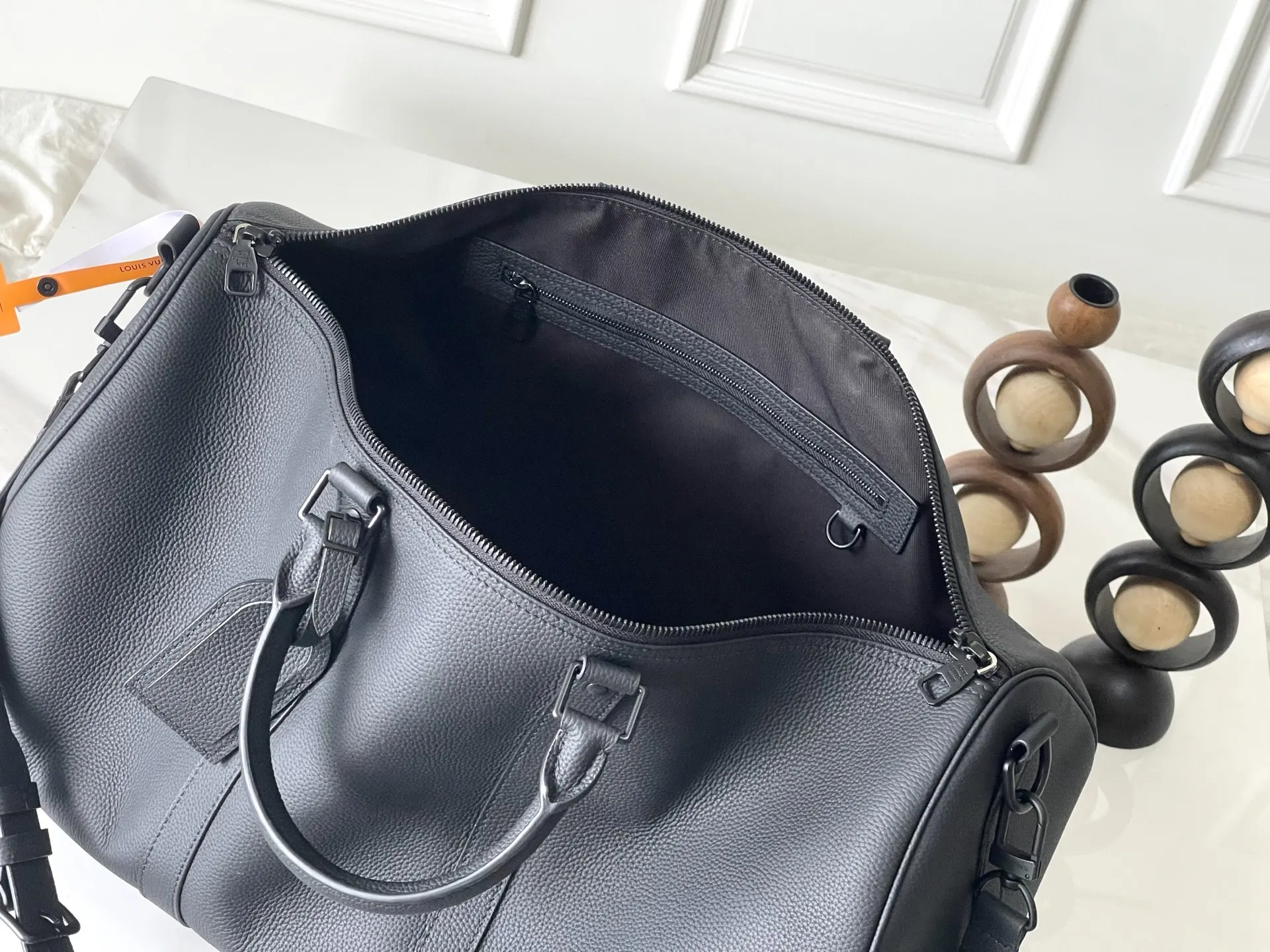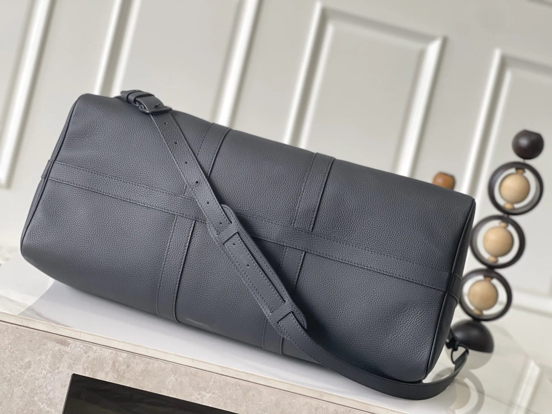 独家实拍 M26118 本款 Keepall Bandouliere 50 旅行袋取材蜡面牛皮革和织物内衬 成就周末出行佳选 细腻粒面软皮革和 LV 字母标识缓缓流露优雅格调 顶部手柄和可拆卸并调节的肩带实现多种背携方式 29 x 23 x 50 厘米 (高 x 宽 x 长度)