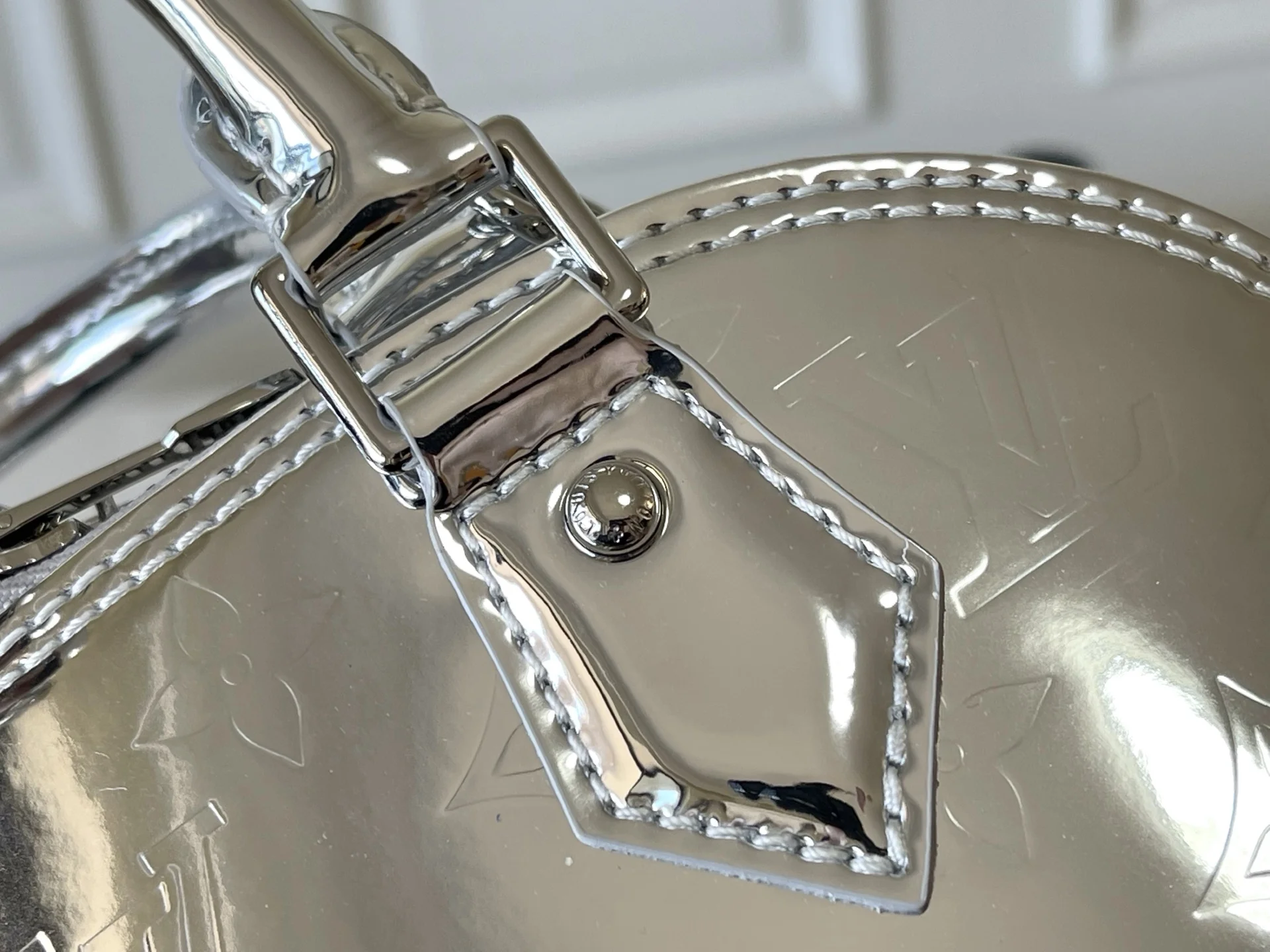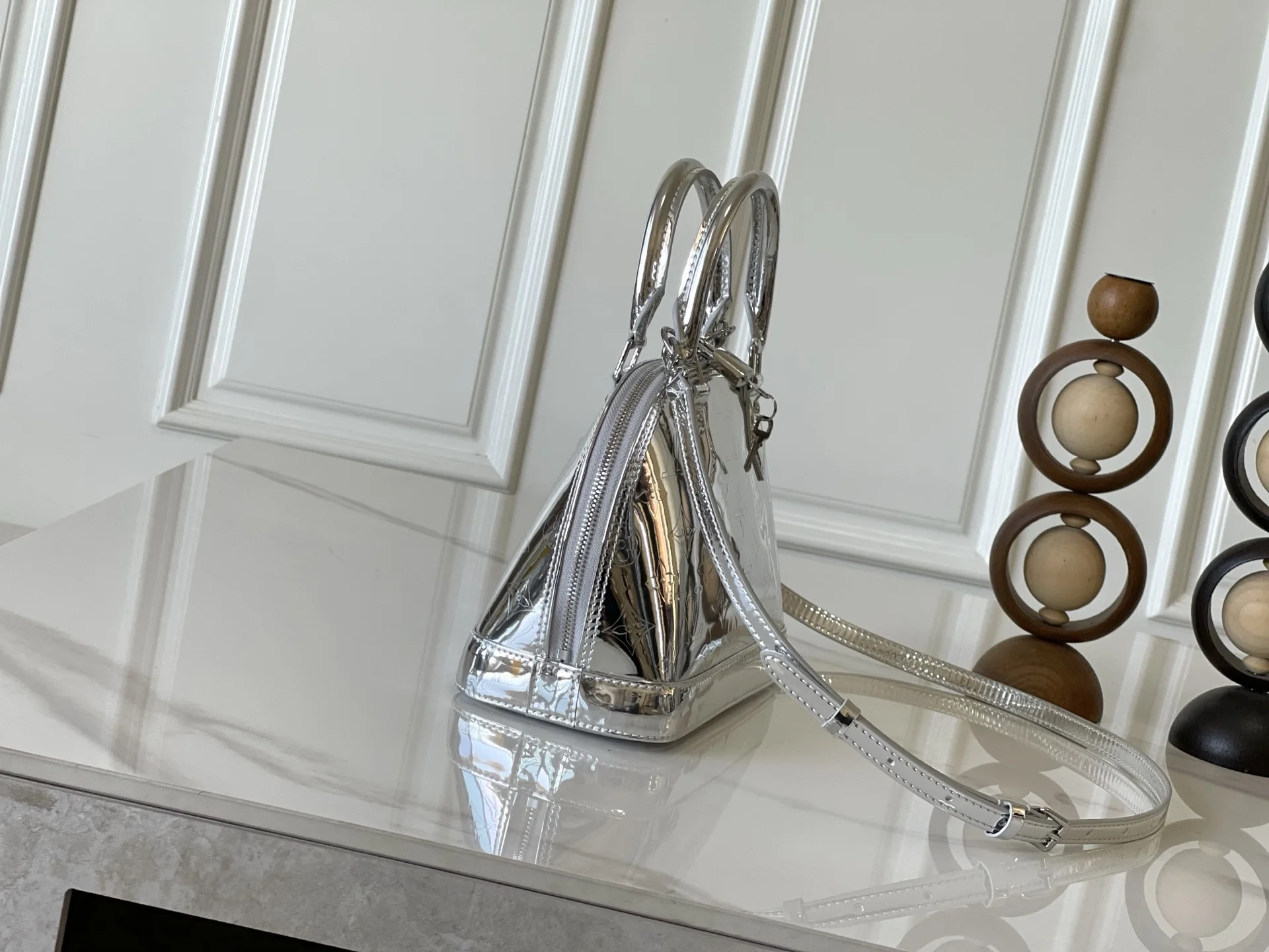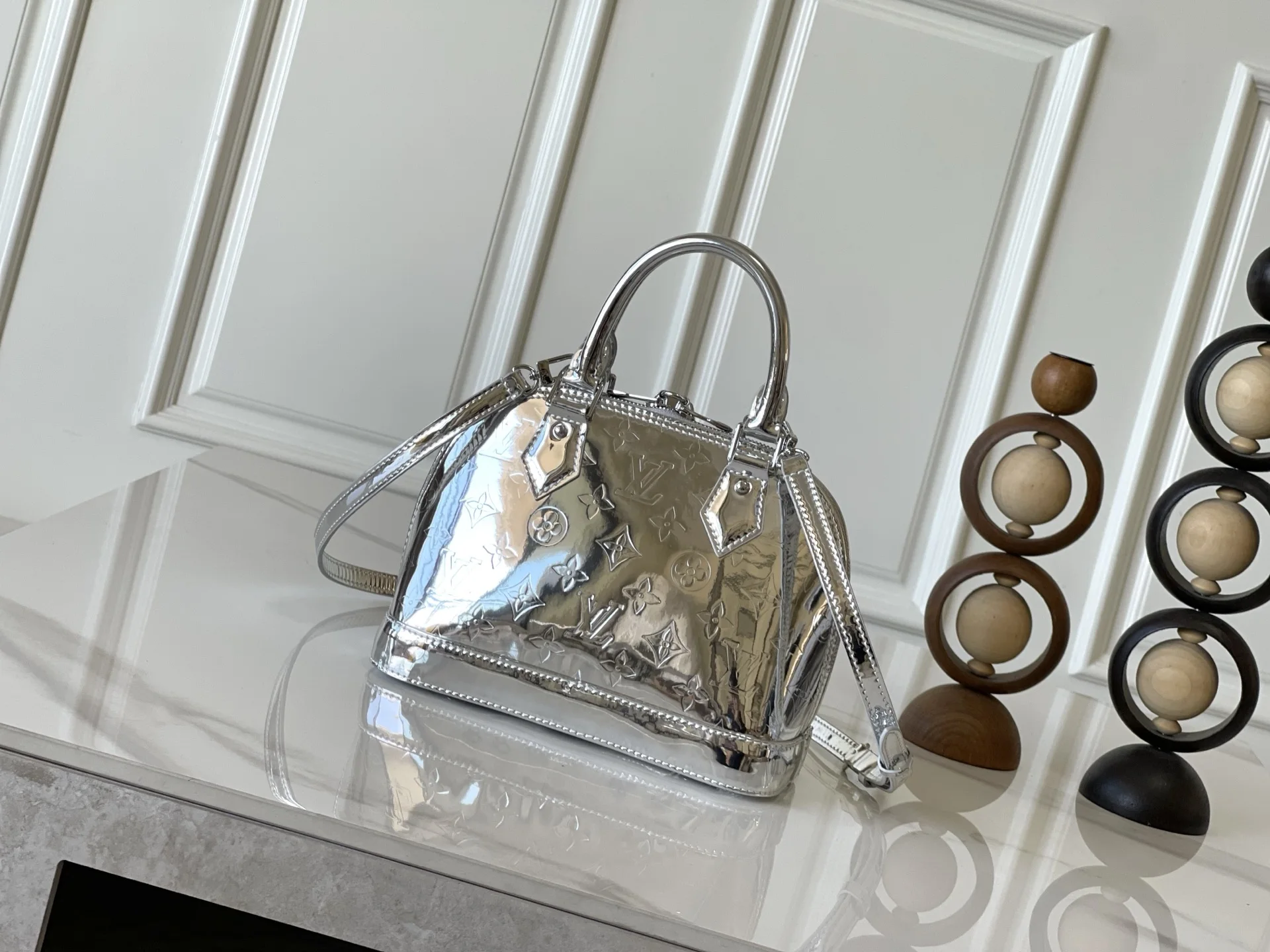 本款 Alma BB 手袋以本季科技细节彰显 LV Ski 系列风范 Monogram Miroir 耐候帆布表面浸染 Silver 色调 搭配同色金属件 释放璀璨光芒 可为任意着装注入复古未来主义格调 LV 标识挂锁与可拆卸肩带完善整体 23.5 x 17.5 x 11.5 (厘米) ((长 x 高 x 宽)