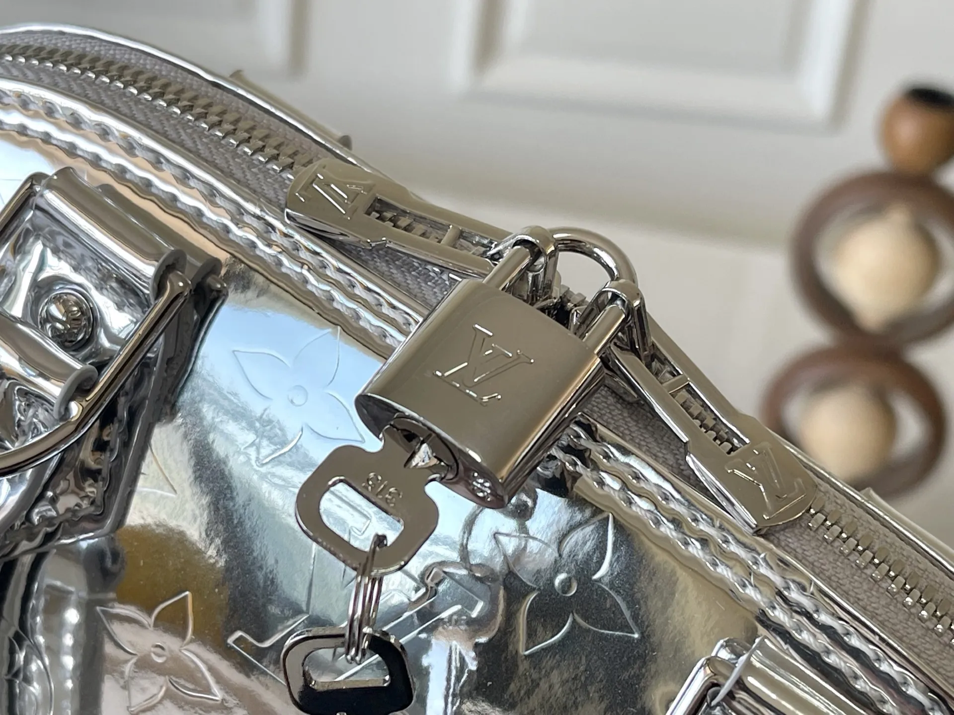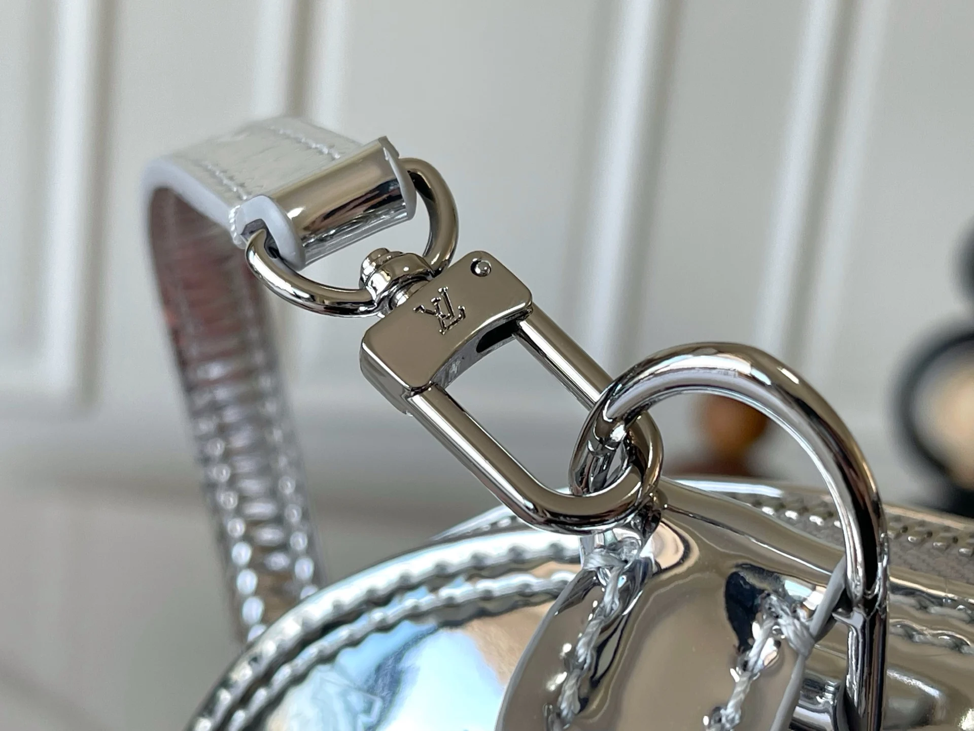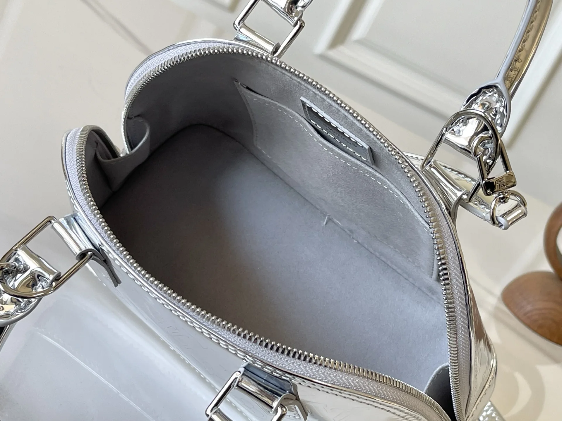 本款 Alma BB 手袋以本季科技细节彰显 LV Ski 系列风范 Monogram Miroir 耐候帆布表面浸染 Silver 色调 搭配同色金属件 释放璀璨光芒 可为任意着装注入复古未来主义格调 LV 标识挂锁与可拆卸肩带完善整体 23.5 x 17.5 x 11.5 (厘米) ((长 x 高 x 宽)