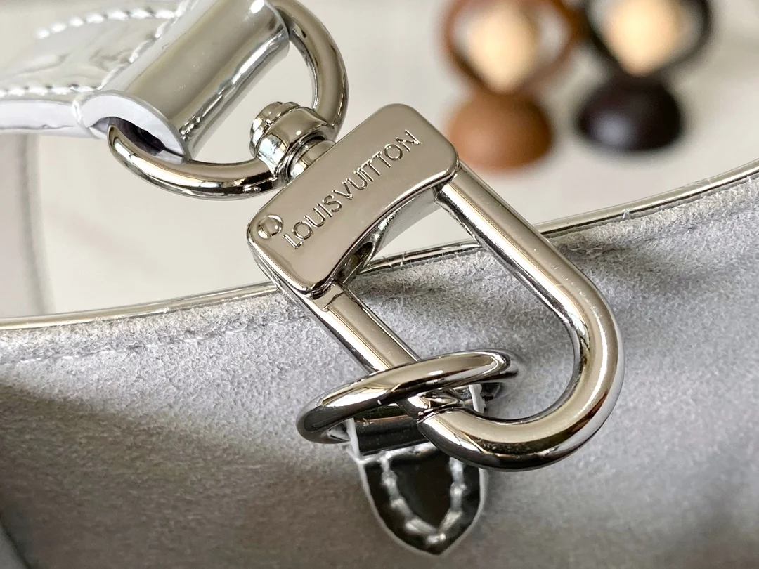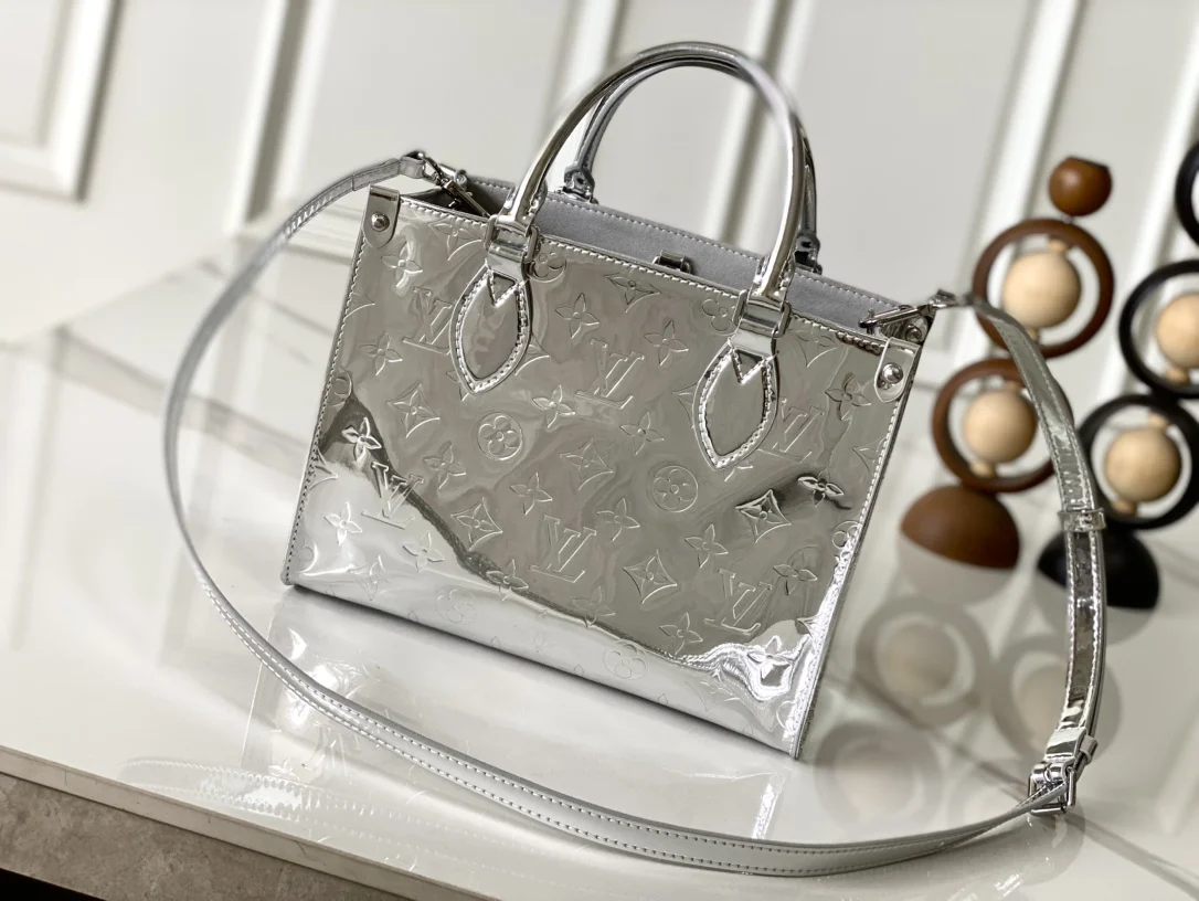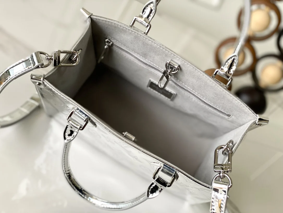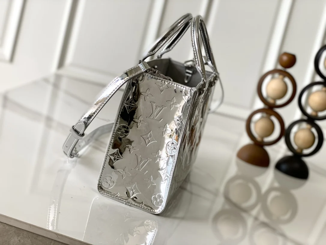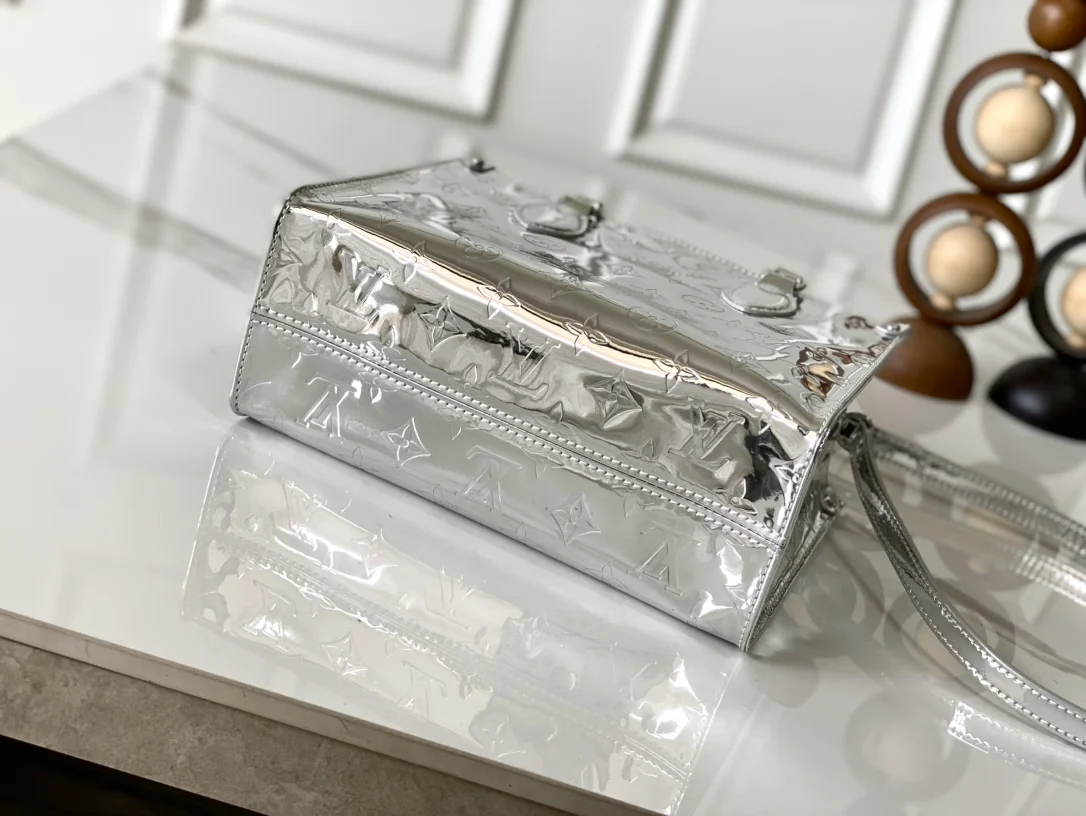 本款 OnTheGo 小号手袋以 Monogram Miroir 版本加入 LV Ski 系列 覆膜帆布确保经久耐用 Silver 色调与同色金属件共释熠熠光芒 肩带 可拆卸 不可调节