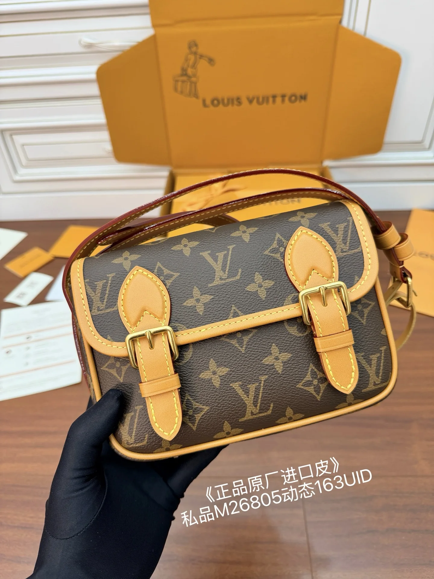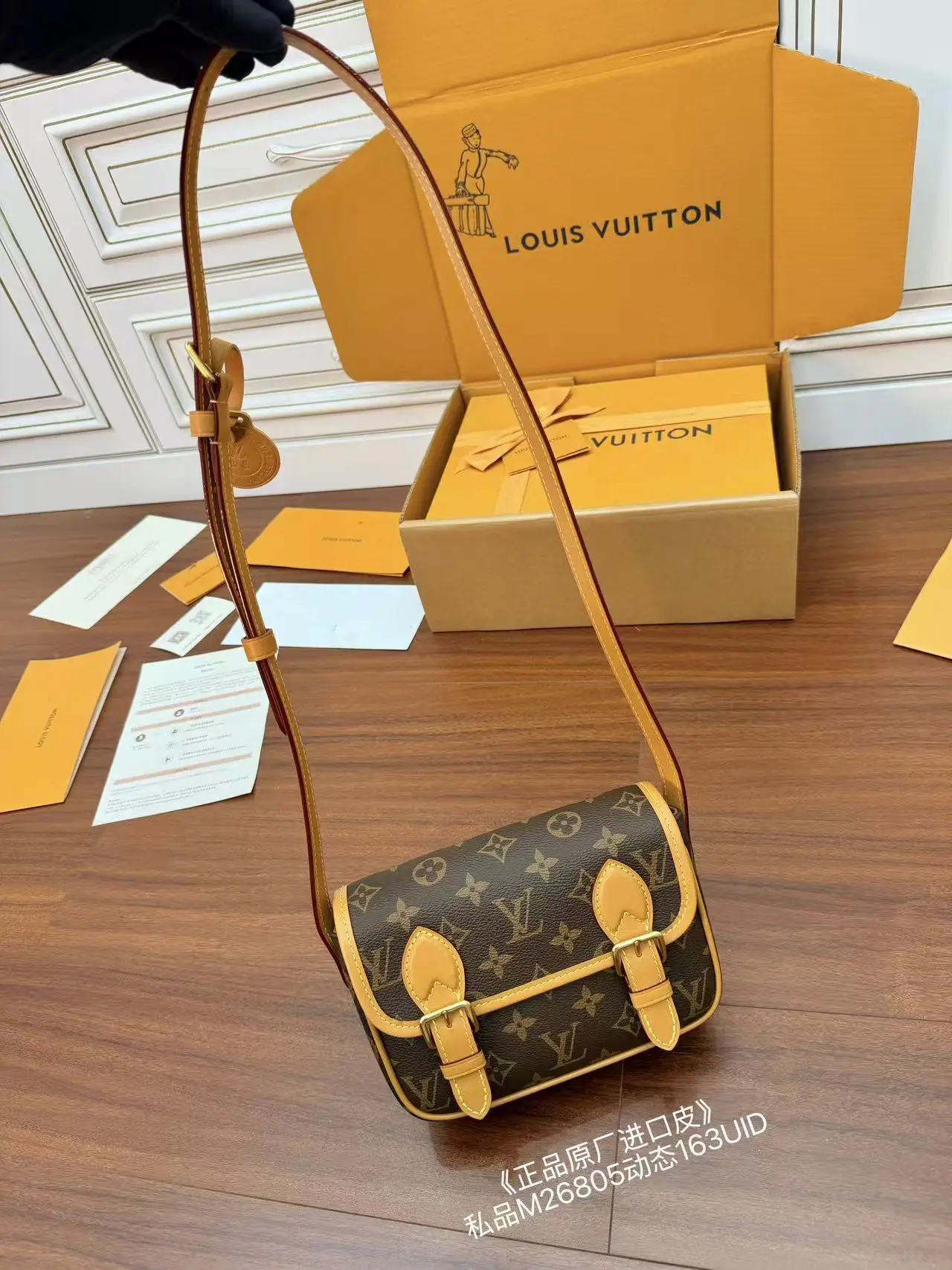 独家(正品原厂进口皮)首发型号 M26805私品 163动态UID 进口菱形面料 品质和材料第九次再次升级 专柜同步 动态电子芯片 礼品袋 保护纸 铜版电子标签 合格证 皮料是正品代工厂意大利A级树膏皮 私品 是在于品质 五金 面料 手工 油边 是A级出品 拍摄图跟产品一致丶配图上的全套包装.尺寸 19.5x15x6CM