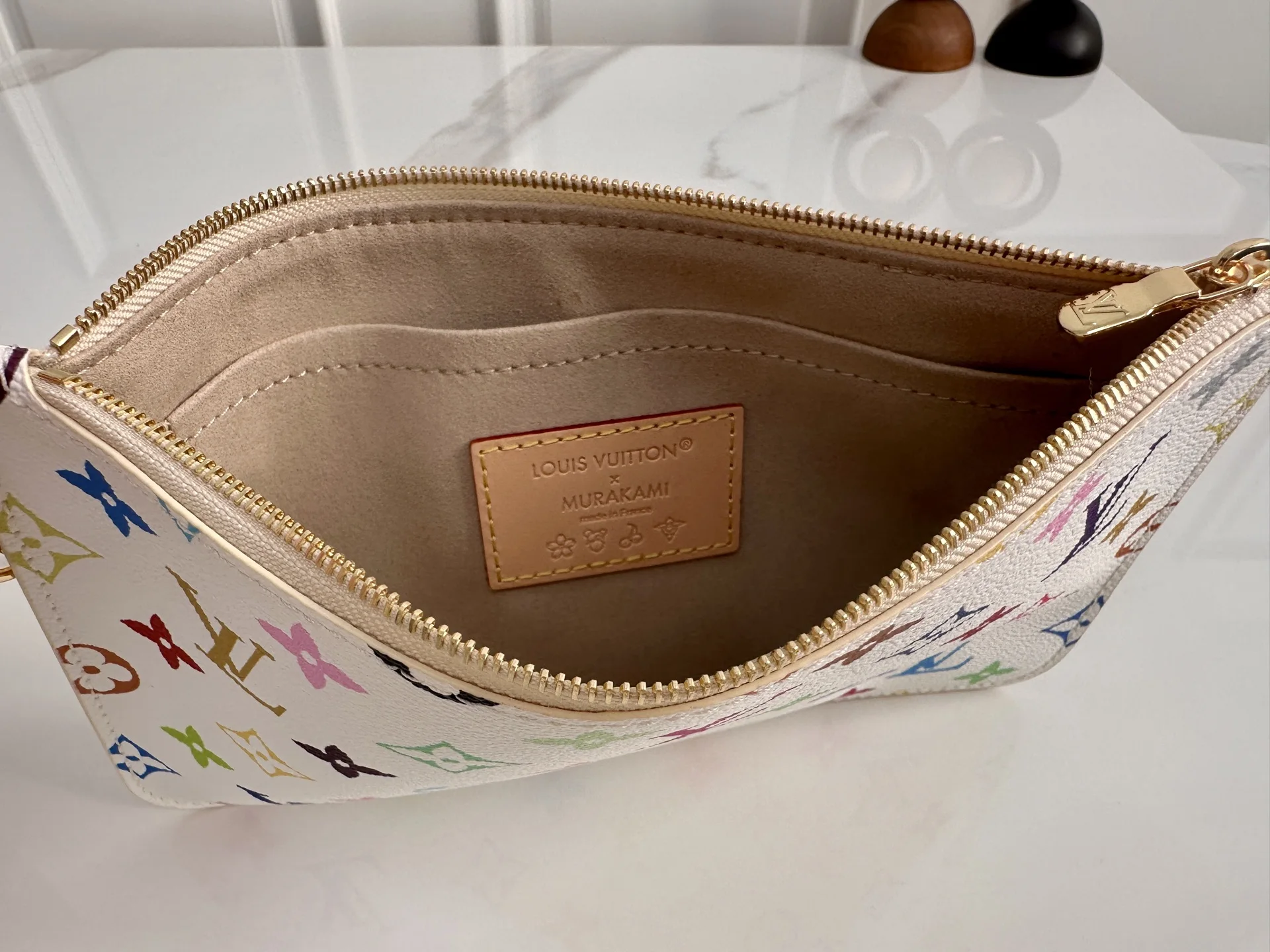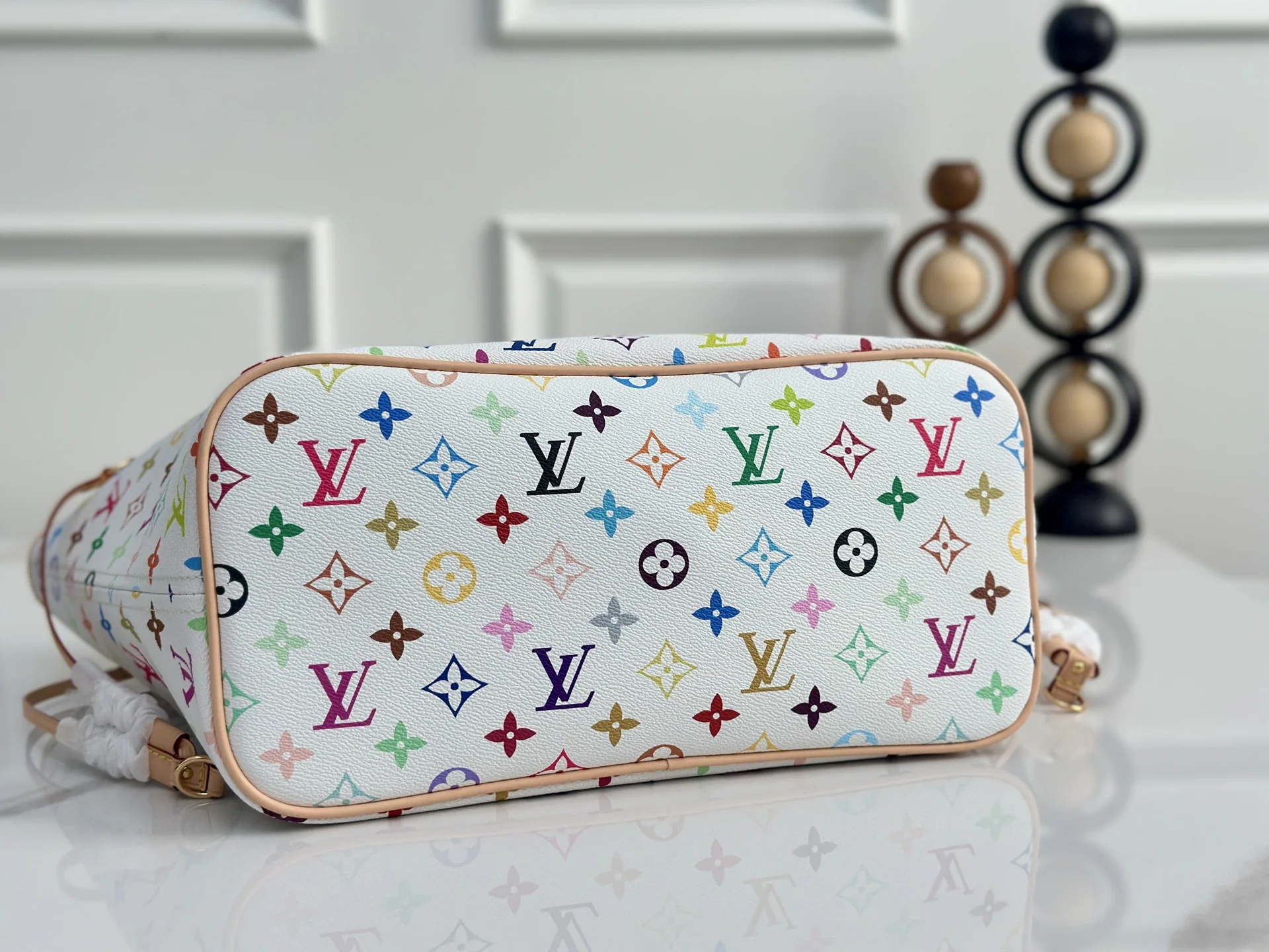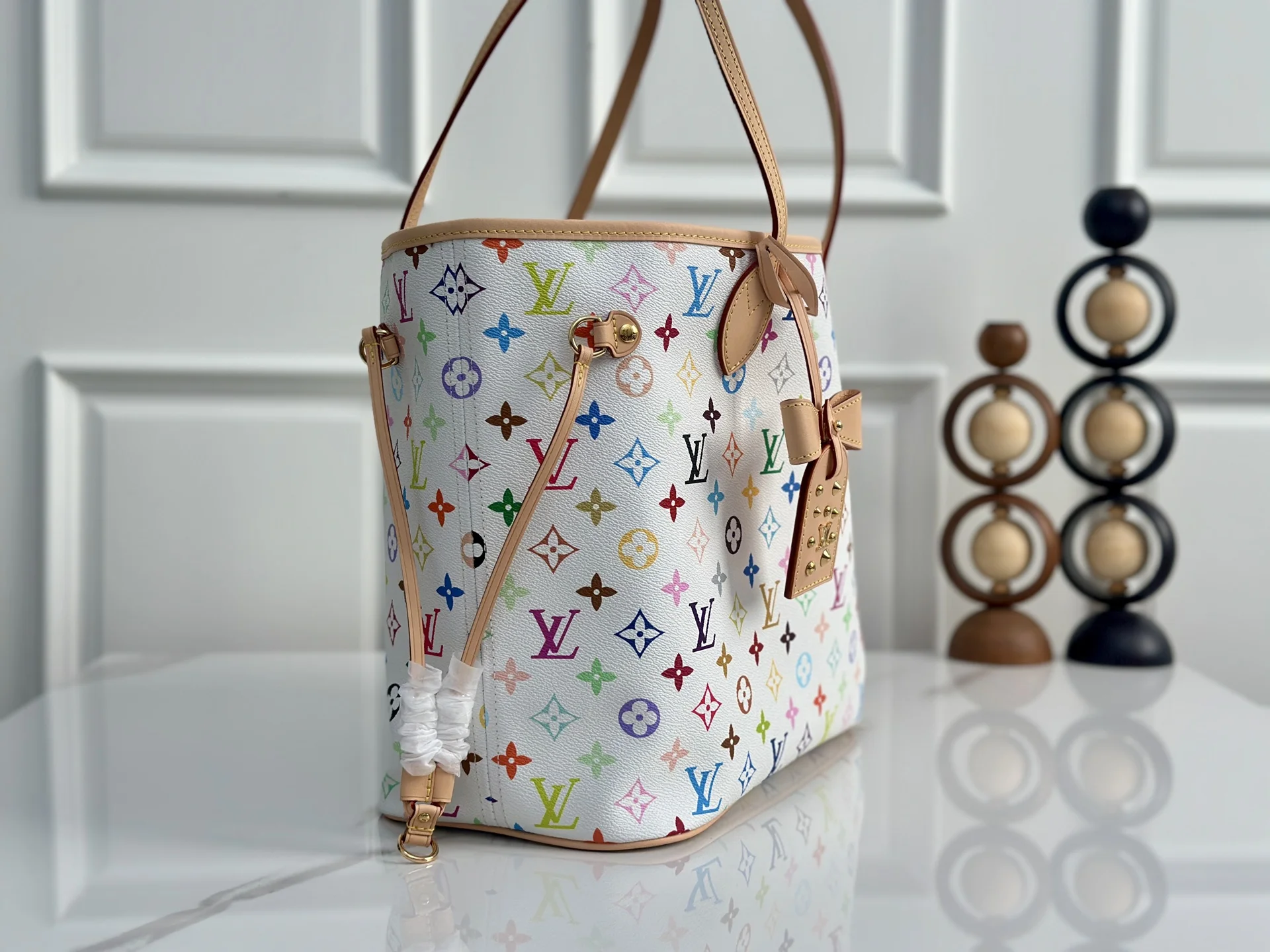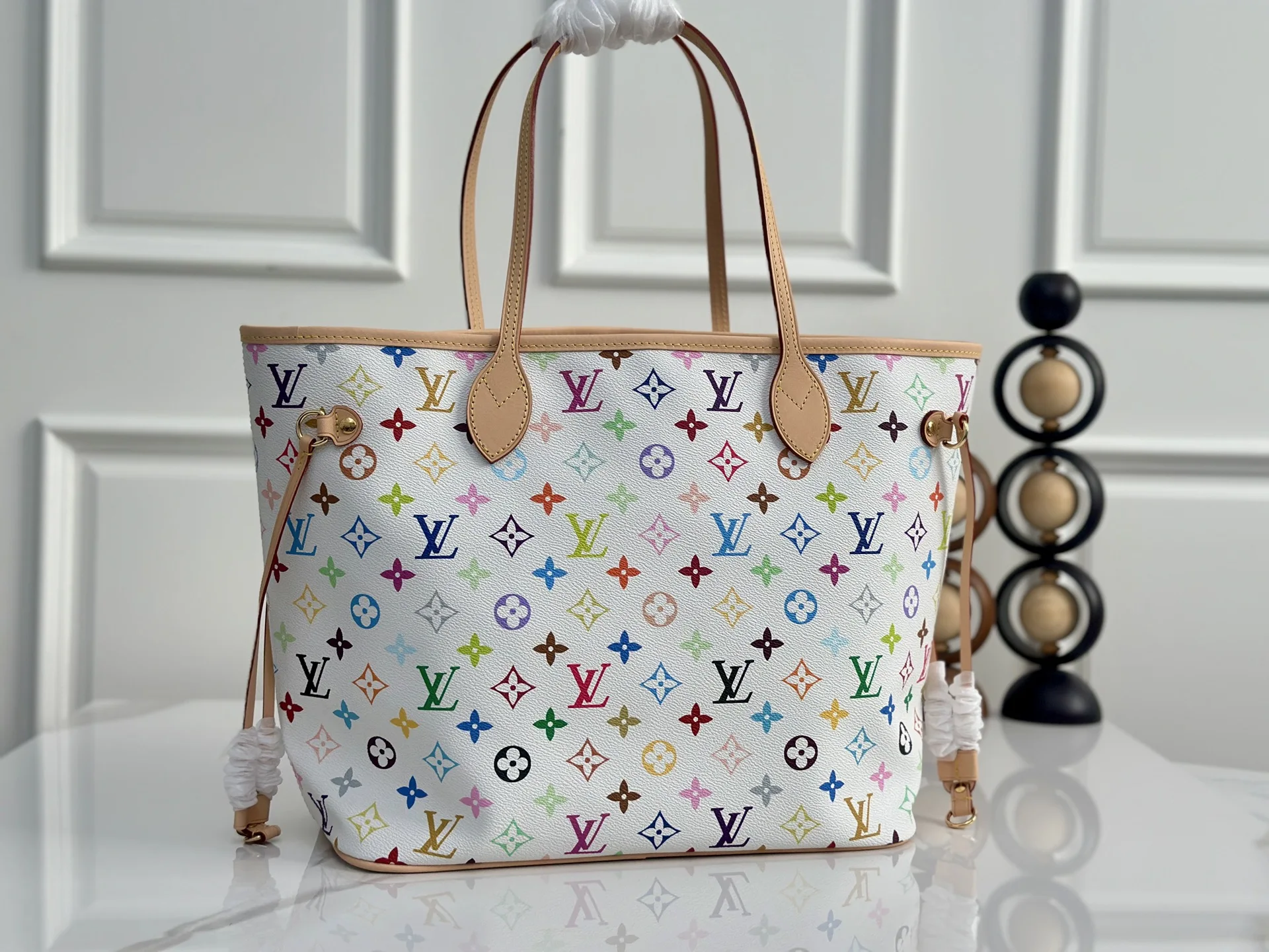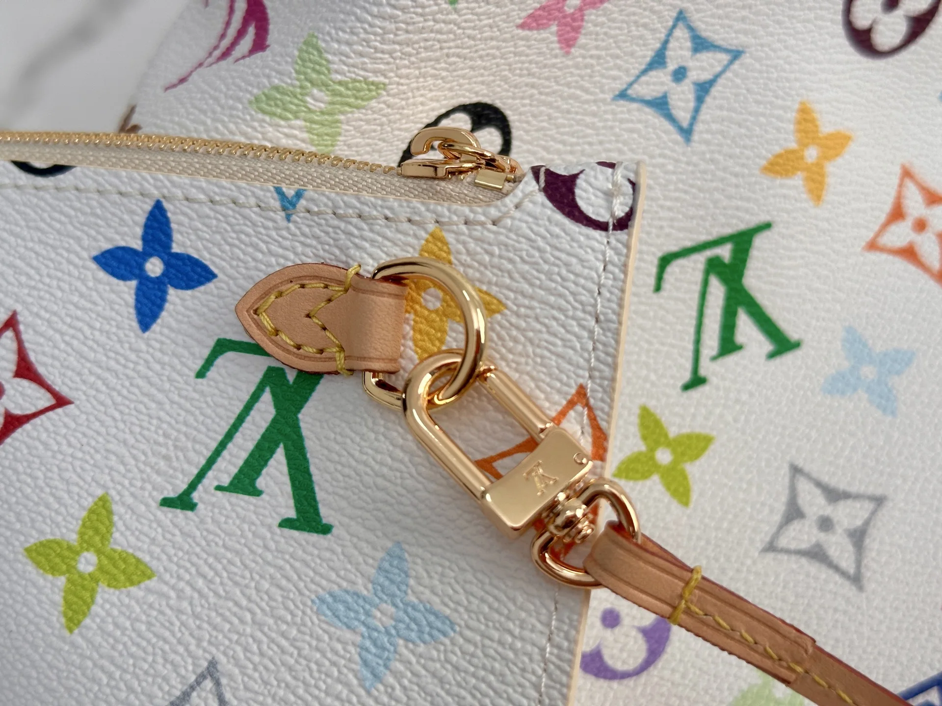 本款 Neverfull 中号手袋取材出自路易威登 x 村上隆再版系列 选用缤纷 Monogram 涂层帆布塑造精巧构型 以日本艺术家村上隆的灵动风格巧妙重绎品牌经典素 托特包为两侧饰带无论束紧或舒展 均可展现别样风采 纤细手柄方便肩背或肘挎 可拆卸拉链袋可用作手拿包或口袋 28 x 14 x 31 厘米