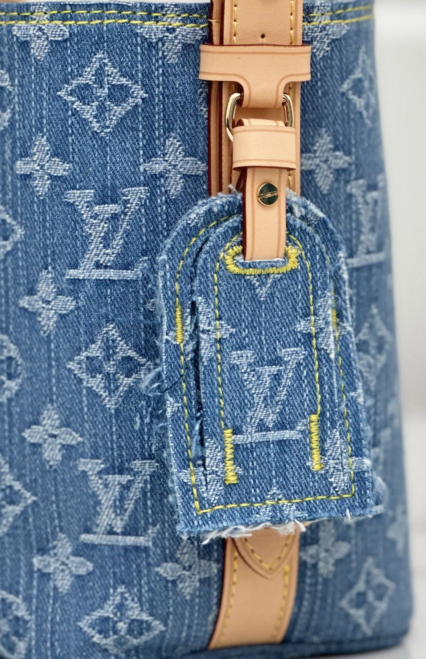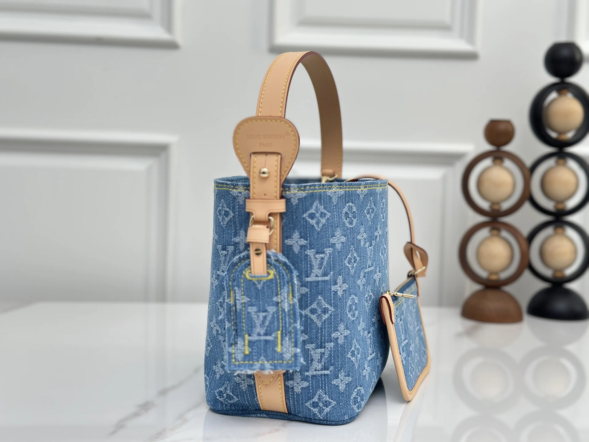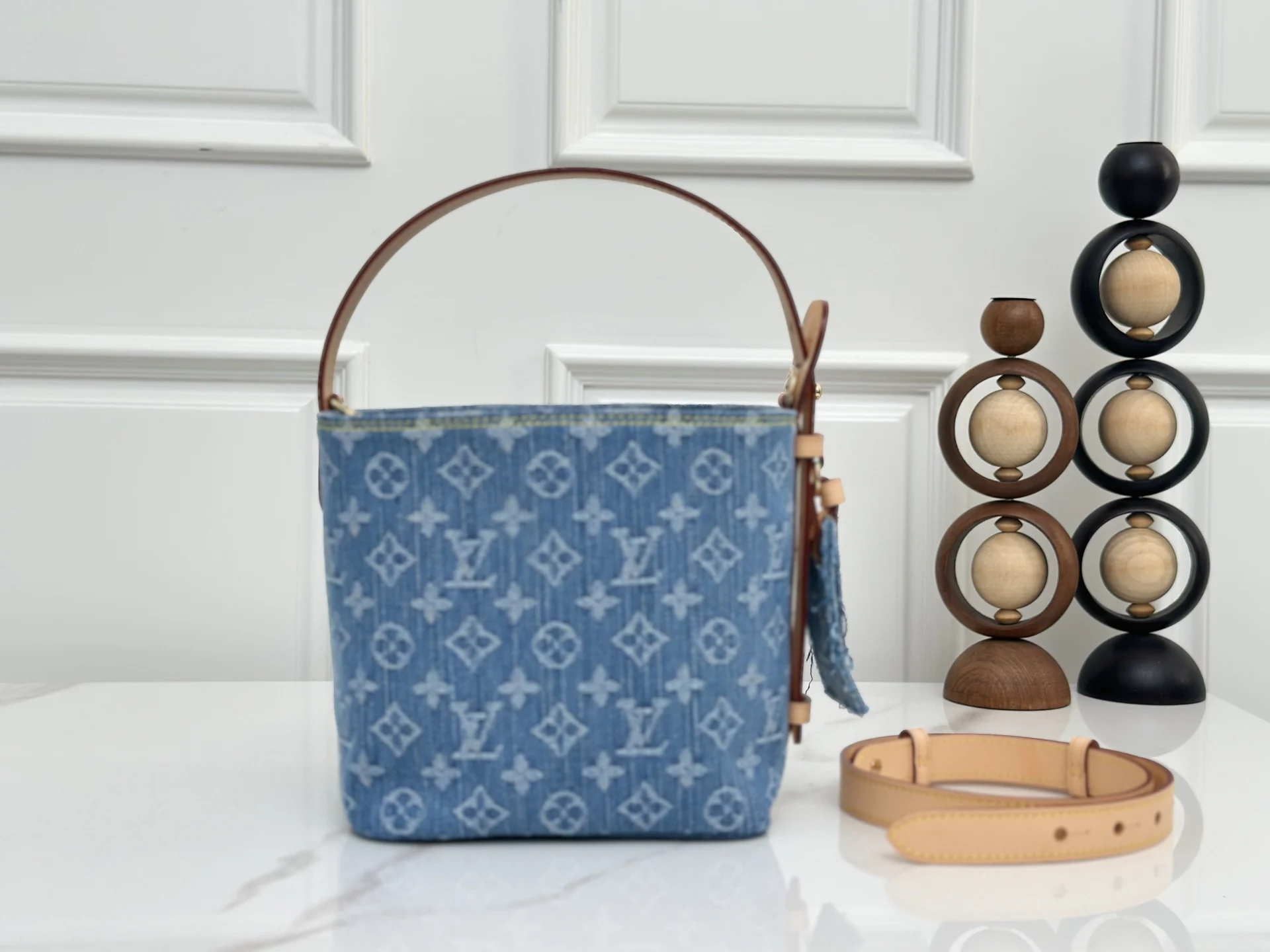 M28107牛仔 丹宁牛仔水桶包 ALL IN BB 手袋 All In BB 手袋取材丹宁布焕新呈现 为 Denim Rendez-Vous 系列添注现代洒脱气息 水桶包构型巧搭撞色皮革饰边与标志性 LV 名牌 致意路易威登典藏硬箱 百搭设计实现多种背携方式 可拆卸拉链内袋增添实用巧思 16 x 18 x 12 厘米(长度 x 高 x 宽)