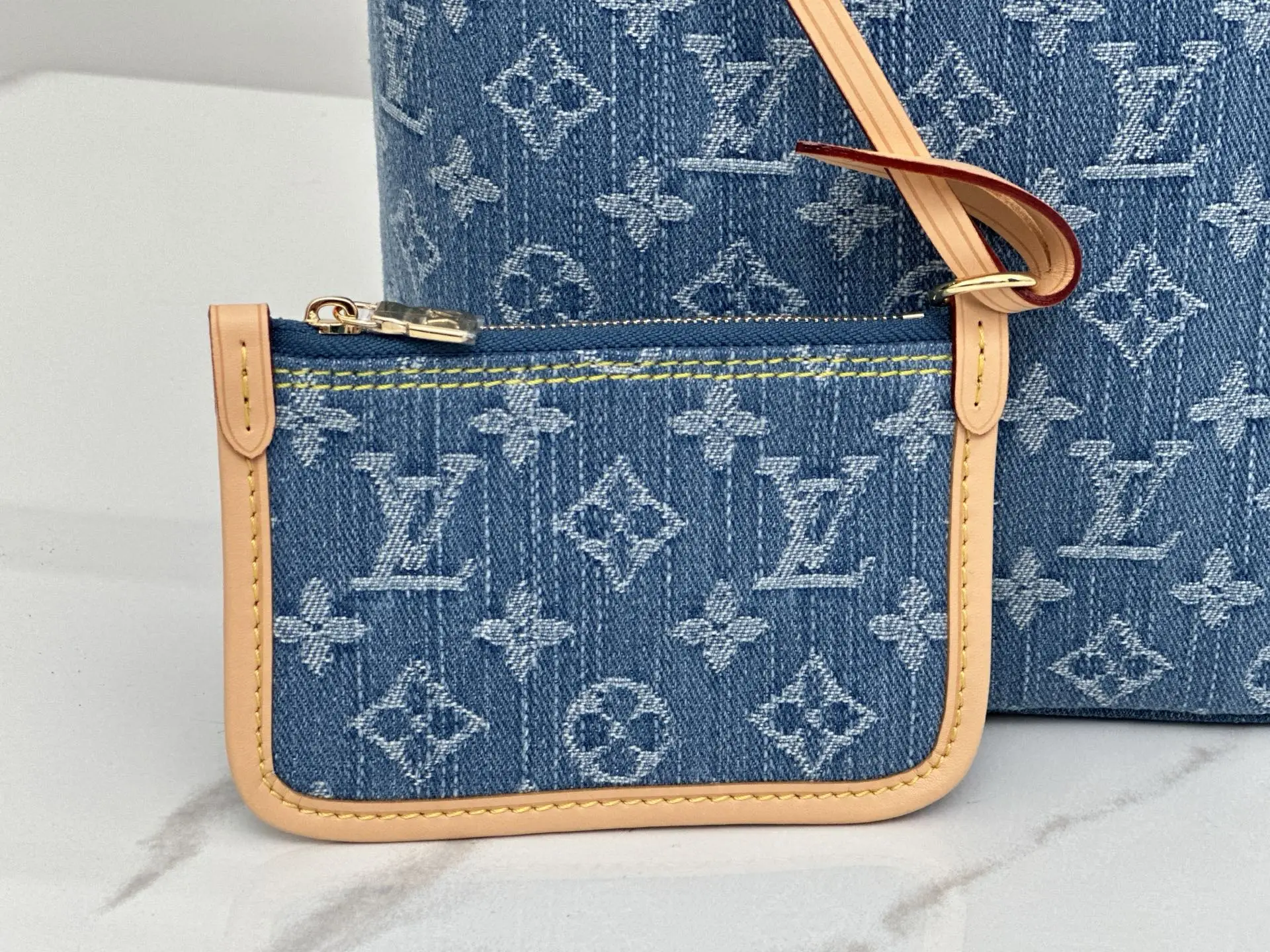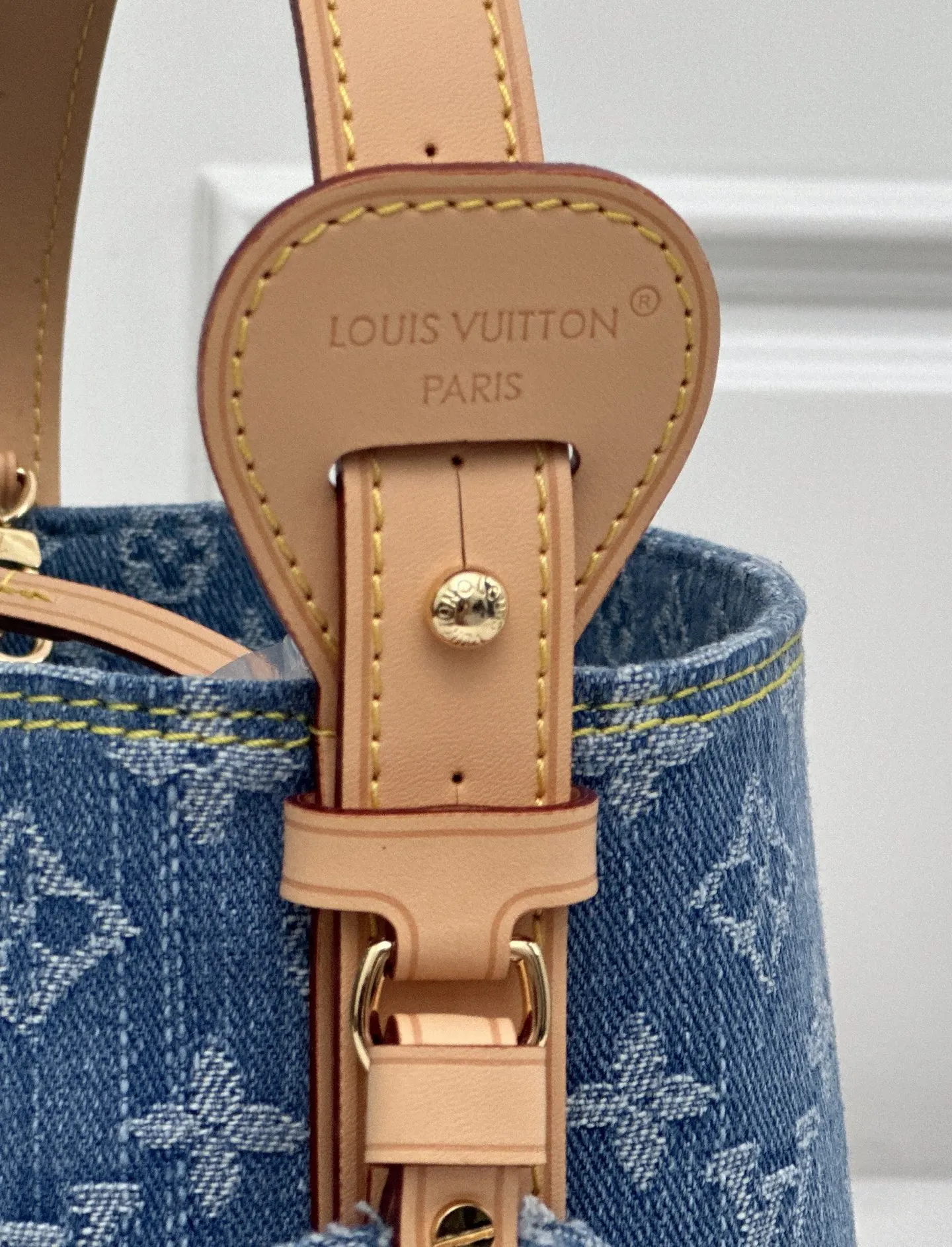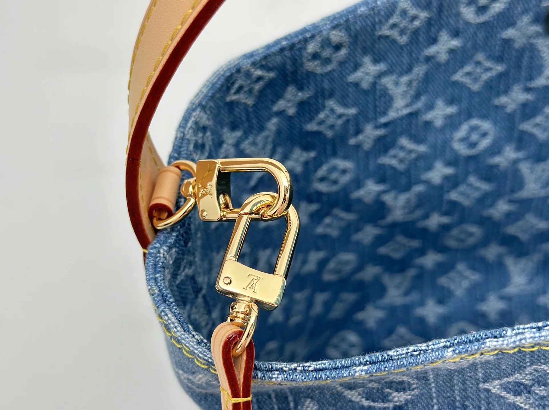 M28107牛仔 丹宁牛仔水桶包 ALL IN BB 手袋 All In BB 手袋取材丹宁布焕新呈现 为 Denim Rendez-Vous 系列添注现代洒脱气息 水桶包构型巧搭撞色皮革饰边与标志性 LV 名牌 致意路易威登典藏硬箱 百搭设计实现多种背携方式 可拆卸拉链内袋增添实用巧思 16 x 18 x 12 厘米(长度 x 高 x 宽)