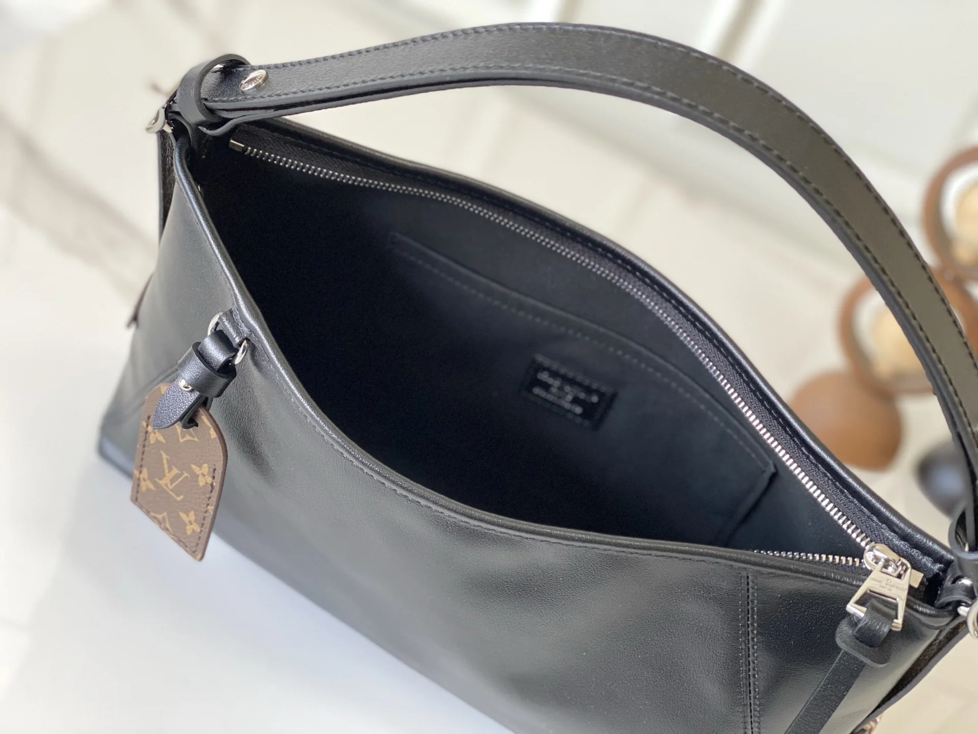 独家实拍 M28160 這款LV Vibe系列呈獻這款Carryall East West 巧妙地將經典細節與現代廓形融為一體 袋身以柔軟小羊皮精心打造 配以標誌性Monogram圖案飾邊 並附有向品牌致敬的經典硬箱行李吊牌 寬敞容量足以收納日常所需 袋身設有可拆式肩帶 可作斜孭 單肩或手提攜帶 展現非凡品味 36 x 19 x 10 厘米 (長度 x 高度 x 闊度)