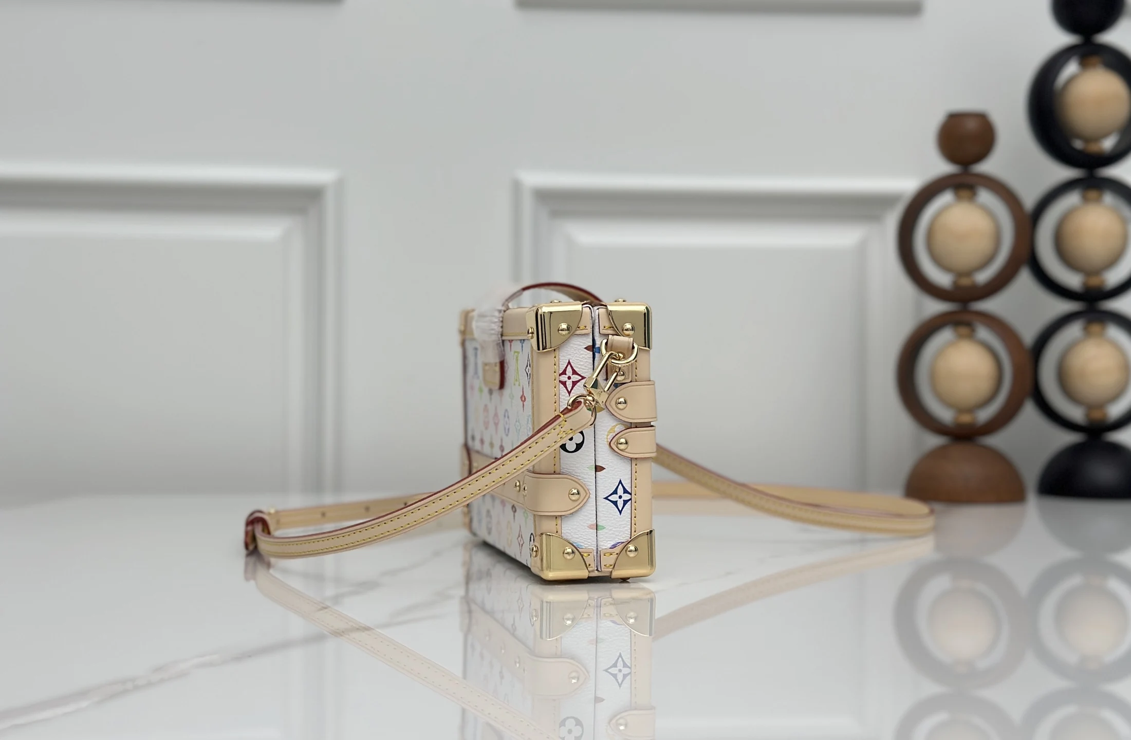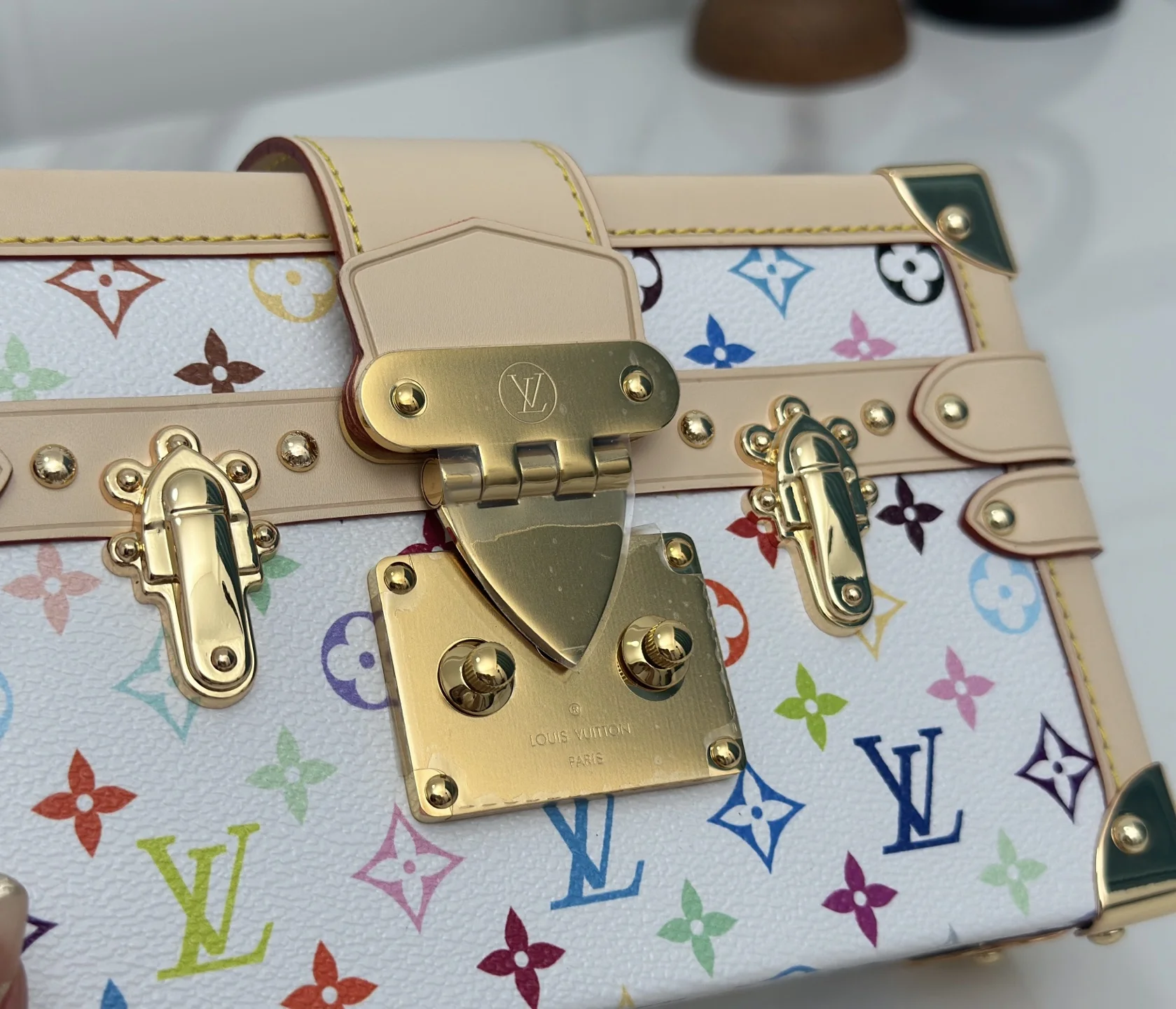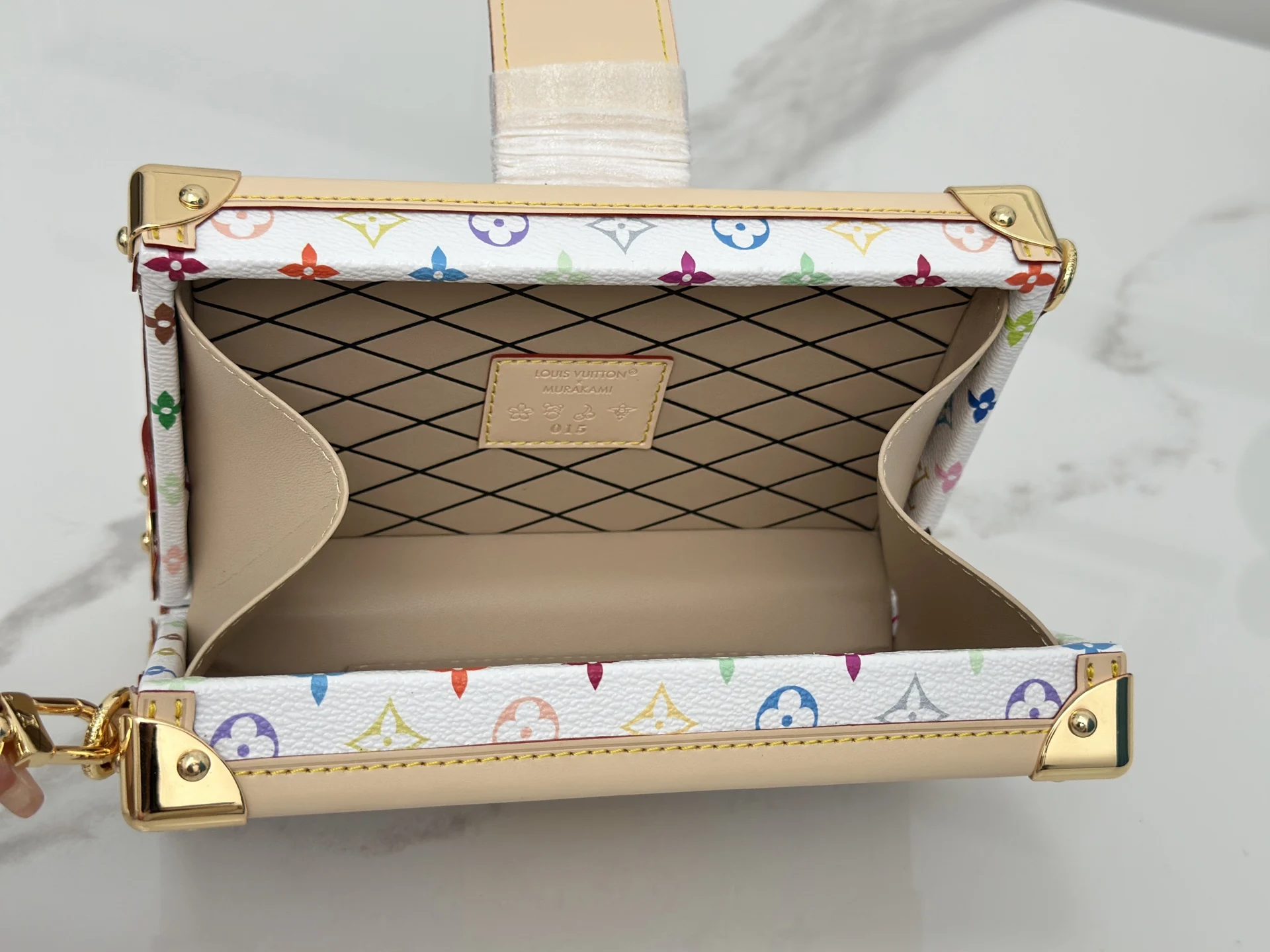 M28243白彩 村上隆硬盒子包 当季新款 PETITE MALLE 手袋 经典 Petite Malle 手袋加入路易威登 Monogram 图案问世 130 周年的庆贺之列 为 Monogram 帆布染上鲜明色彩 搭配行李箱风格包角和传统 S-lock 锁扣等标志性细节 内部标签点明庆贺系列身份 系上长肩带即可斜挎 12.5 x 6 x 20 厘米(高 x 宽 x 长度)