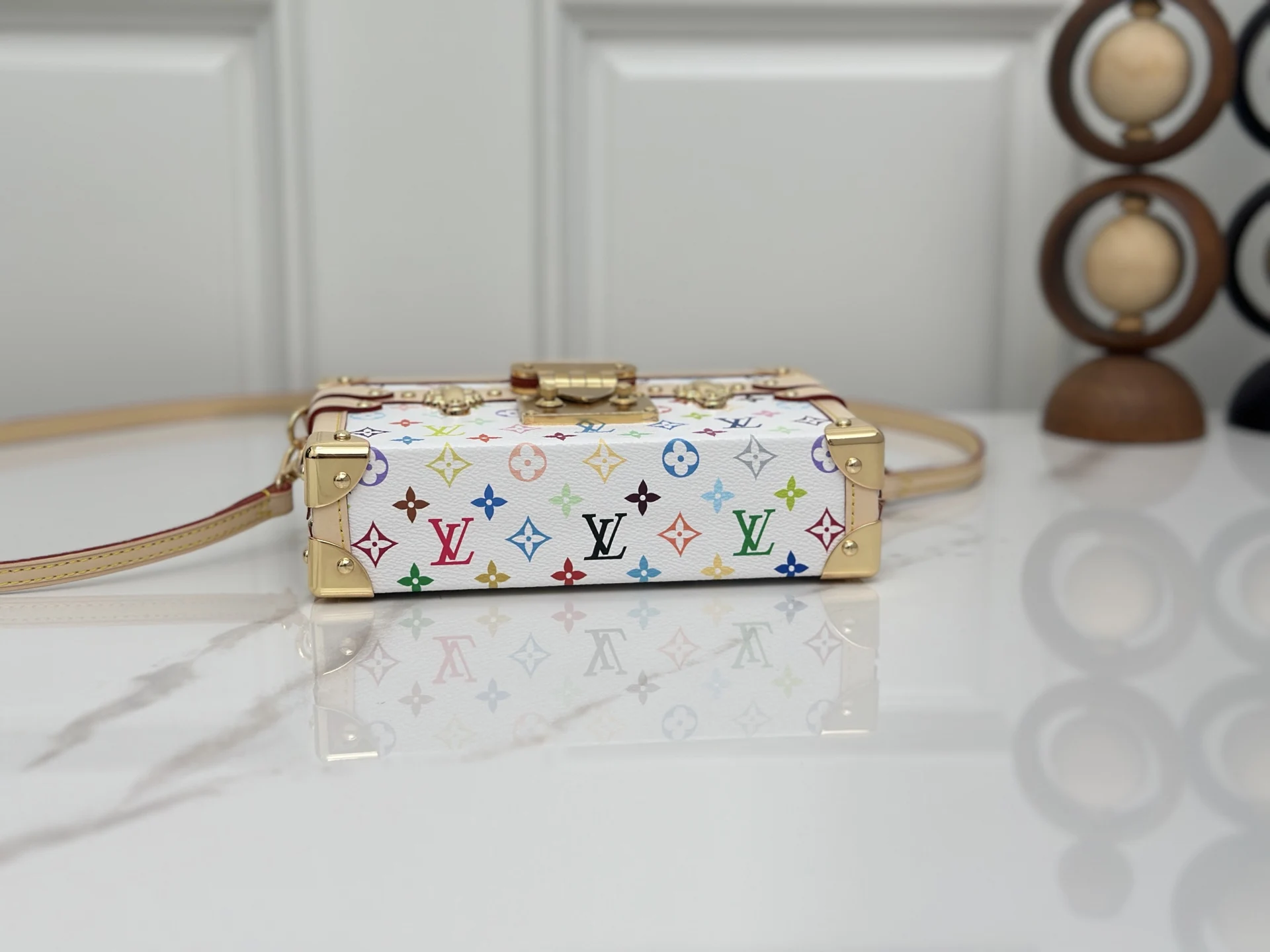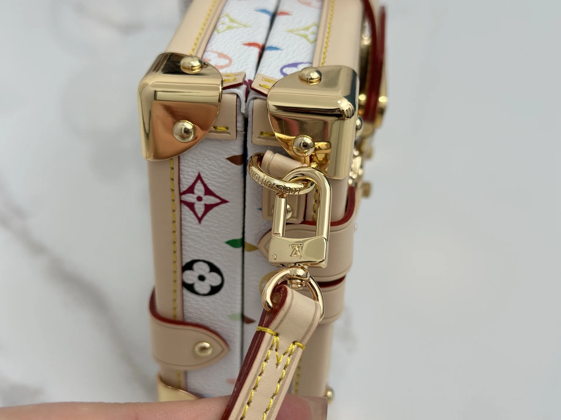 M28243白彩 村上隆硬盒子包 当季新款 PETITE MALLE 手袋 经典 Petite Malle 手袋加入路易威登 Monogram 图案问世 130 周年的庆贺之列 为 Monogram 帆布染上鲜明色彩 搭配行李箱风格包角和传统 S-lock 锁扣等标志性细节 内部标签点明庆贺系列身份 系上长肩带即可斜挎 12.5 x 6 x 20 厘米(高 x 宽 x 长度)