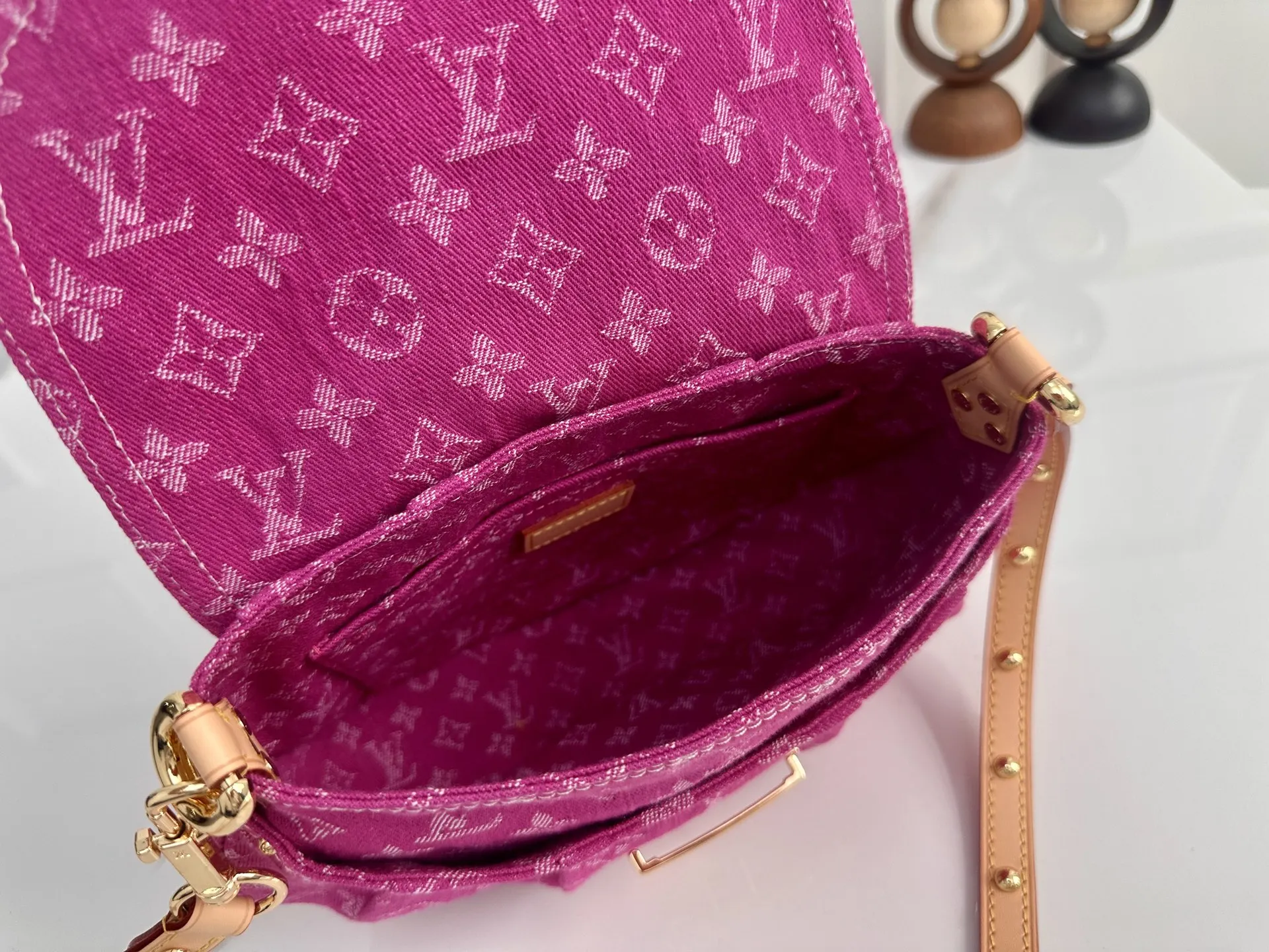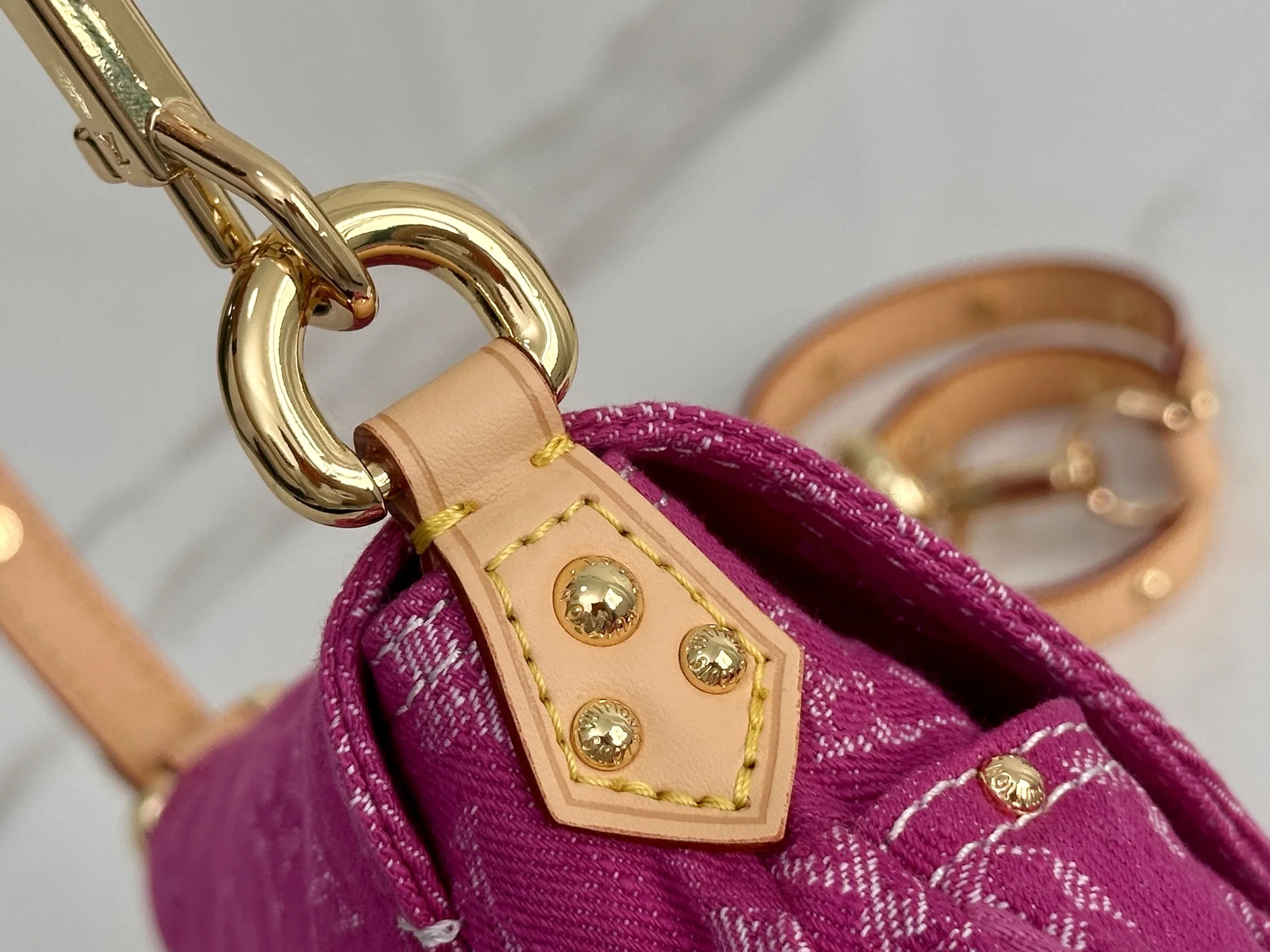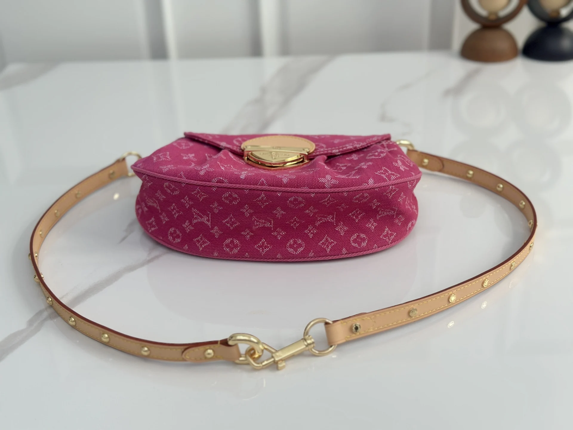 M28291本款 Rendez-Vous 系列 Sunset 手袋演绎当代风尚 鲜亮的丹宁布包身缀饰金属件 呼应当季色调 醒目插扣为百搭设计点睛 斜挎 肩背或手提皆宜 随心演绎多样风格 包带半长 23.0 厘米