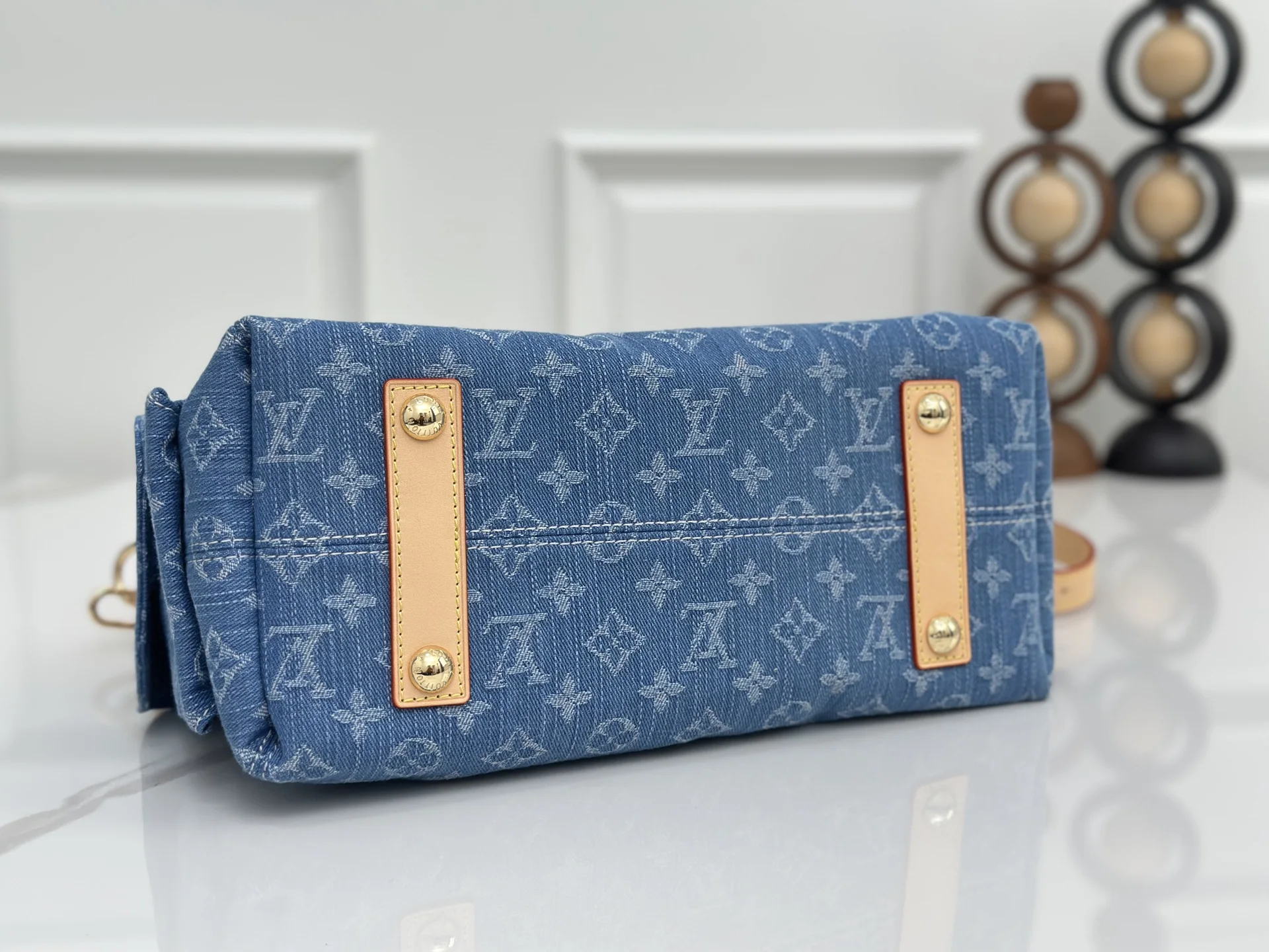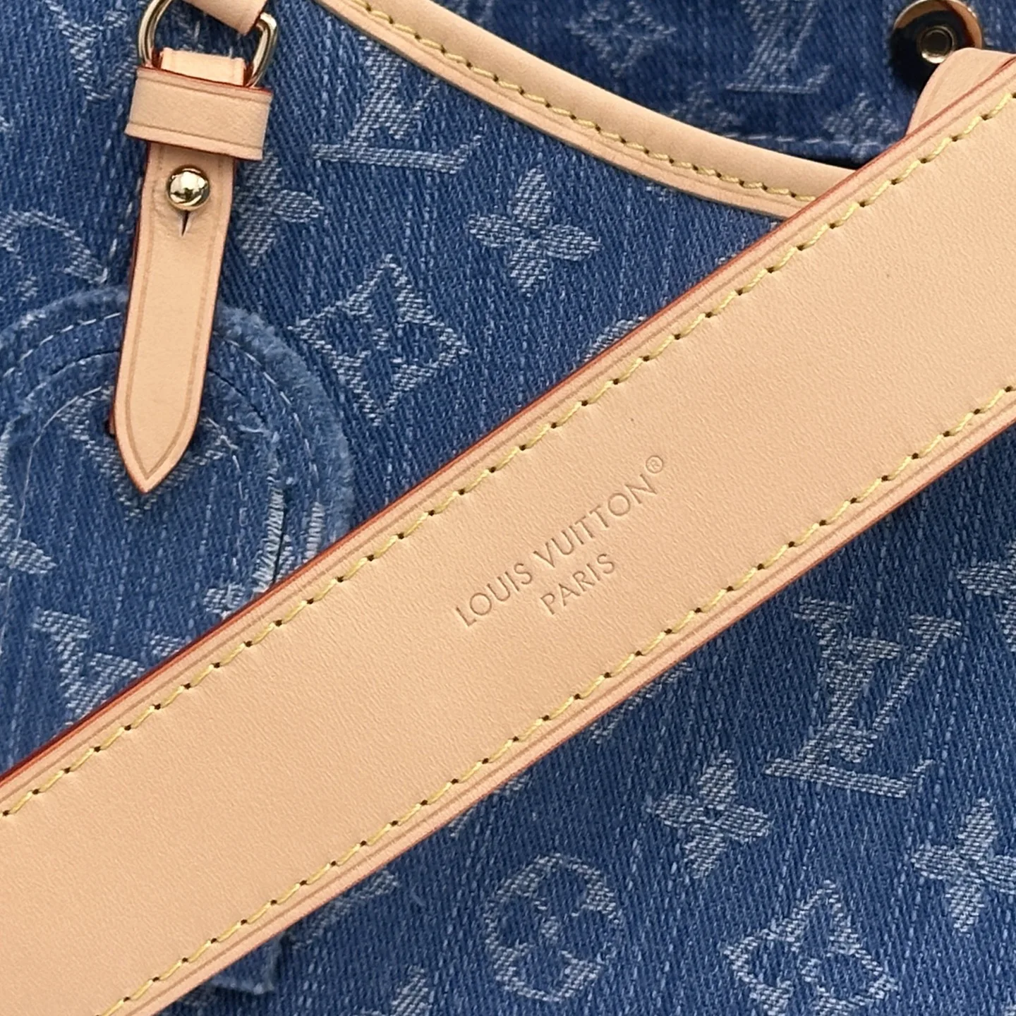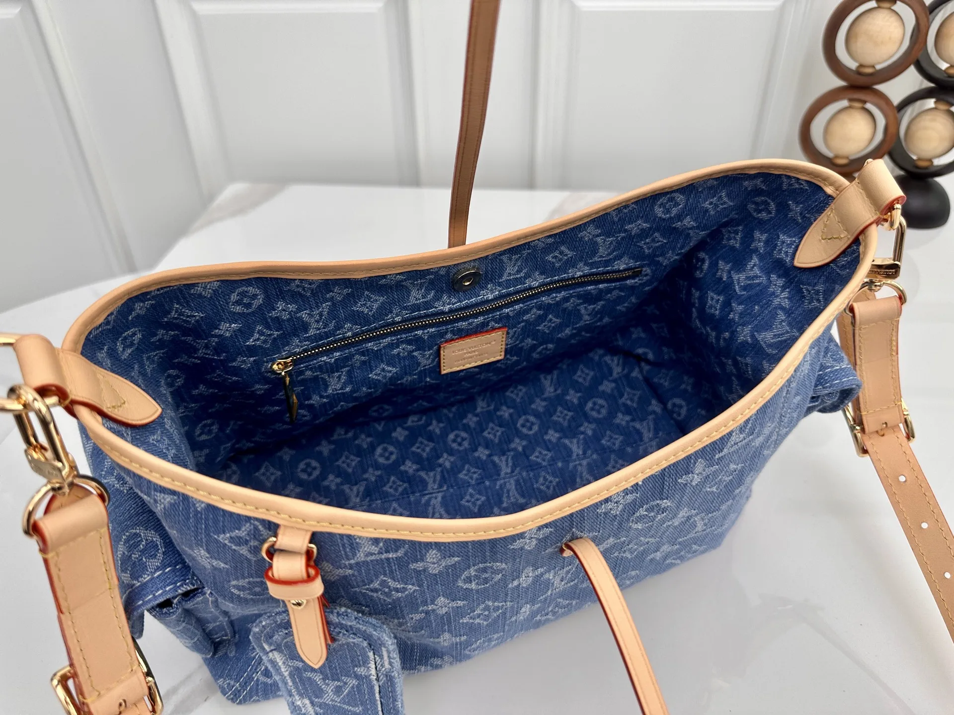 顶级原单 163动态芯片 M28287蓝色 丹宁牛仔购物袋 Carryall Cargo 小号手袋 出自 Denim Rendez-Vous 系列 汲取应季灵感 演绎隽永风格 棉质包身搭载撞色皮革饰边与束带细节 此手袋缀饰金属件与标志性名牌 致敬路易威登制箱工艺传统 斜挎 肩背 手提皆宜 随心转换造型 尺寸 33.5 x 23 x 15 厘米