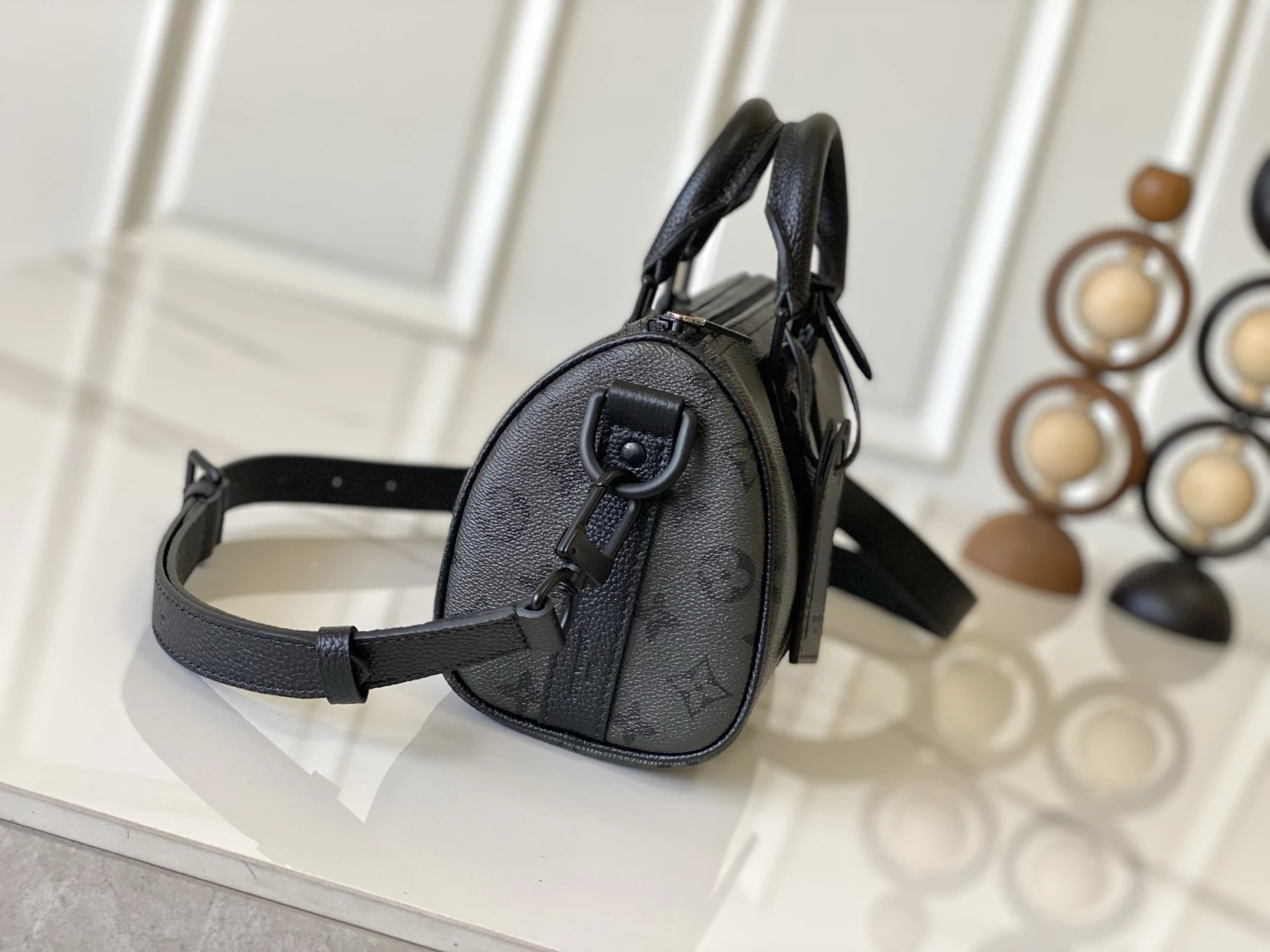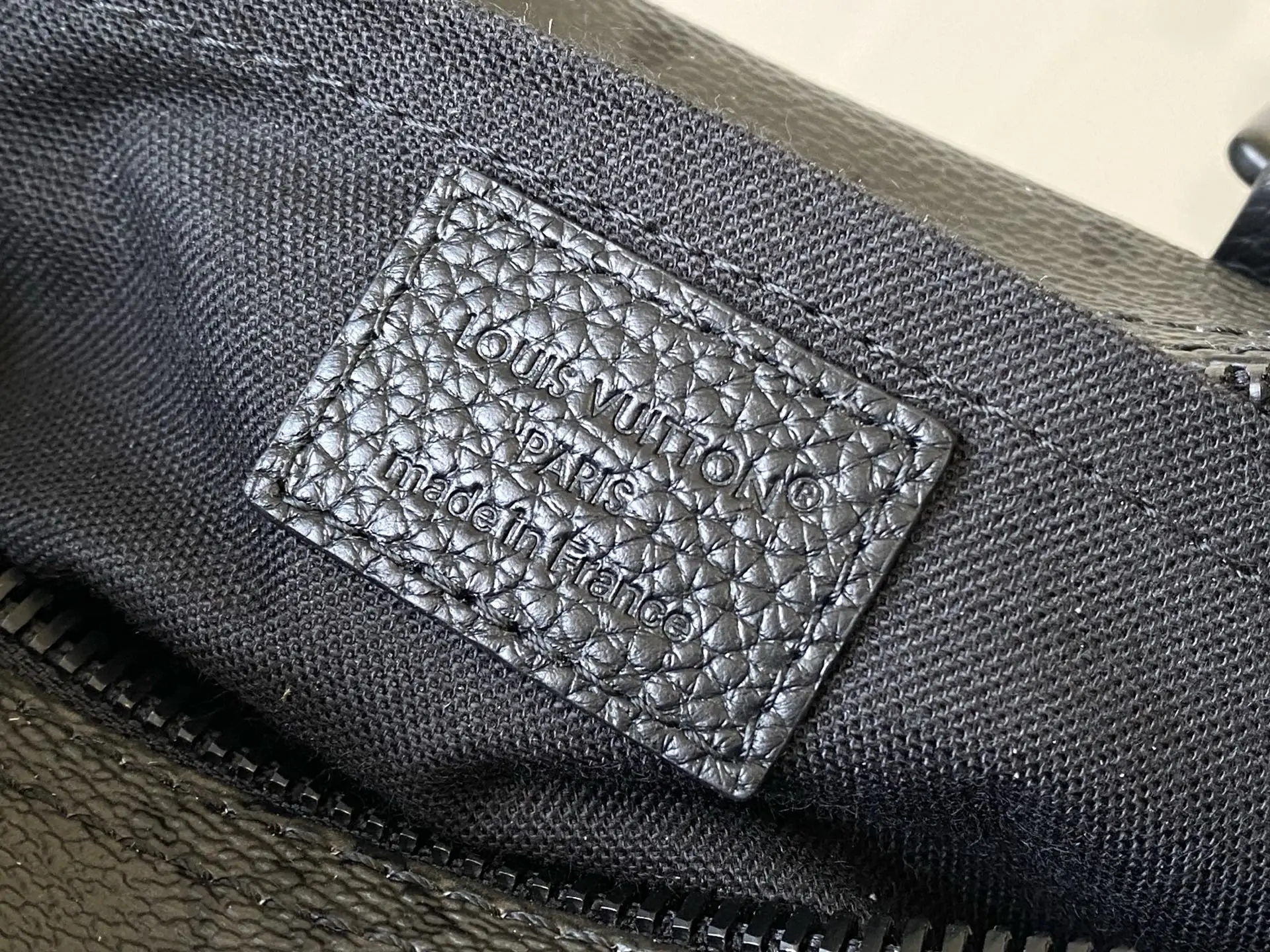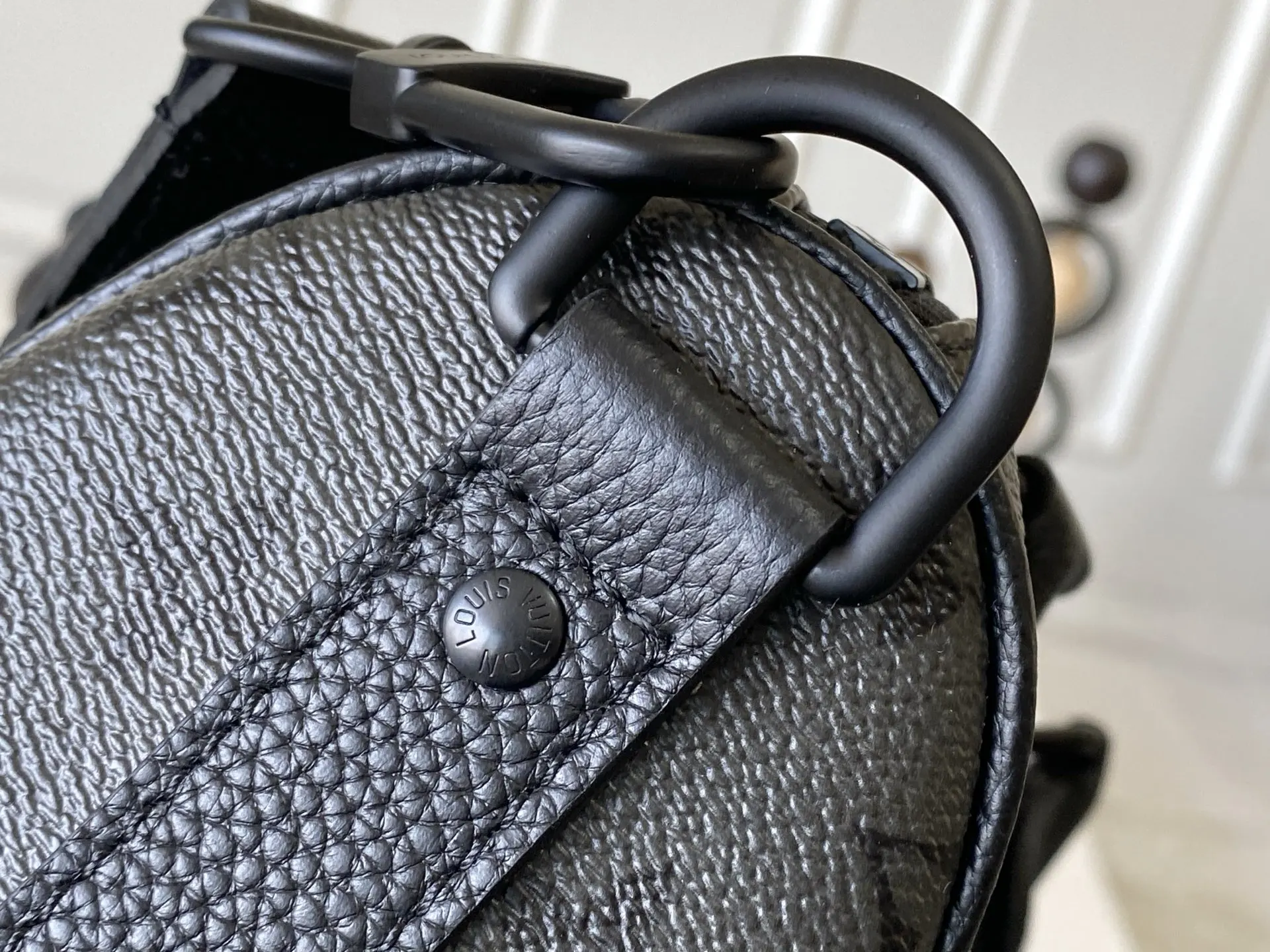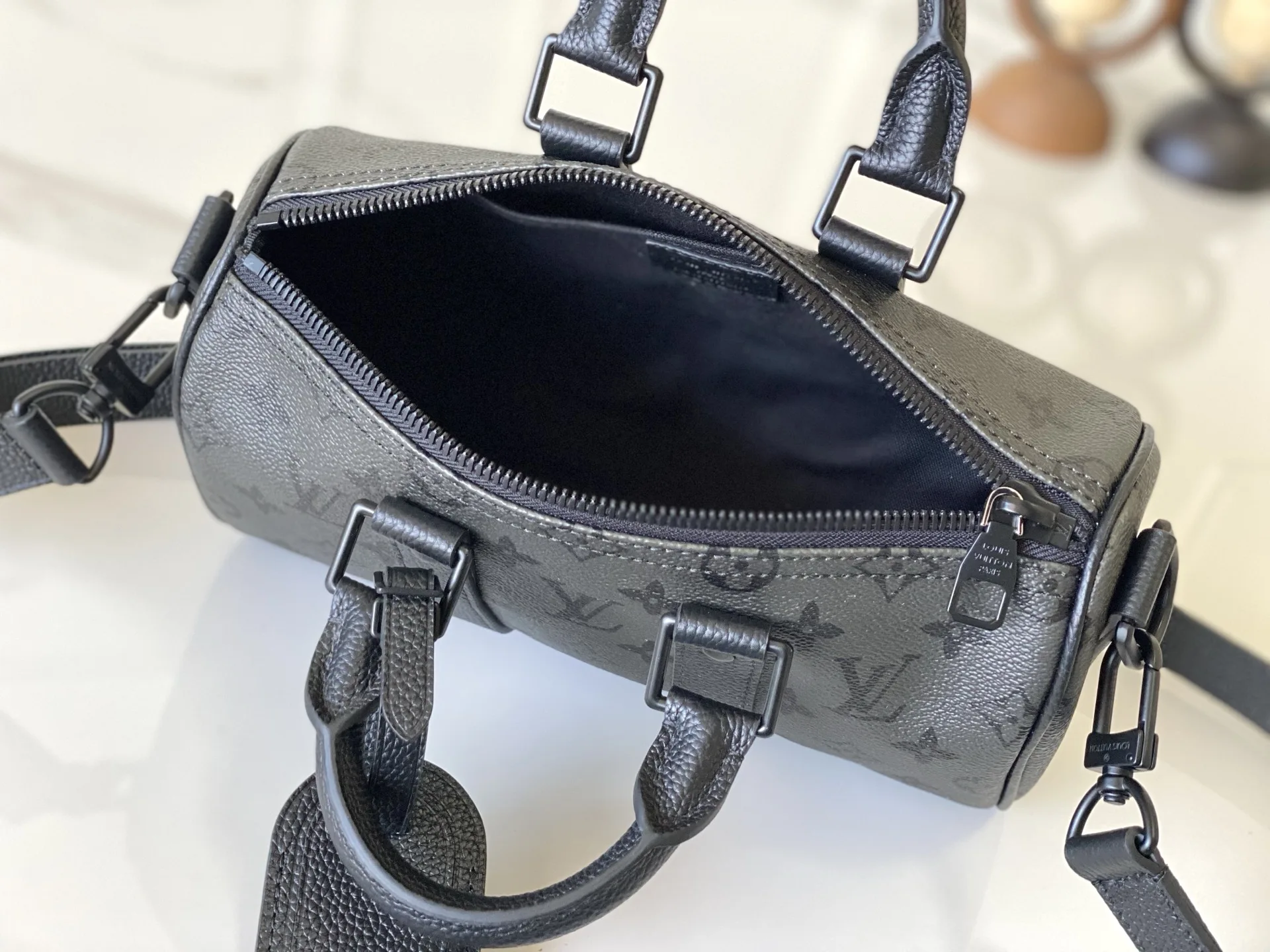 独家实拍 M28369 本款 Keepall Bandouliere 25 手袋为 Monogram Midnight 涂层帆布点缀深邃 Monogram 印花 张扬自信风范 精巧都市构型搭配皮革饰边和哑光拉链 顶部手柄与宽幅可拆卸并调节的织物肩带实现舒适斜跨与手提