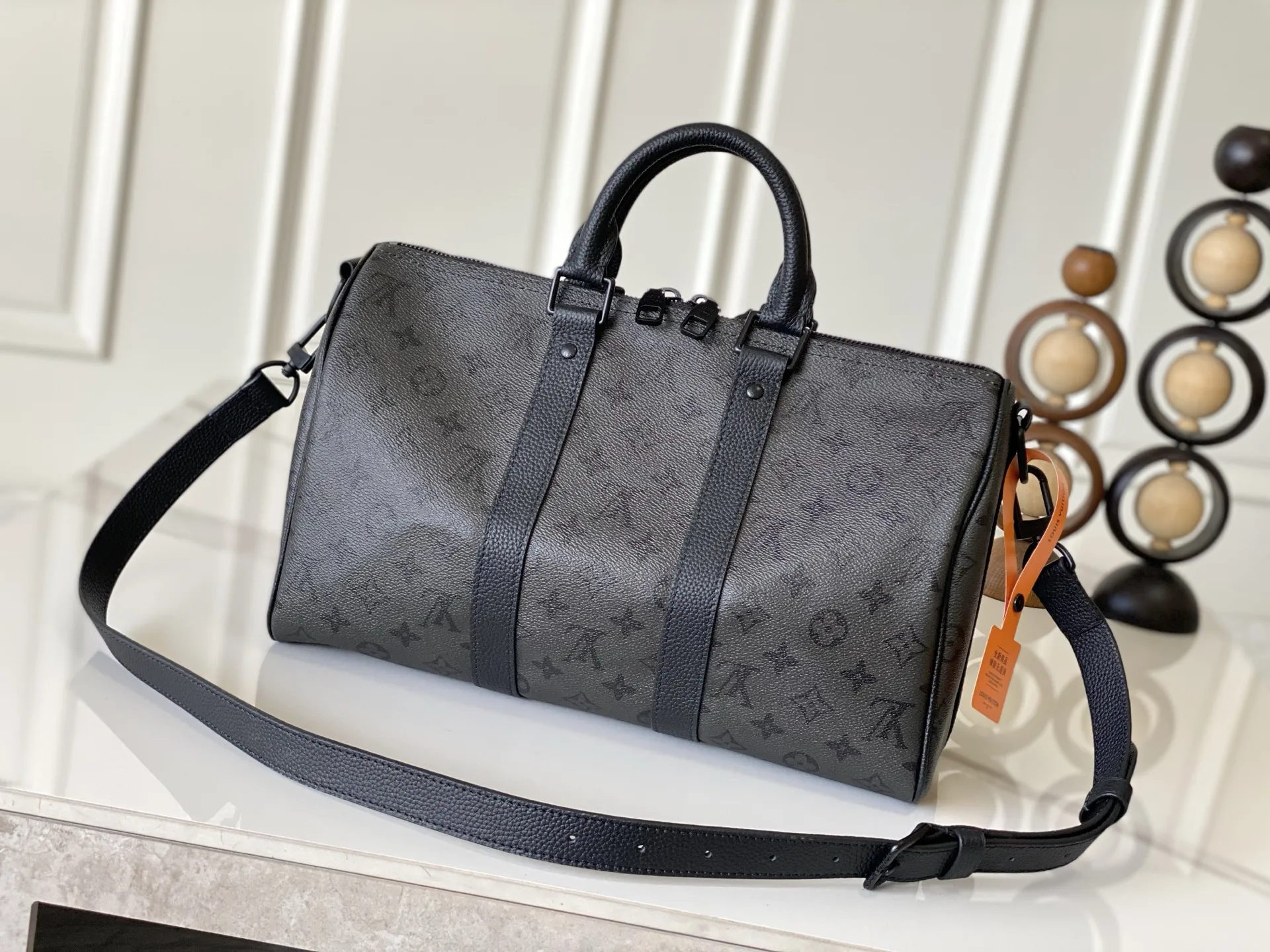 男包speefy枕头包 KEEPALL BANDOULIERE 35 手袋 本款 Keepall Bandouliere 35 手袋为 Monogram Midnight xl涂层帆布搭配沉稳皮革饰边 哑光金属件及拉链烘托利落观感 可拆卸并调节的皮革肩带实现舒适肩背或斜跨 辊压皮革顶部手柄再添手提选择 尺寸 21 x 16 x 34 厘米 (高 x 宽 x 长度)