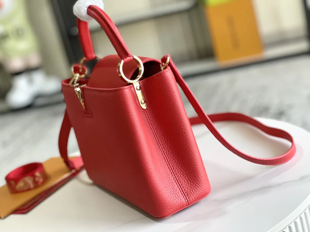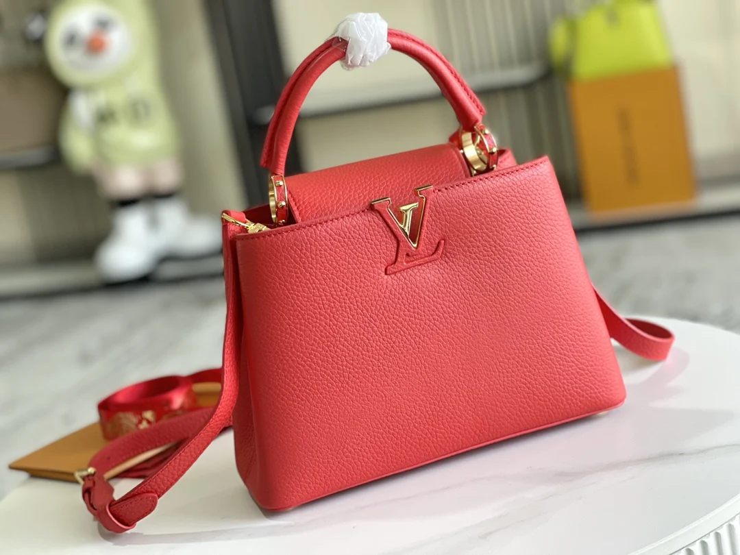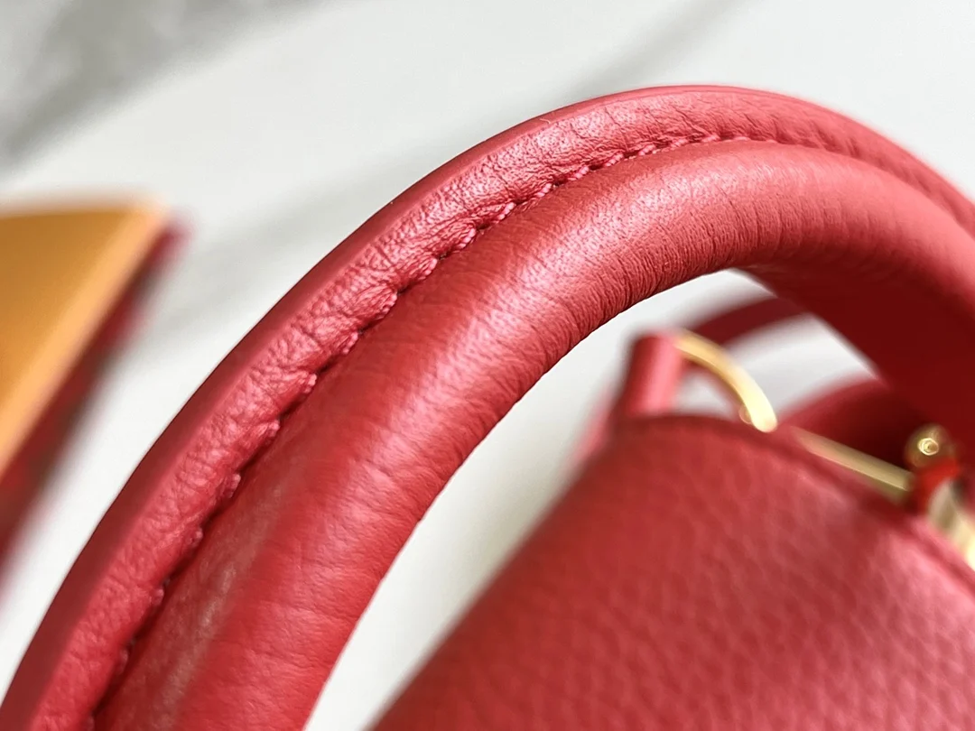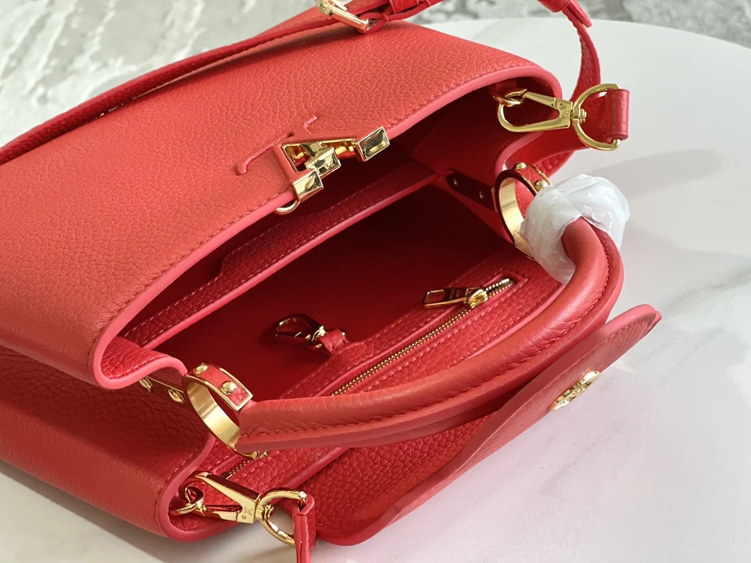 第一家路易威登门店开在巴黎的嘉布遣街上 Capucines手袋与品牌一样经久不衰 可以为任何造型带来时尚的精致感 全粒面Taurillon皮打造出一款奢华的手提包 各种传统的细节是手袋的亮点 LV首字母 独特的边环 翻盖上精细的Monogram花朵 配有顶部手柄 可脱卸包带与独特包盖 多种背携风格 适应不同造型或心情
