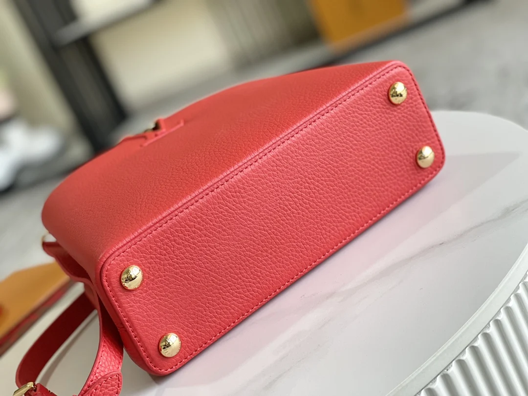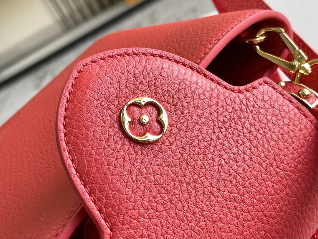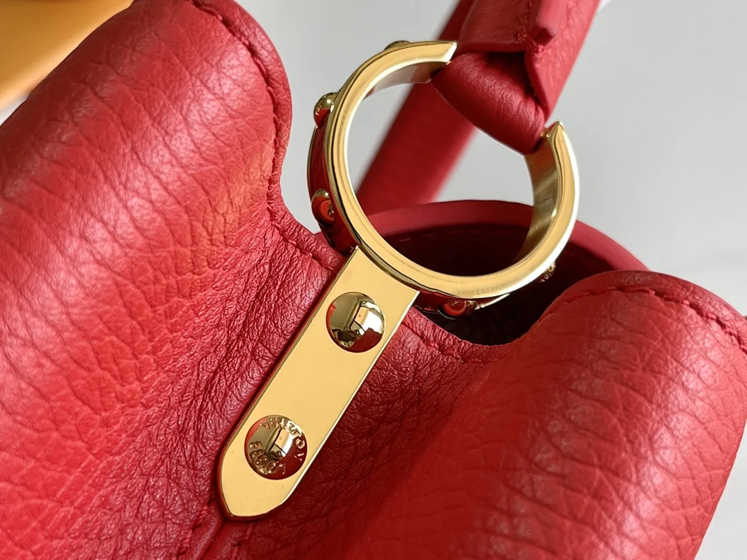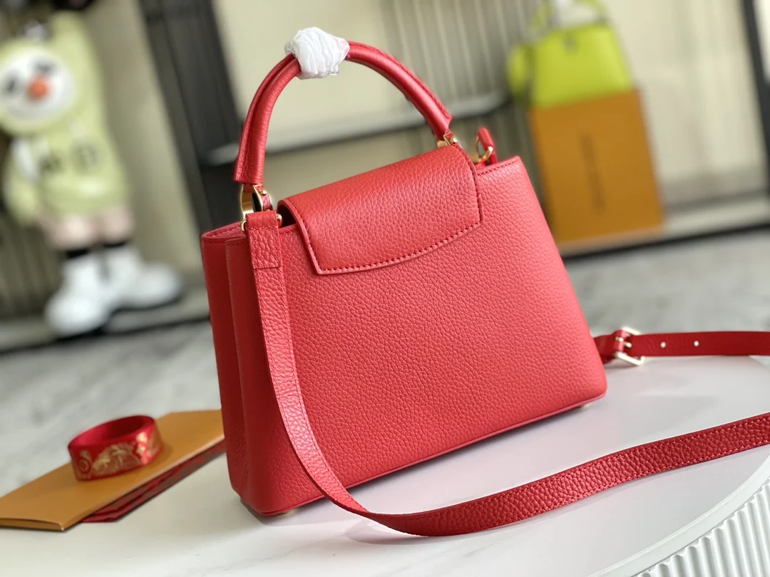 第一家路易威登门店开在巴黎的嘉布遣街上 Capucines手袋与品牌一样经久不衰 可以为任何造型带来时尚的精致感 全粒面Taurillon皮打造出一款奢华的手提包 各种传统的细节是手袋的亮点 LV首字母 独特的边环 翻盖上精细的Monogram花朵 配有顶部手柄 可脱卸包带与独特包盖 多种背携风格 适应不同造型或心情